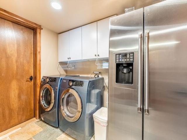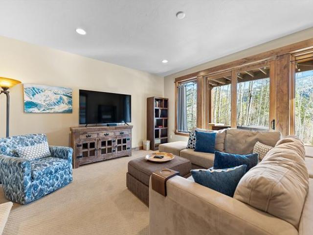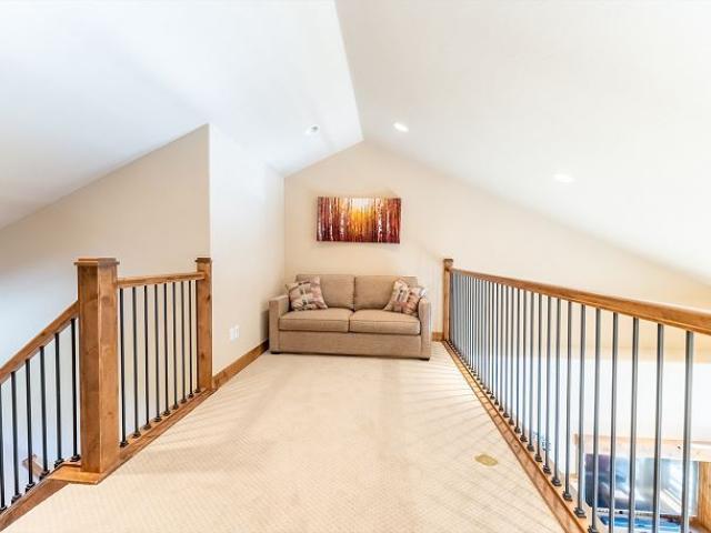 Appointed with a large sofa arranged in front of a television, the lower level family room includes access to the patio equipped with a private hot tub. Open to the living space below, the loft area is outfitted with a Queen sleeper sofa for additional sleeping accommodations. Additional amenities include garage parking, a laundry room with a second refrigerator, and a desk area just off of the living room.