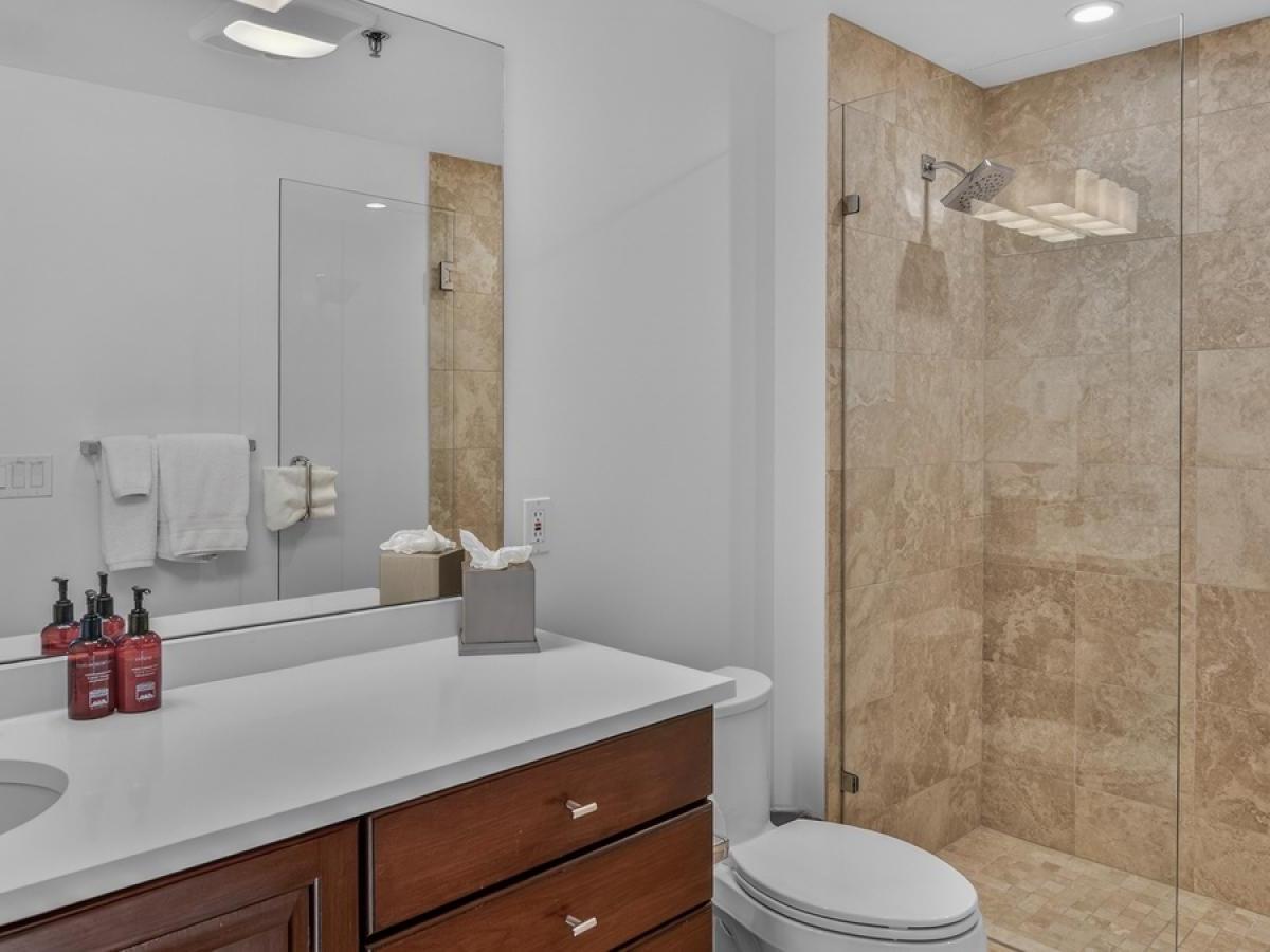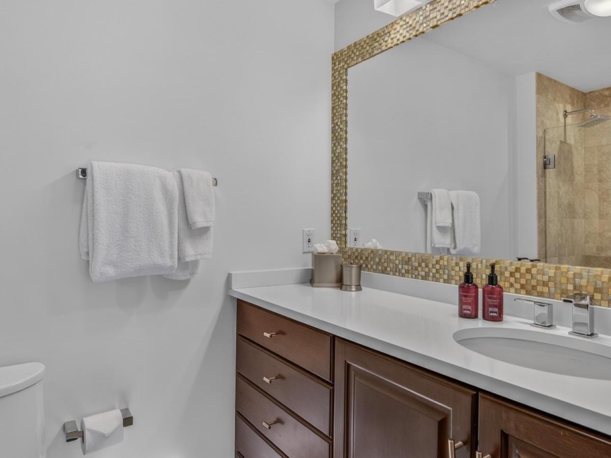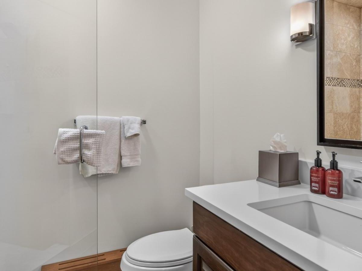 Three bedrooms, all boasting private bathrooms, are located on the third level. Furnished with a King bed, the primary suite features a luxurious bathroom with dual vanities, a jetted tub, and a steam shower. The two guest bedrooms on this level are appointed with a King bed in one and a Queen bed in the other. Located on the uppermost level of the residence is a large bedroom in a private loft area, furnished with two Twin beds and including a private bathroom.