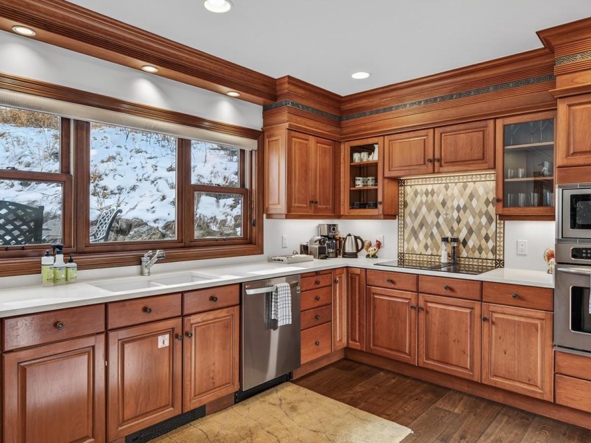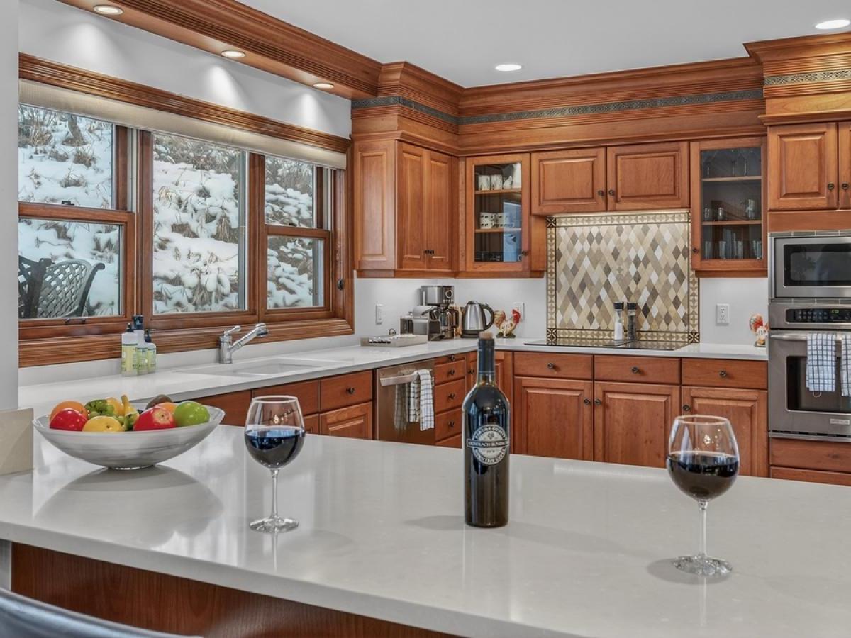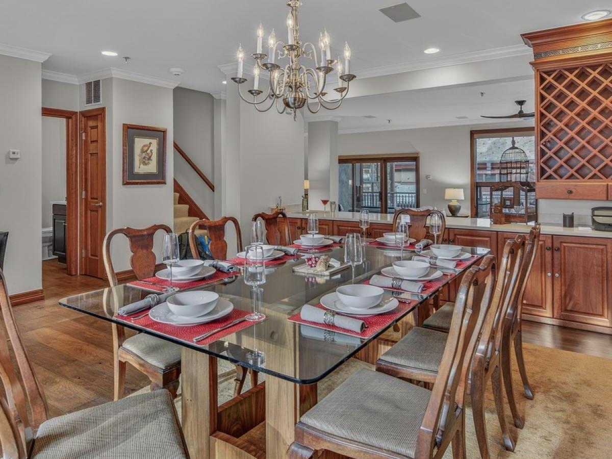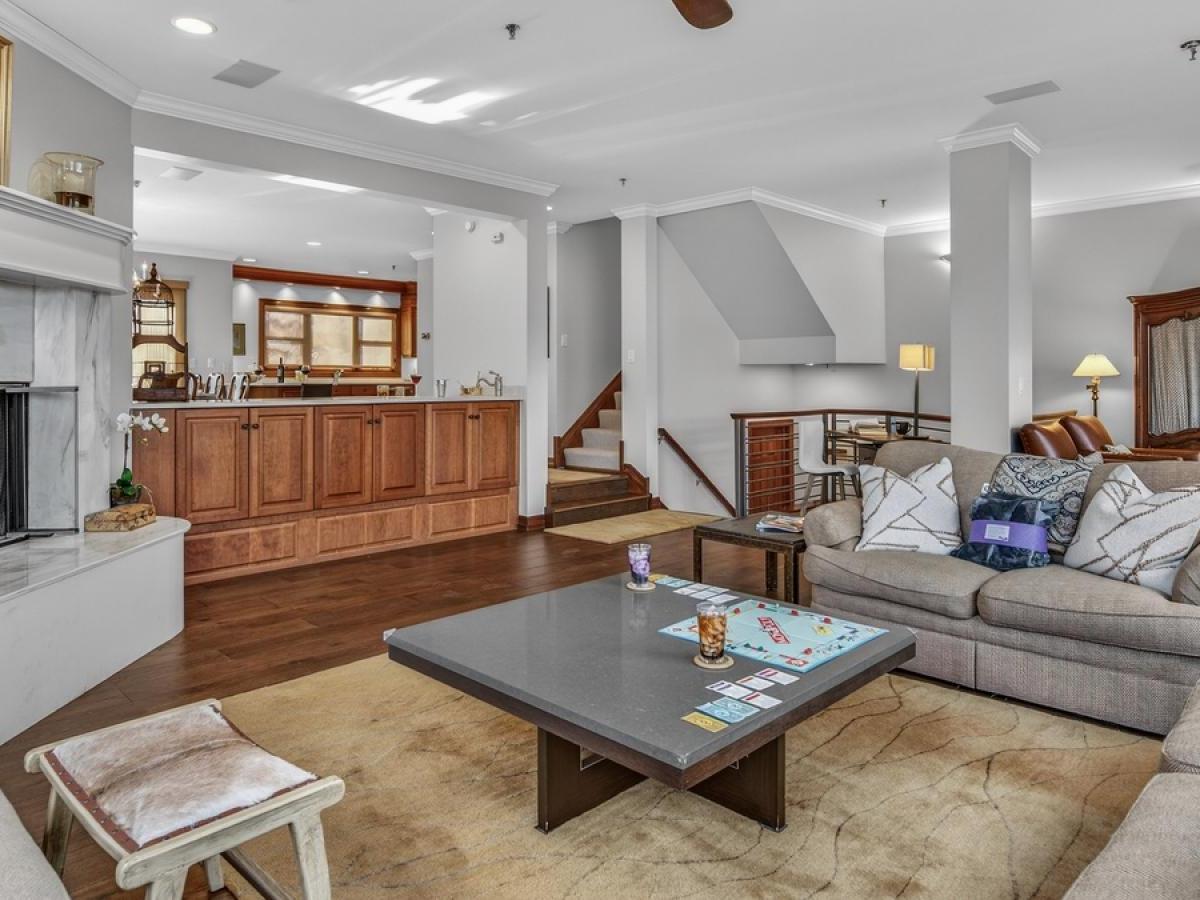 Spread over 4 levels, this 4 bedroom townhome rental with 5 bathrooms offers the perfect mix of space for entertaining as well as relaxing for groups of up to 8 guests. Occupying the main level is a spacious and open great room centered on a comfortably furnished living room with a wood-burning fireplace, desk area, and access to one of several decks. Raised a couple of steps up and overlooking the living room, the dining area accommodates 8 guests with an additional 4 seats at the adjacent breakfast bar. Equipped with stainless steel appliances and polished stone countertops, the kitchen provides all of the essentials for preparing tasty meals throughout your stay and has access to the back patio with a barbecue grill.