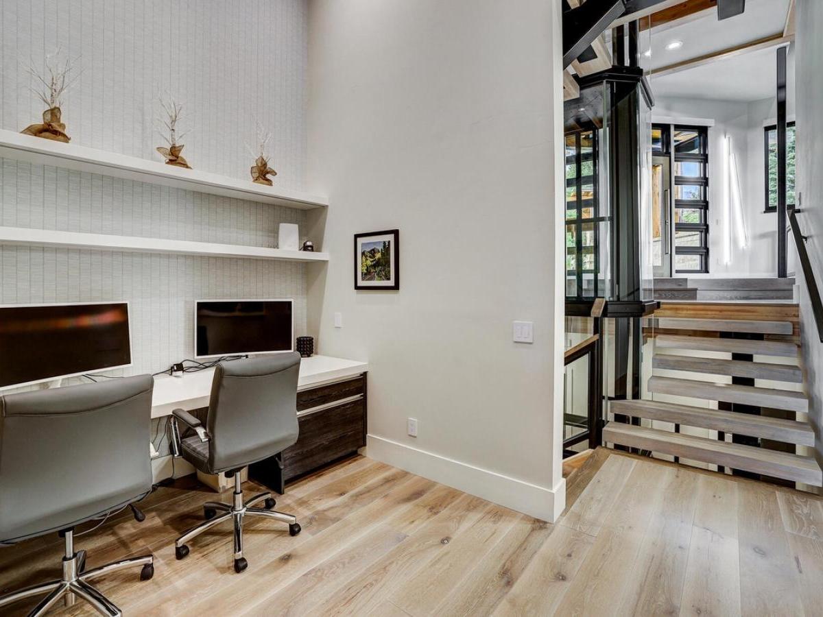 A few steps down from the main level, a dedicated office nook provides a quiet space with dual monitors for those who work as hard as they play.