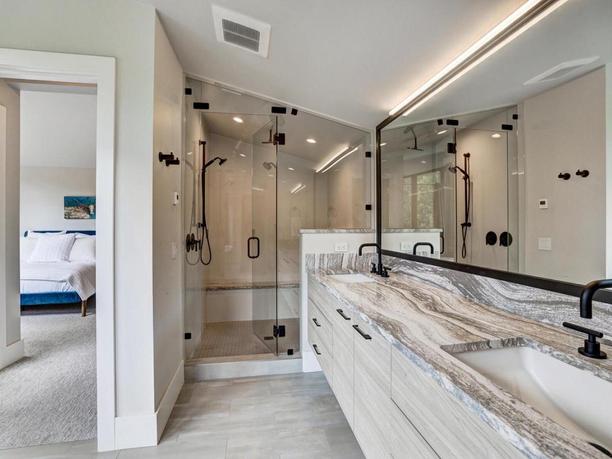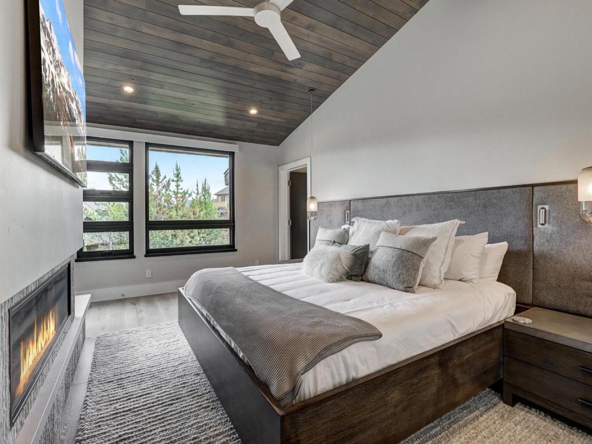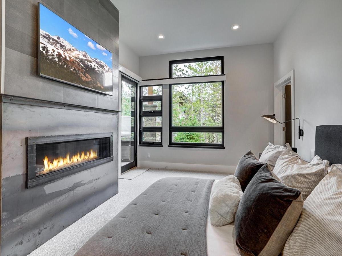 Continue down to the lower level, where there’s a third king bedroom with a cozy fireplace and an ensuite bathroom that features a steam shower, soaking tub, and dual vanities.