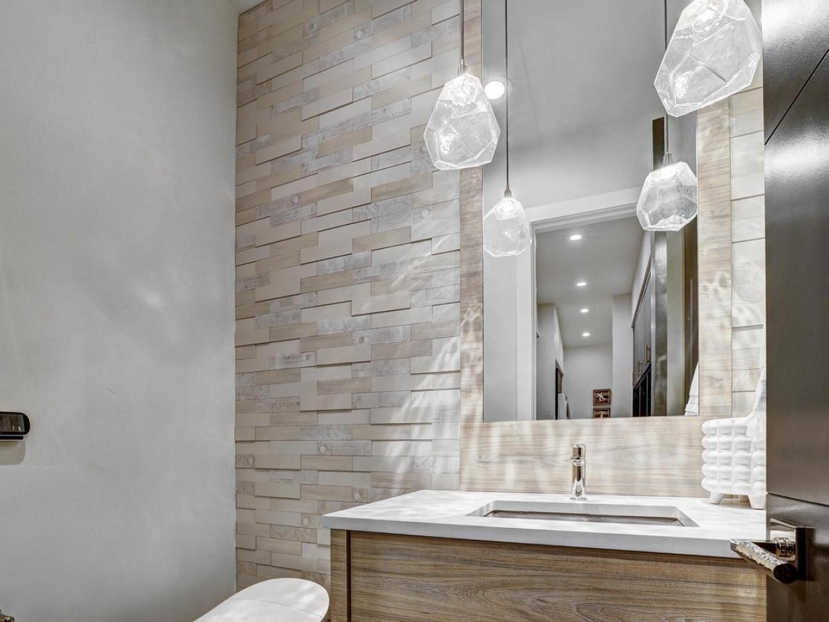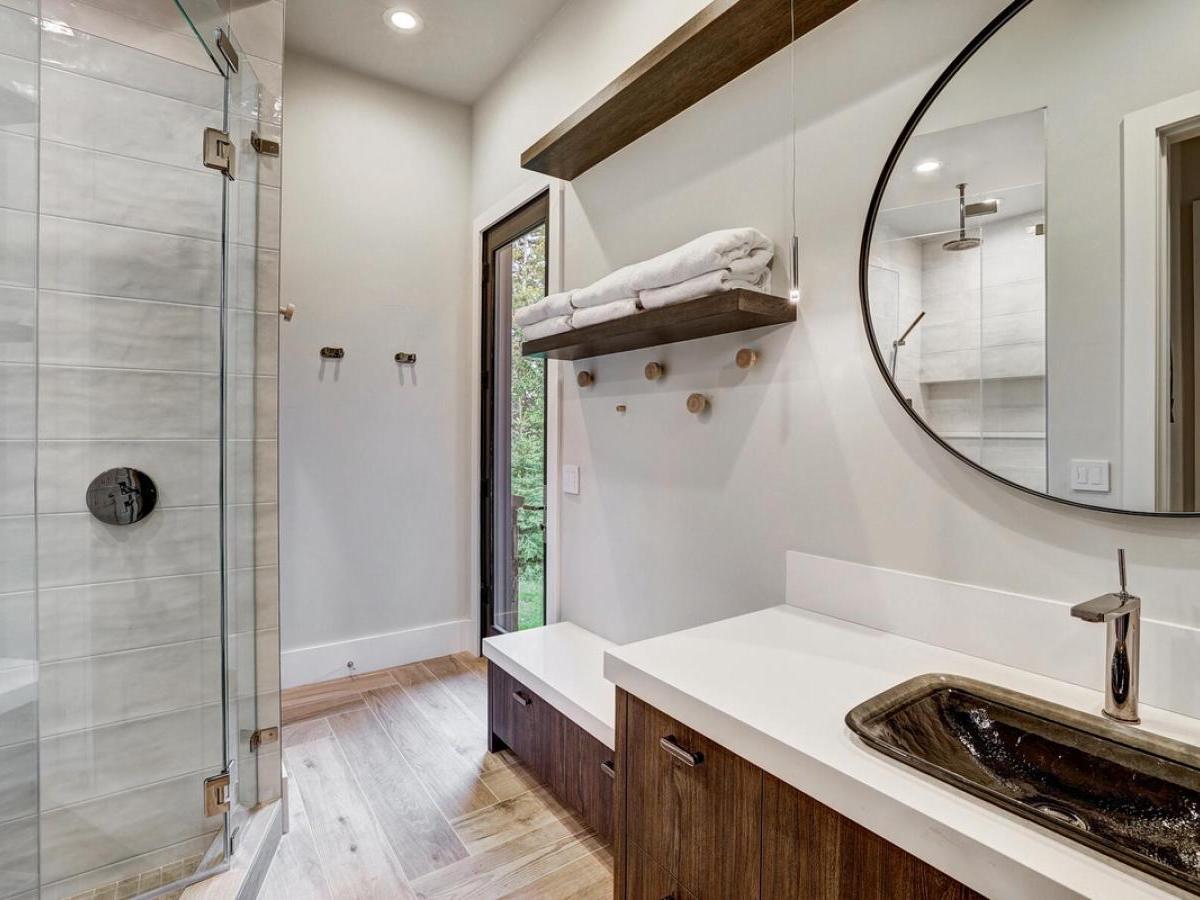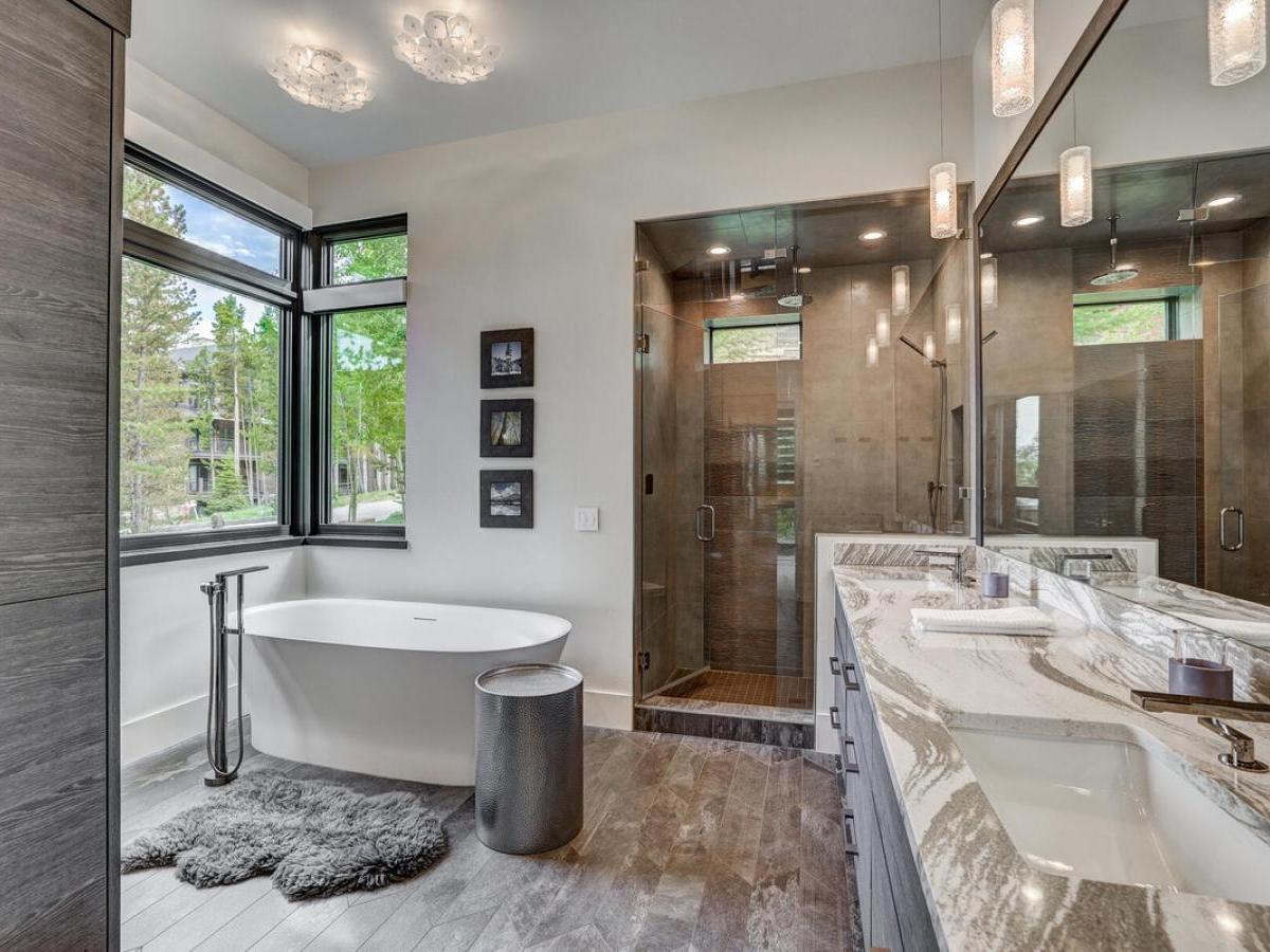 Continue down to the lower level, where there’s a third king bedroom with a cozy fireplace and an ensuite bathroom that features a steam shower, soaking tub, and dual vanities.