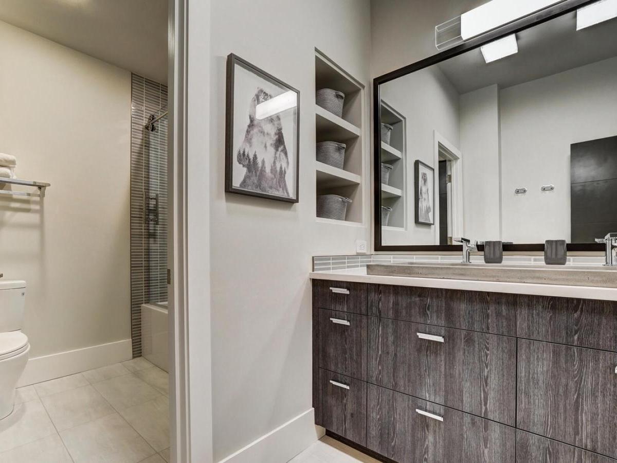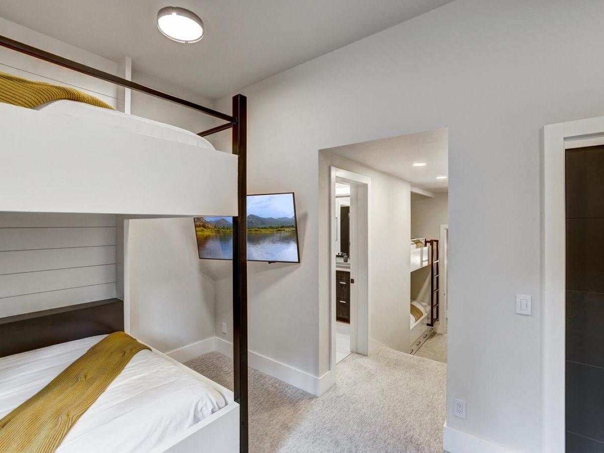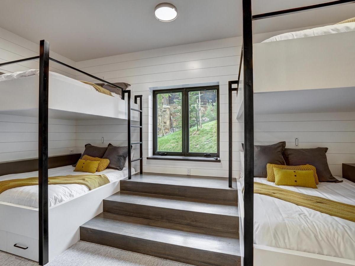 This level also houses two unique bedroom suites. One features two queen sleeping areas that are separated by a curtain and share a bathroom with glass shower and single vanity that also leads out to the hot tub. The second is a bunkroom with two sets of queen-over-queen bunks and one twin-over-twin bunkbed that’s set apart in its own nook. These bunks enjoy an ensuite bathroom with a tub/shower combo and double vanity.