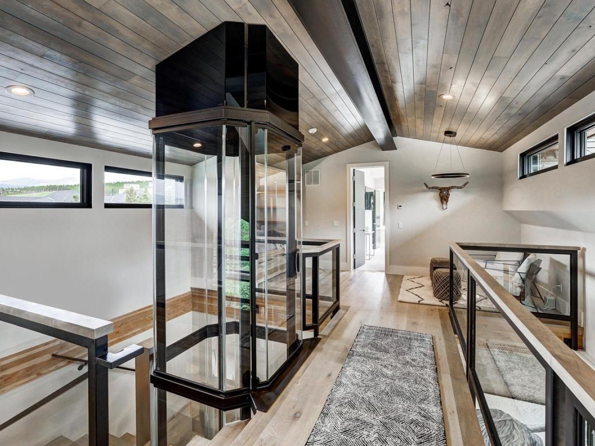 A glass-enclosed elevator whisks you to the upper level, where a quiet sitting area with cozy chairs and a day bed, perfect for reading or napping. Through this area is another king suite with its own balcony and breathtaking views of the surrounding peaks. This ensuite bath features a jetted soaking tub, steam shower, and dual vanities.
