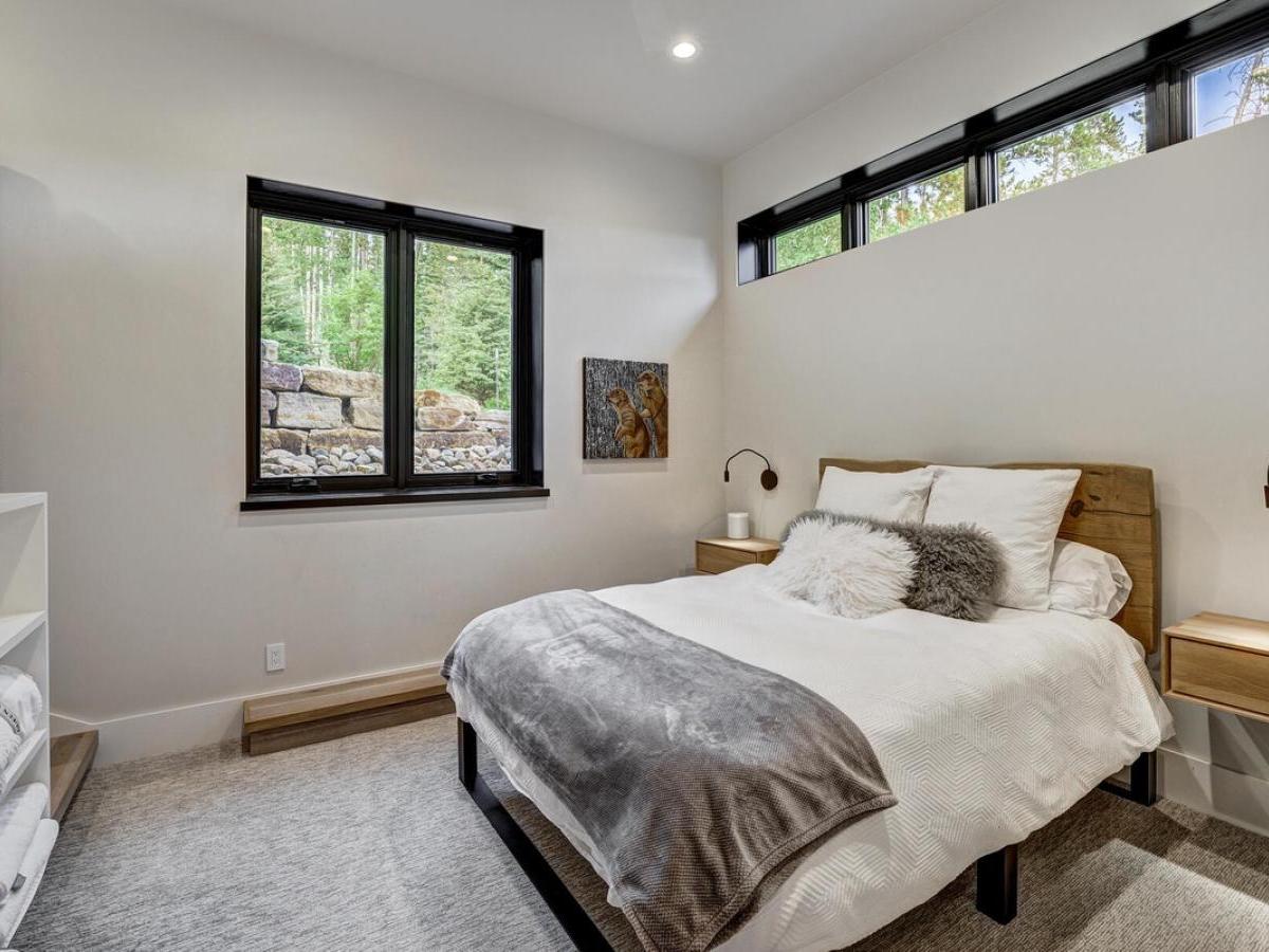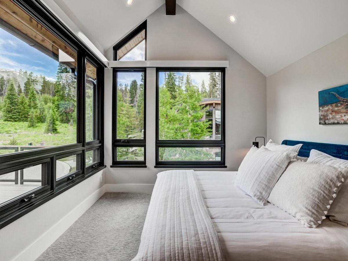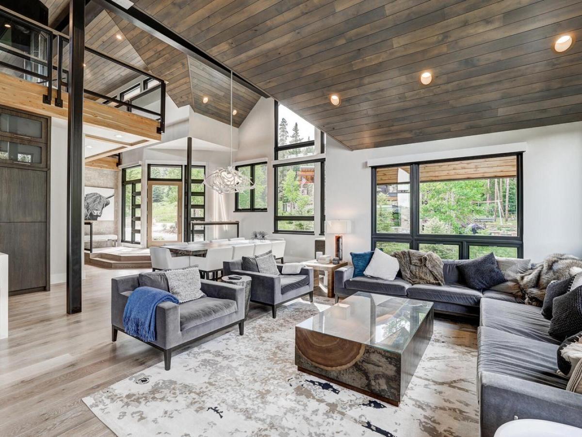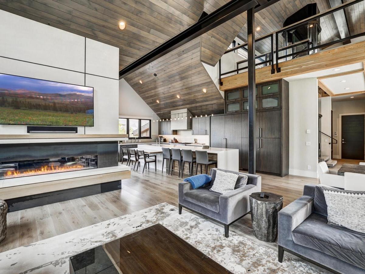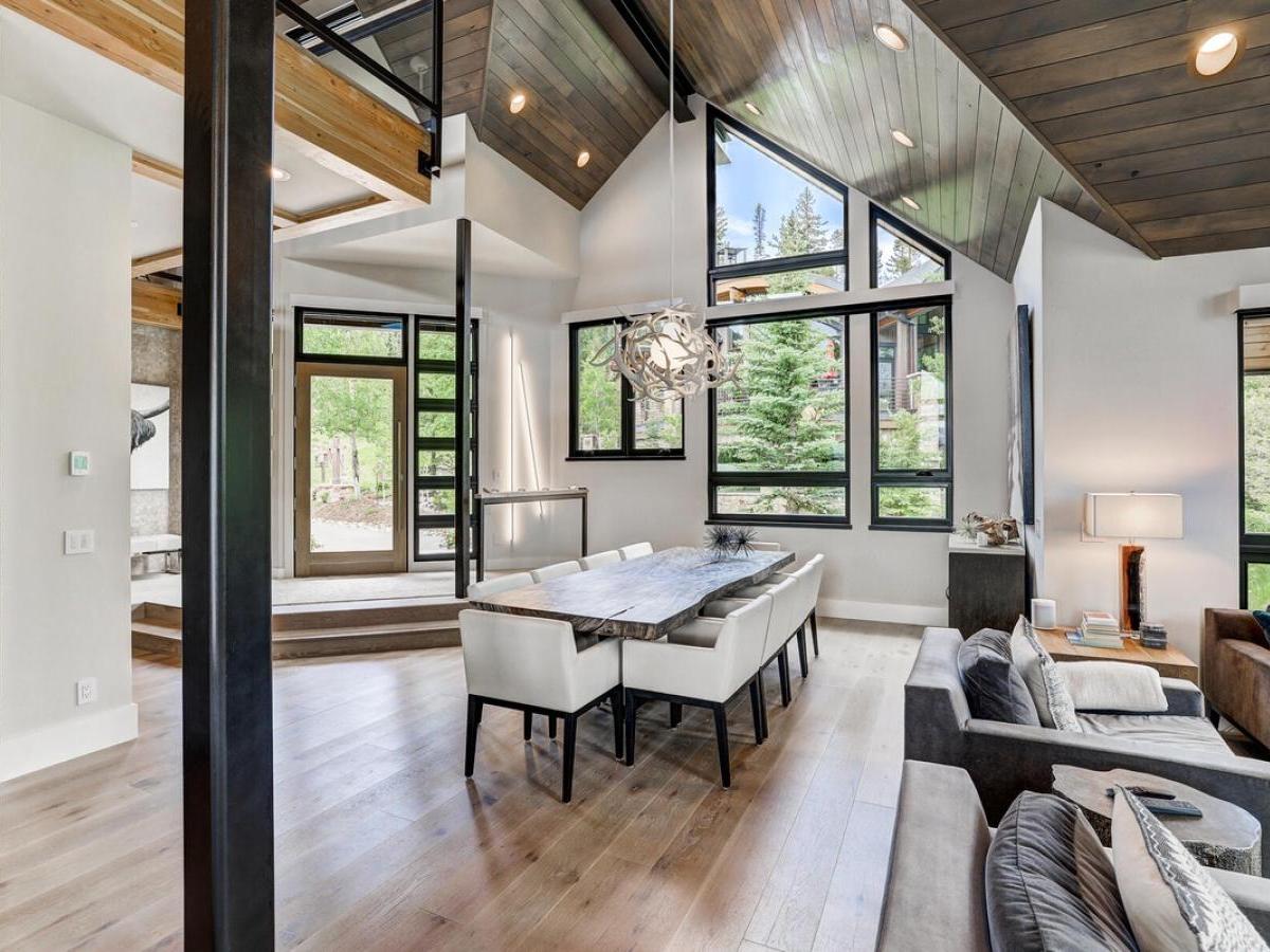 sleek modern mountain design meets the warmth of a true alpine retreat. Within walking distance to the ski slopes, this striking home blends soaring windows, vaulted ceilings, and a soft palette of grays and whites accented with natural wood to create a space that is both sophisticated and inviting.