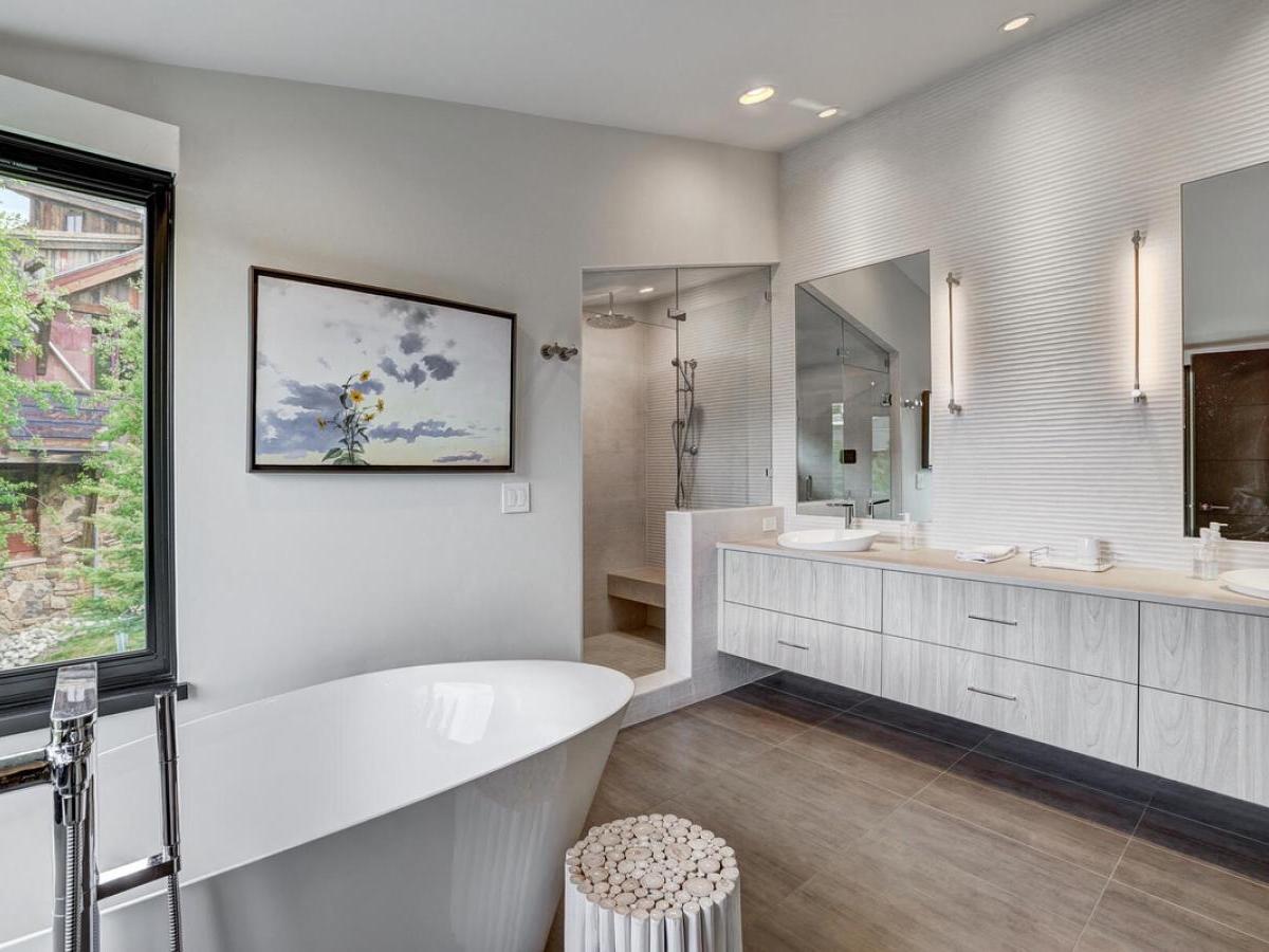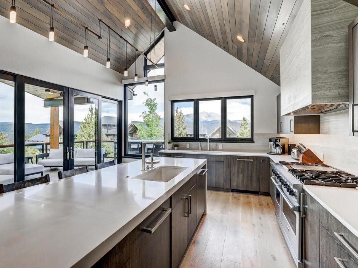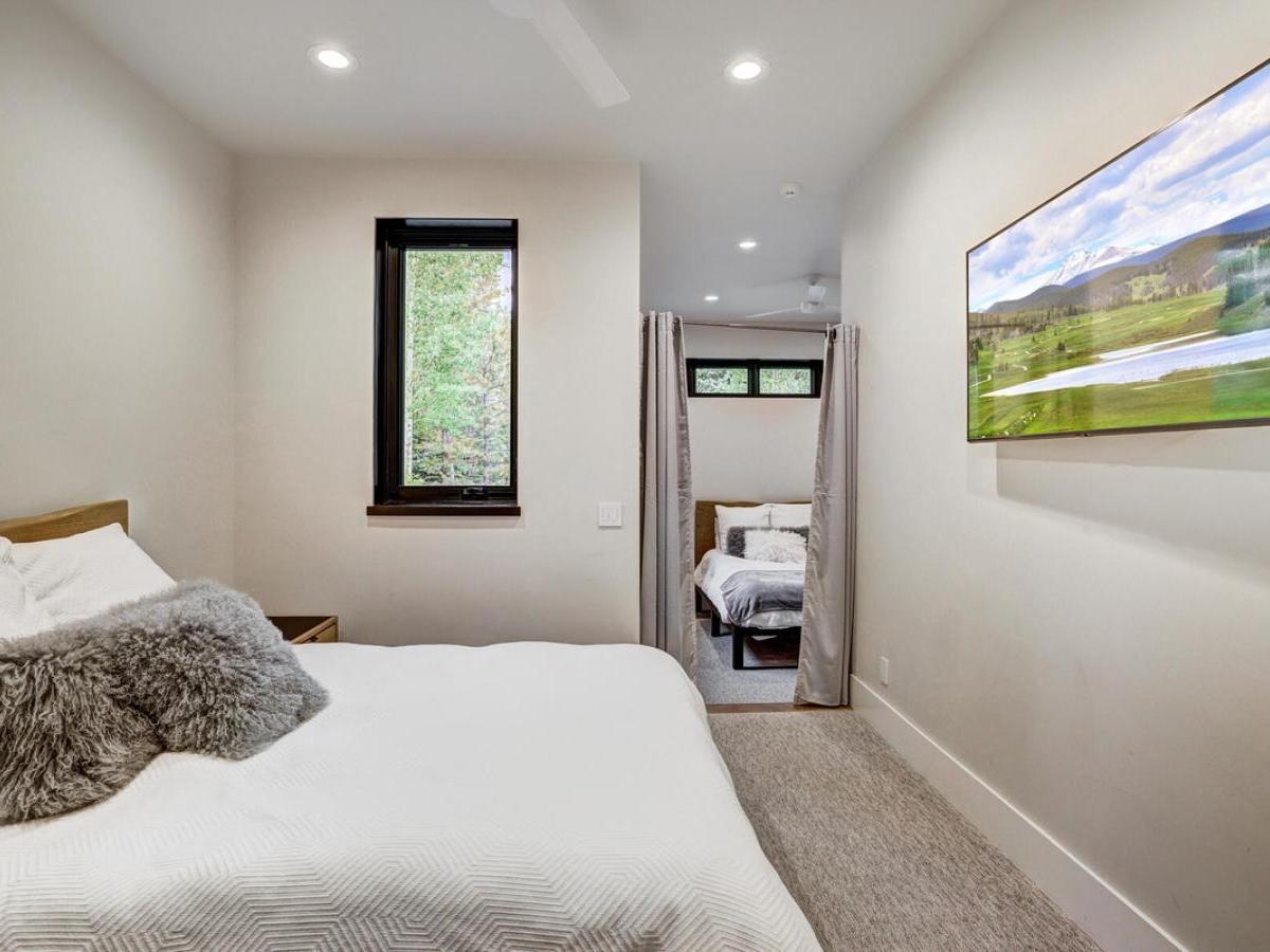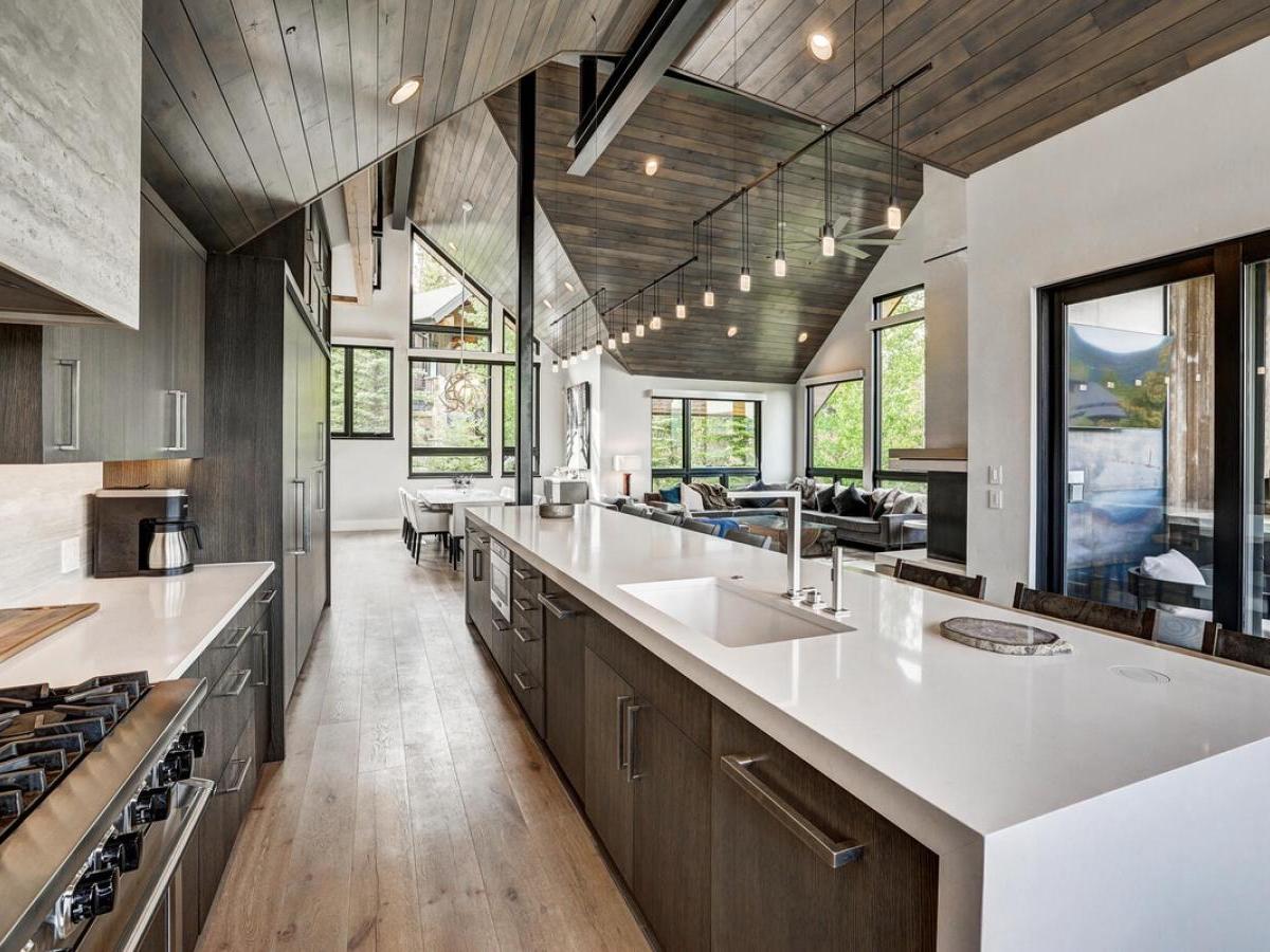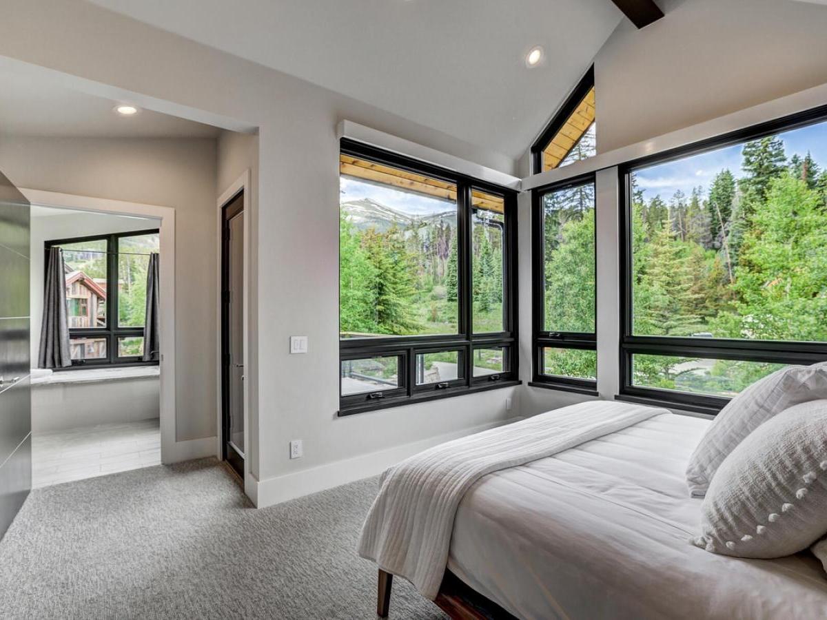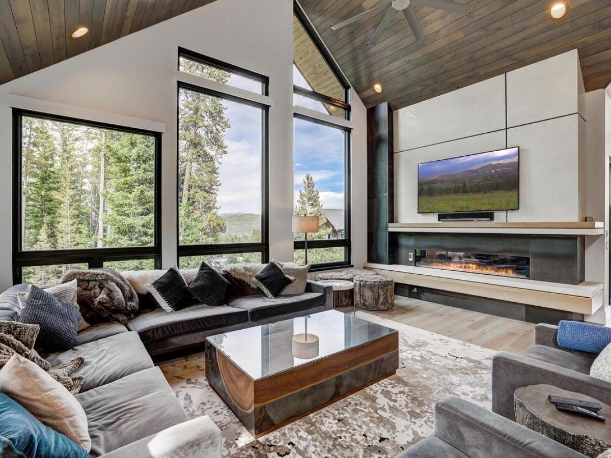 sleek modern mountain design meets the warmth of a true alpine retreat. Within walking distance to the ski slopes, this striking home blends soaring windows, vaulted ceilings, and a soft palette of grays and whites accented with natural wood to create a space that is both sophisticated and inviting.