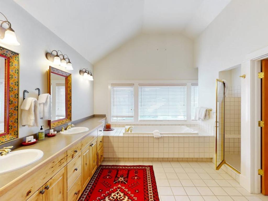 Relax in the jetted bathtub as you savor the mountain views in the upper-level master suite, where you’ll have a King bed and elegant cottage-style furnishings. On the first level, two Queen bedrooms share a bathroom with the basement level Queen bedroom. For your convenience, there is a laundry room and two-car garage.