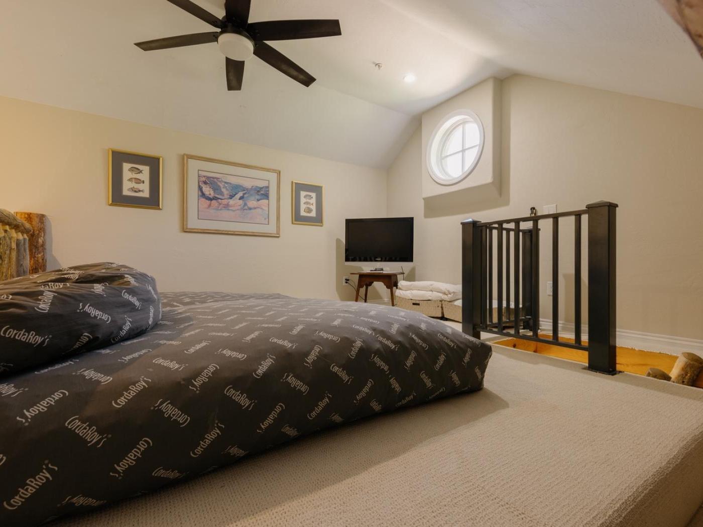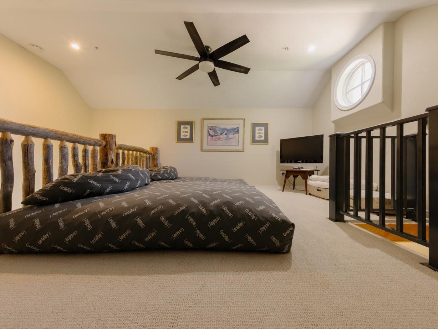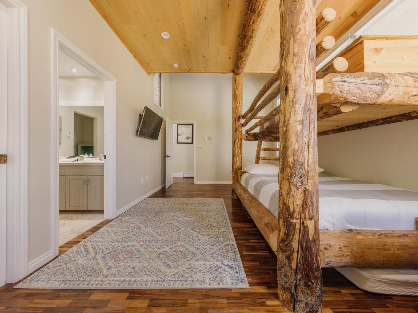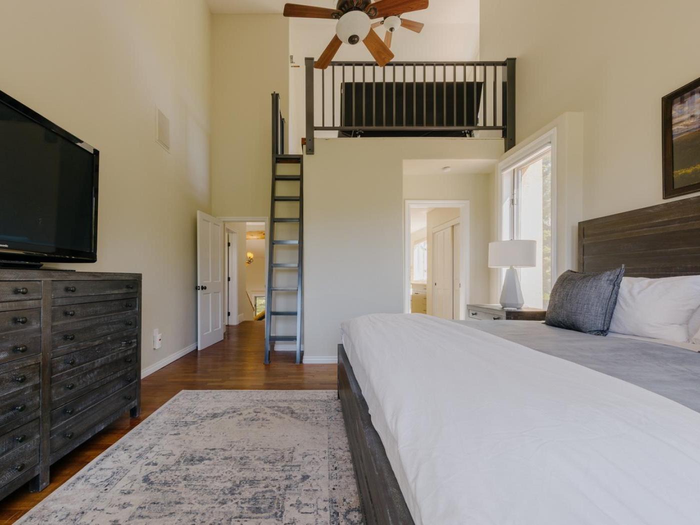 Located on the upper level, the primary suite is outfitted with a King bed, a unique loft with a sofa, desk and lounging chair, and a private bathroom featuring a soaking tub and steam shower. Two bedrooms enjoy private bathrooms, one offers a King bed while the other is equipped with a Twin over Full bunk plus a loft area with two blow-up mattresses and a television.