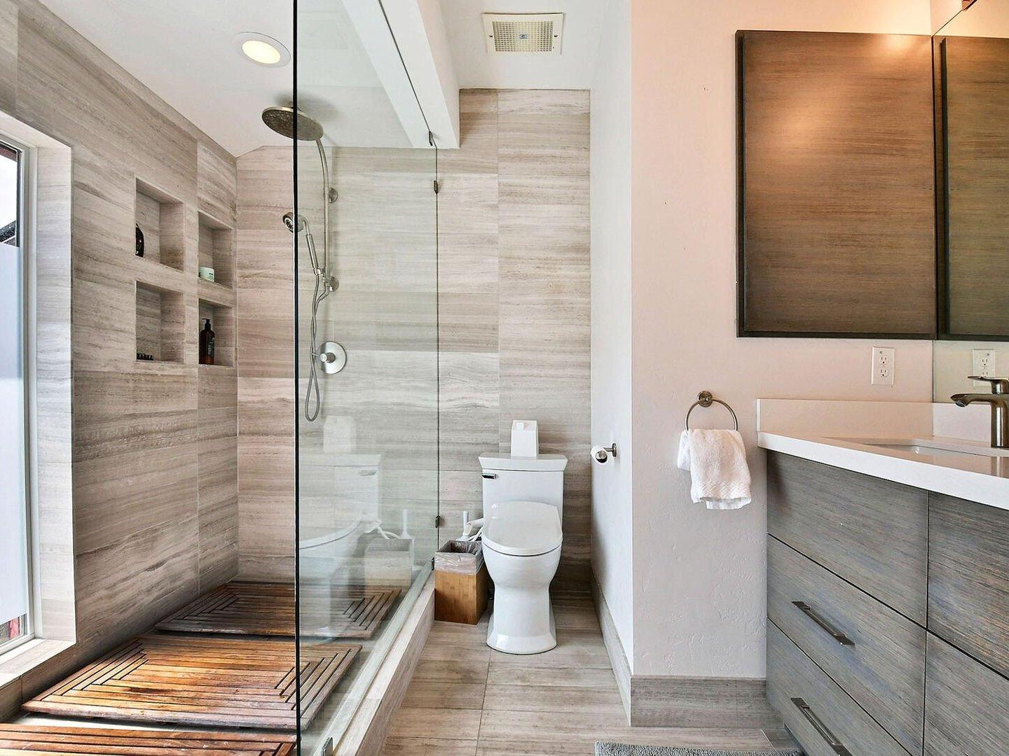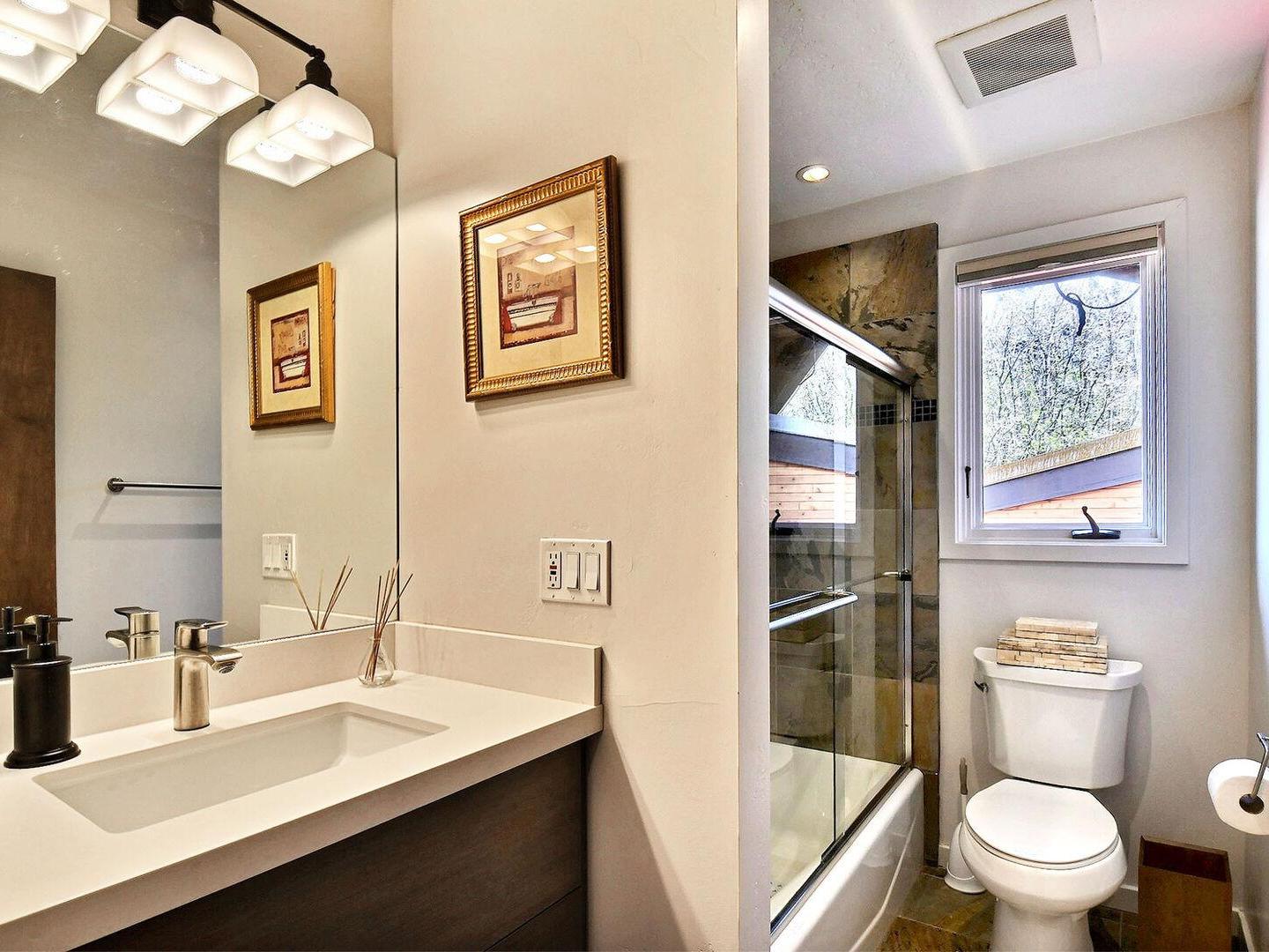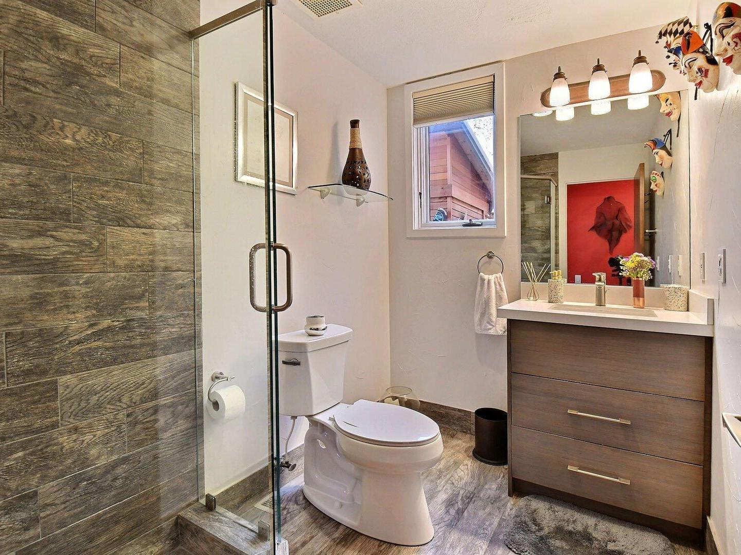 The bedroom layout is designed for both comfort and privacy. Behind the kitchen, a main-level guest bedroom features a King bed and easy access to a full bathroom. Upstairs, one bedroom is appointed with two Double beds, a private deck, and an en suite bathroom with a dual-sink vanity and walk-in shower. Two additional upper-level bedrooms, one with a Queen bed and one with Queen bed plus a Double Sleeper sofa, share a full bathroom. On the lower level, a private guest suite includes a King bed and en suite bath, ideal for those seeking a quieter retreat.