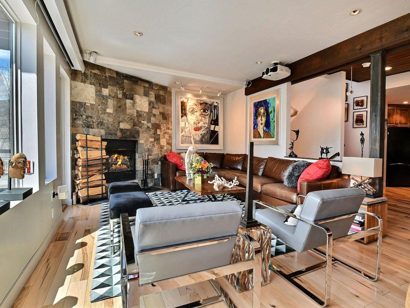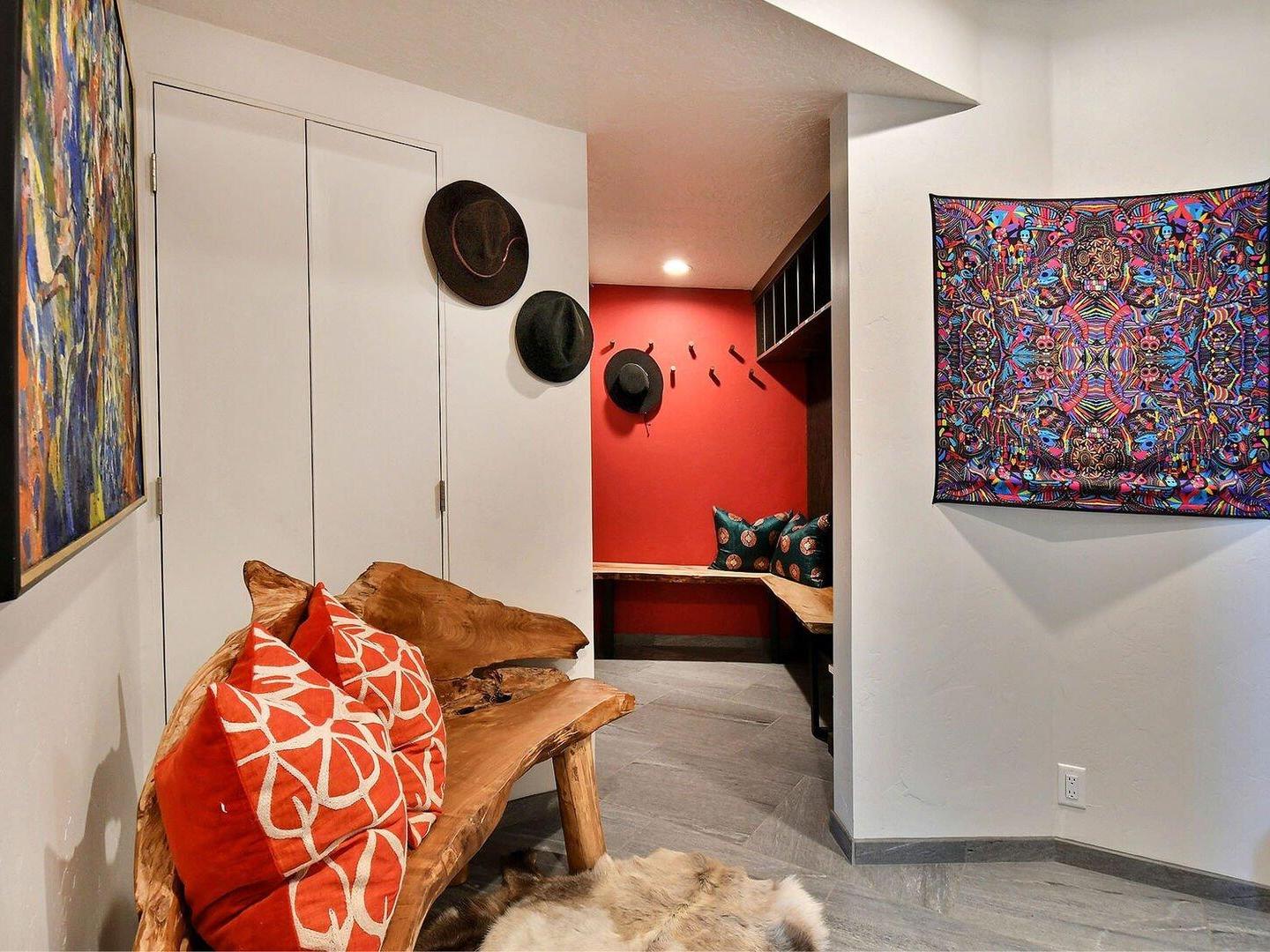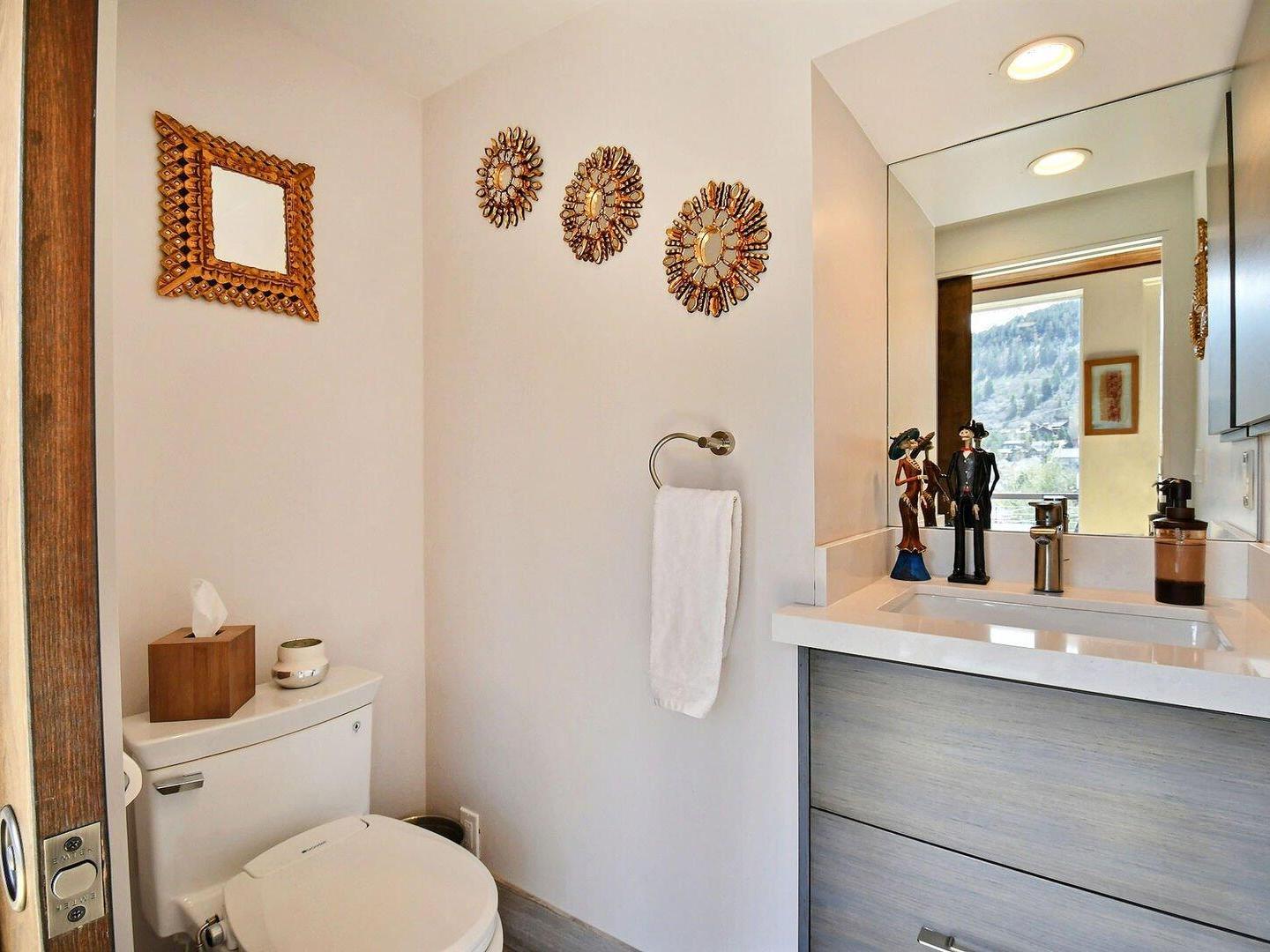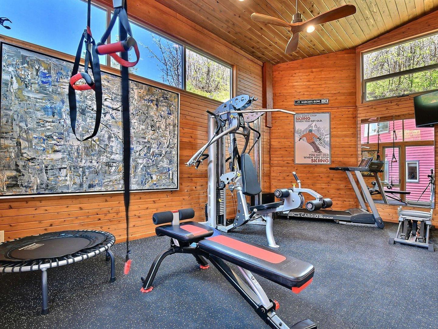 Throughout the home, unique art pieces add a touch of sophistication and character, giving the residence a distinct and stylish atmosphere. Designed with wellness in mind, the property includes a dedicated yoga room on the lower level and an impressive fitness room tucked into an alcove off the living area, complete with a dry sauna. Just outside, a private hot tub set against the mountainside offers the perfect spot to relax after a day of alpine adventure.