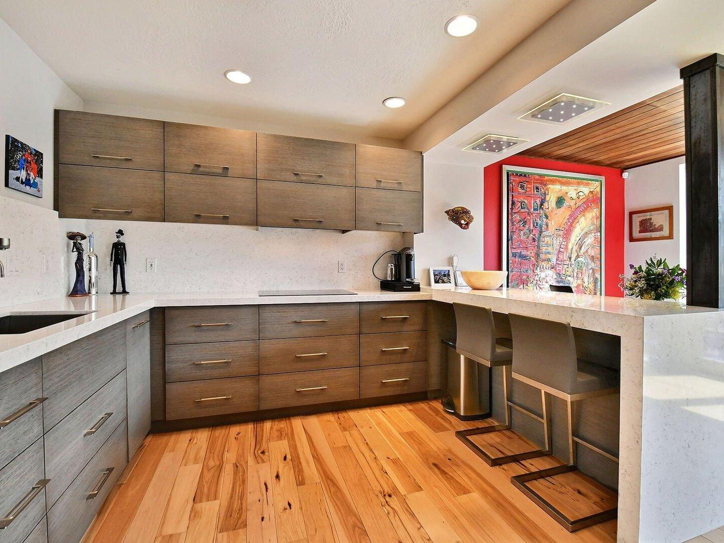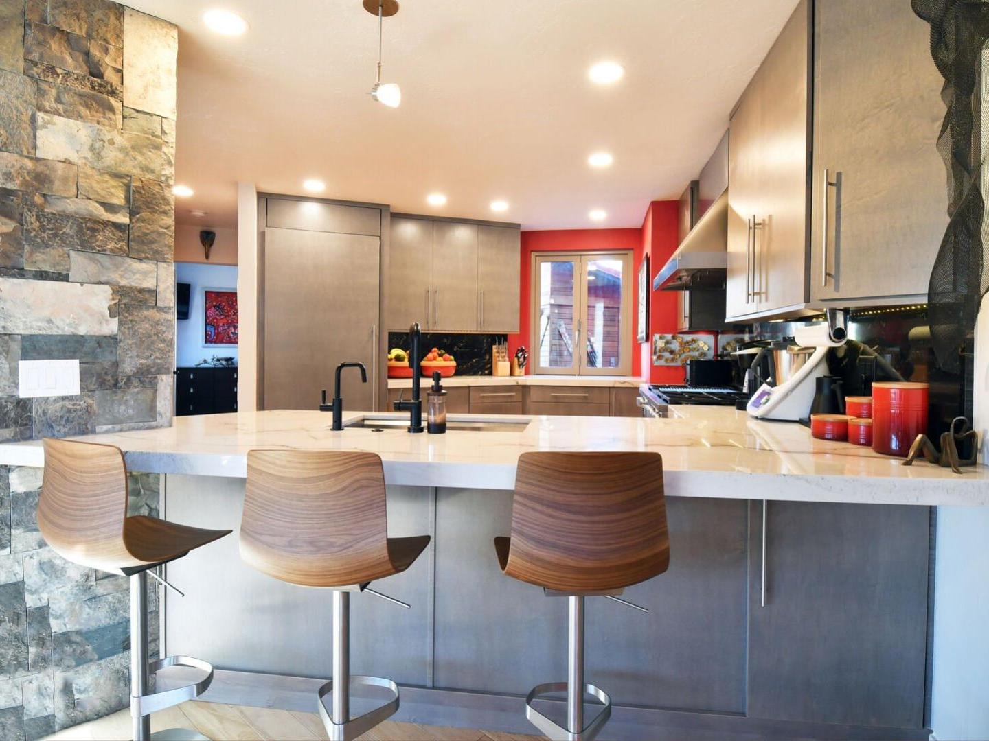 Perched on the second level of this 5-bedroom, 5-bathroom private mountain retreat, the cozy living room features high-quality furnishings arranged around a wood-burning fireplace, framed by a wall of windows that showcases sweeping mountain views and provides access to a private deck. The adjacent dining area seats eight, with additional seating for two at the breakfast bar, creating an inviting space for gatherings. A gourmet kitchen, equipped with premium appliances and ample counter space, allows chefs in the group to prepare meals while staying connected to the conversation.