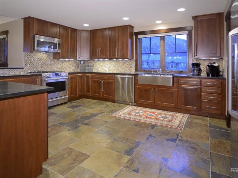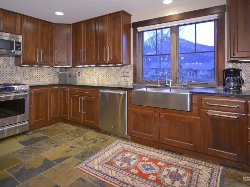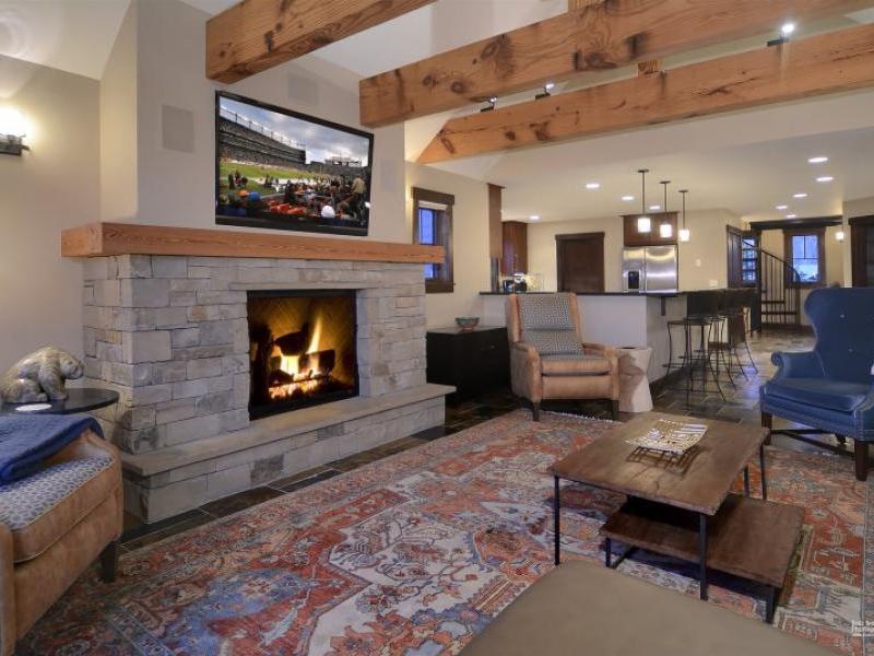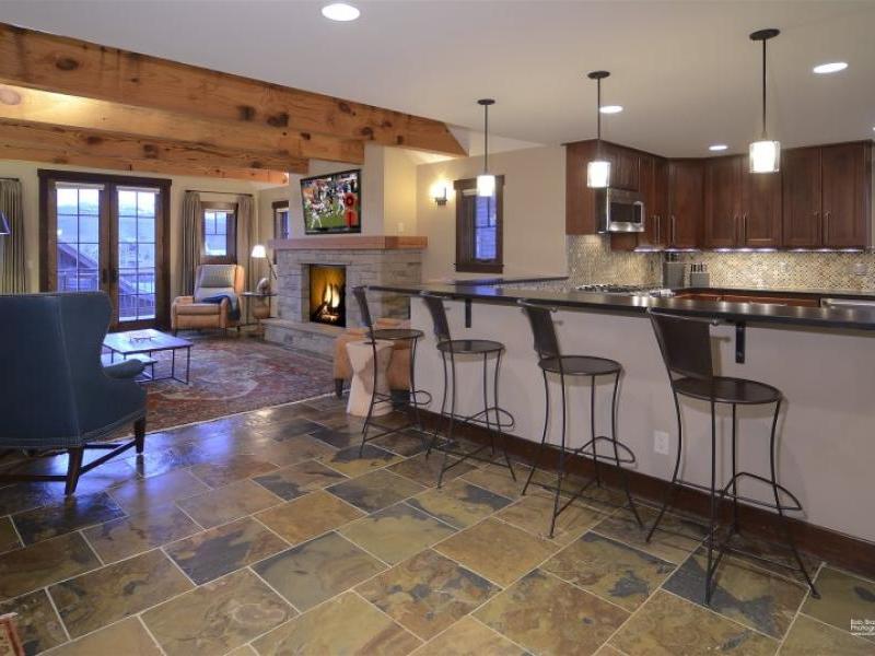 Gather and relax on comfortable furnishings in the cozy living room of this 4 bedroom, 3 bathroom vacation home featuring vaulted ceilings, exposed beams and a gas fireplace set under a wall-mounted television. Located off of the living room is a dining area with seating for 8 guests and an adjacent breakfast bar seating 4 guests. High-end stainless steel appliances, granite countertops and custom cabinetry adorn the gourmet kitchen which overlooks the living room and dining area.