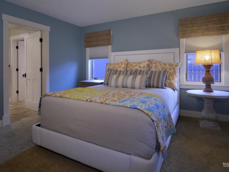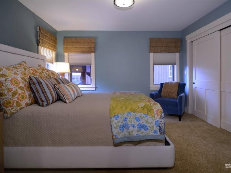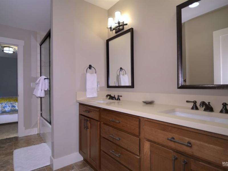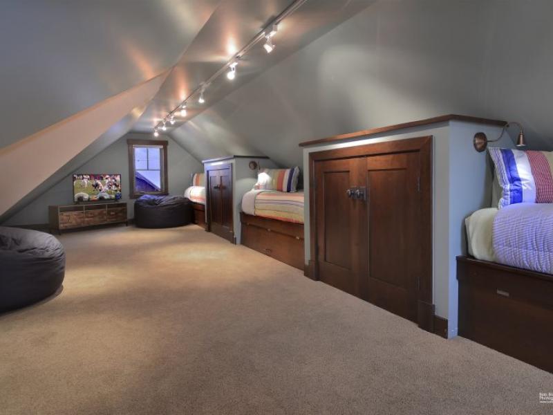 Appointed with a King bed, the first level primary bedroom enjoys a private bathroom with a dual-sink vanity, soaking tub and steam shower. Two guest bedrooms on this level share a Jack and Jill bathroom, both are furnished with Queen beds. Occupying the upper level is a sloped-ceiling bedroom, ideally appointed for the kids in the group, with 3 built-in Twin beds, bean bags and a television.