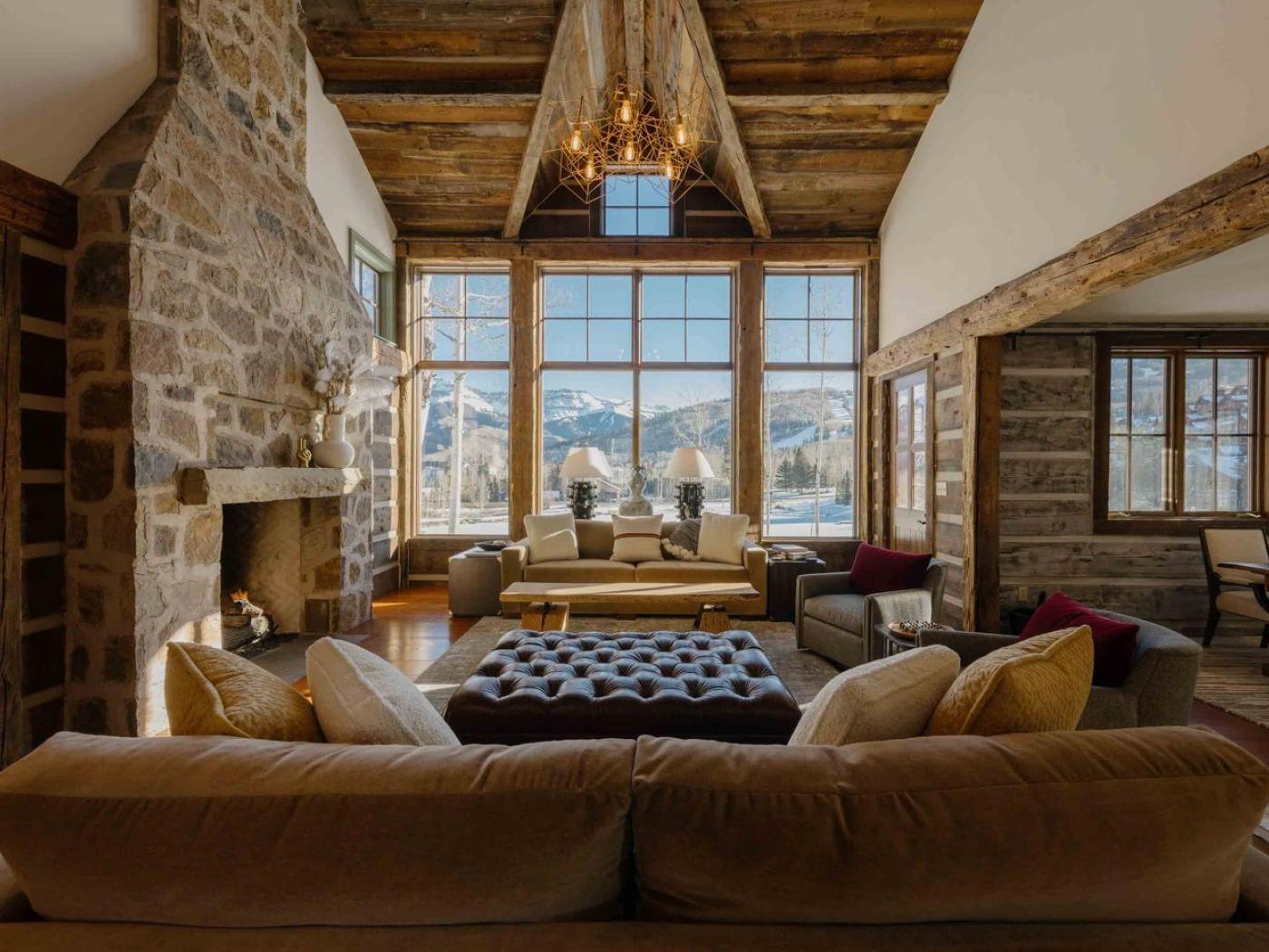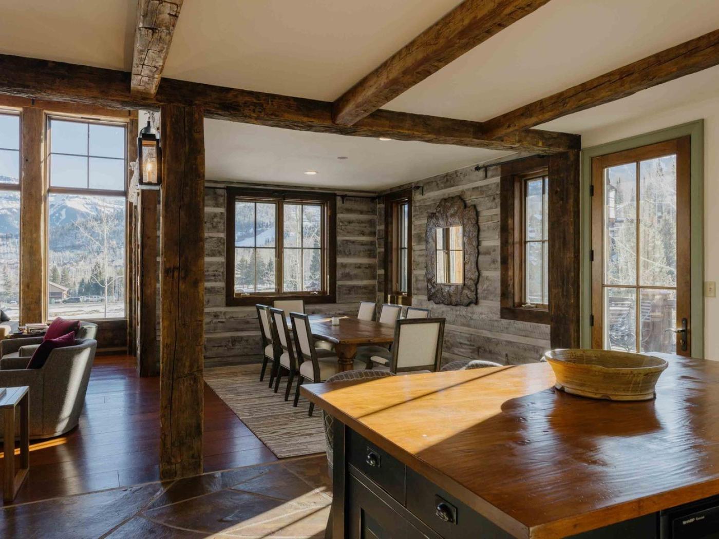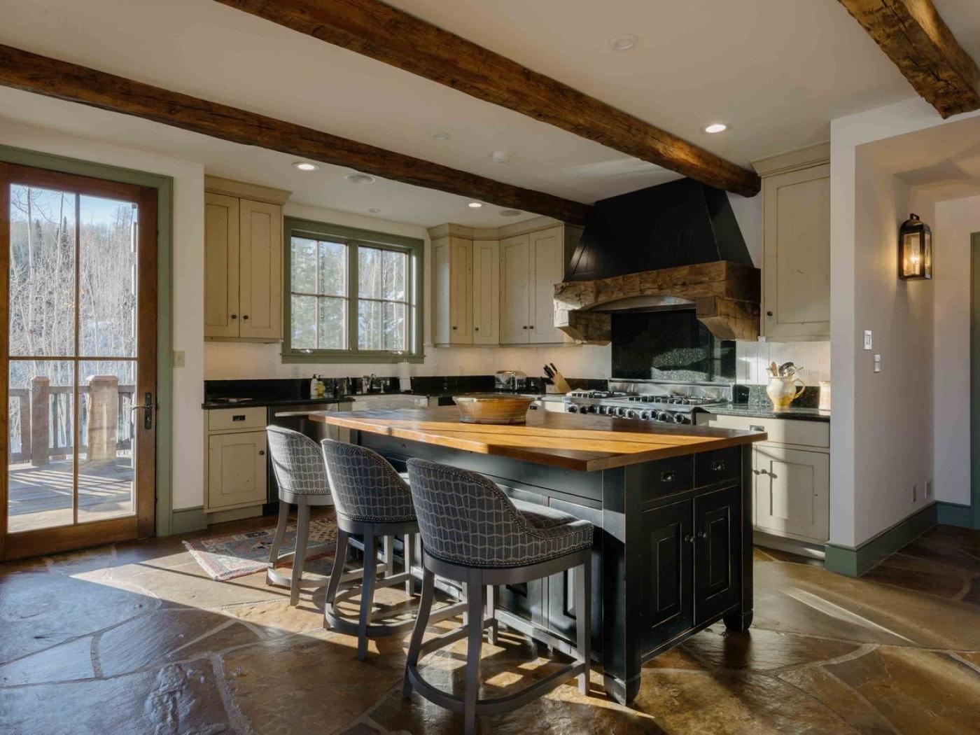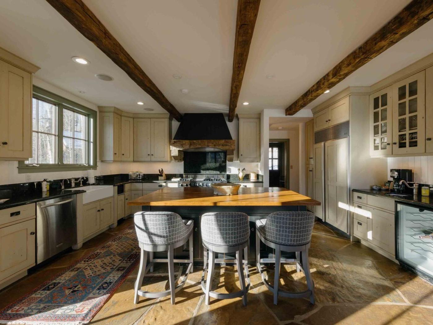 Gather in the main living area around the stone fireplace, framed by a wall of windows that showcase sweeping mountain views. Step outside to a deck with a dining set and lounge chairs — the perfect perch for al fresco meals or simply soaking in the alpine air. The heart of the home is its chef-ready kitchen, complete with a Viking gas stove, double oven, and farmhouse sink, making it easy to prepare meals for a large group.