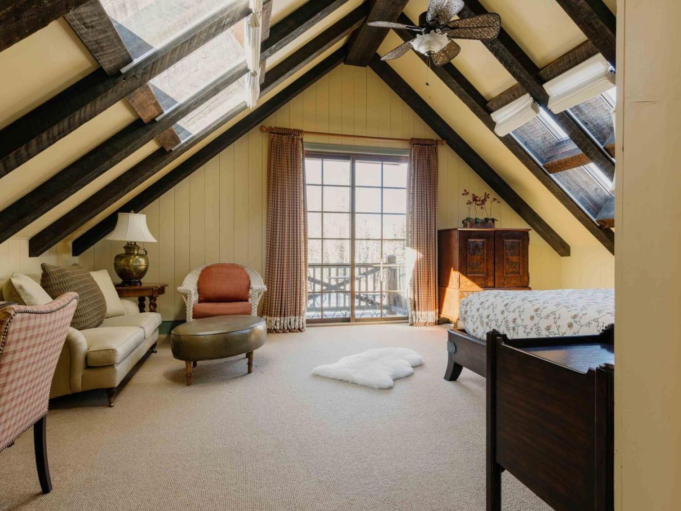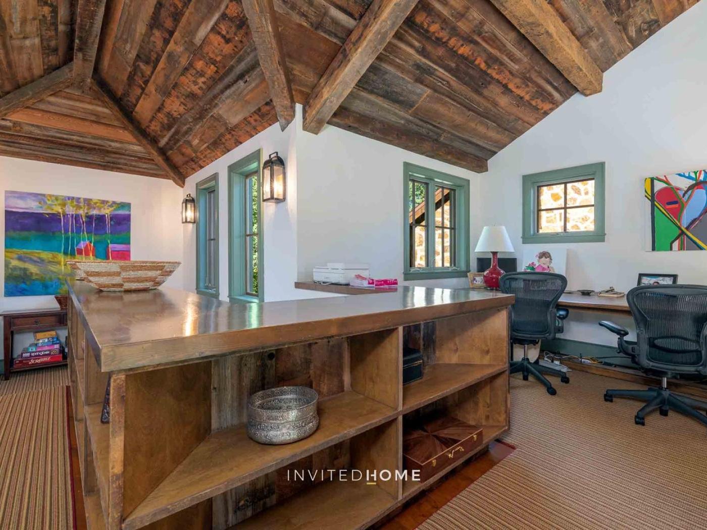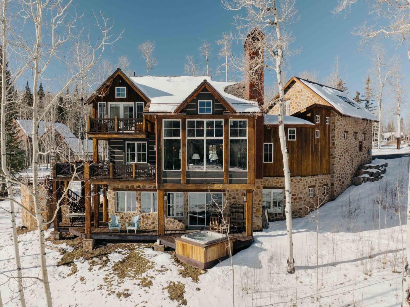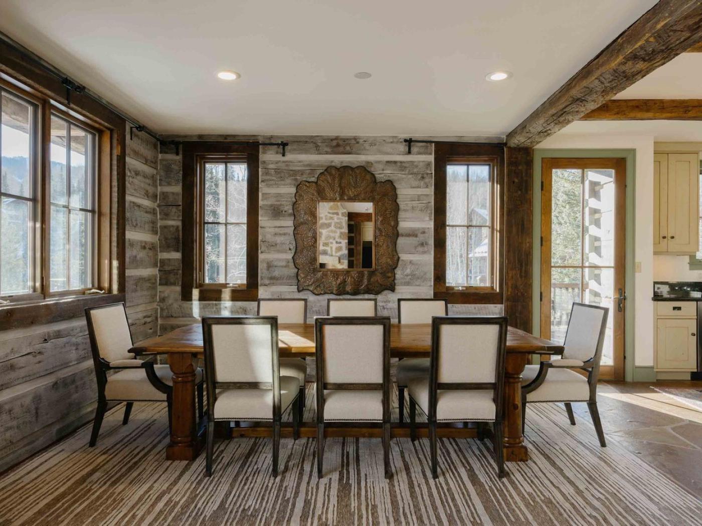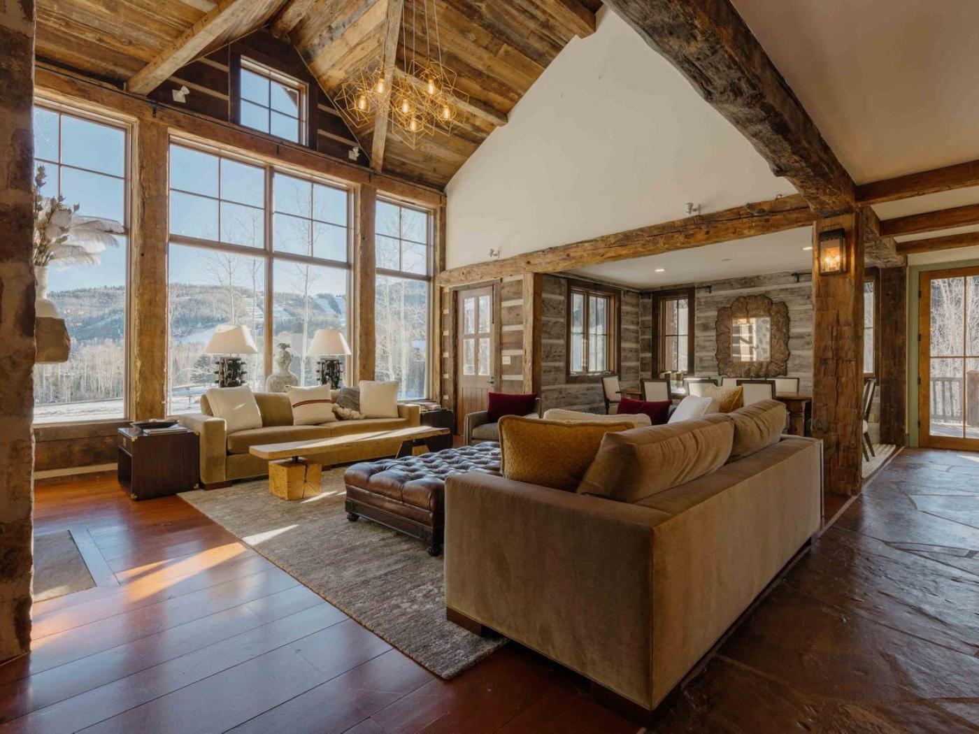 Gather in the main living area around the stone fireplace, framed by a wall of windows that showcase sweeping mountain views. Step outside to a deck with a dining set and lounge chairs — the perfect perch for al fresco meals or simply soaking in the alpine air. The heart of the home is its chef-ready kitchen, complete with a Viking gas stove, double oven, and farmhouse sink, making it easy to prepare meals for a large group.