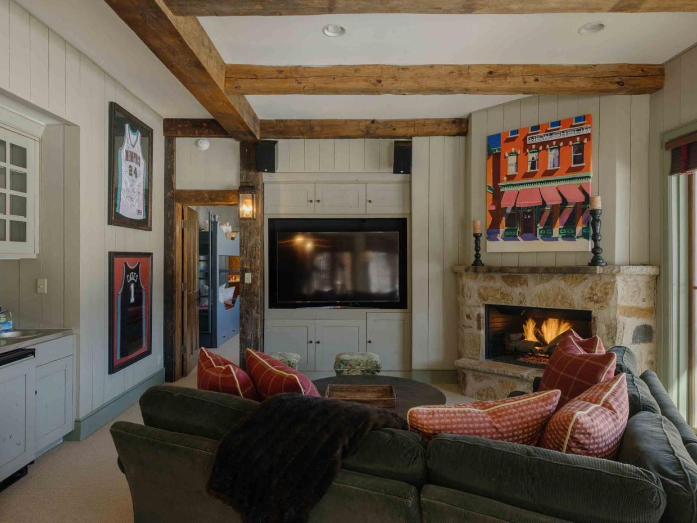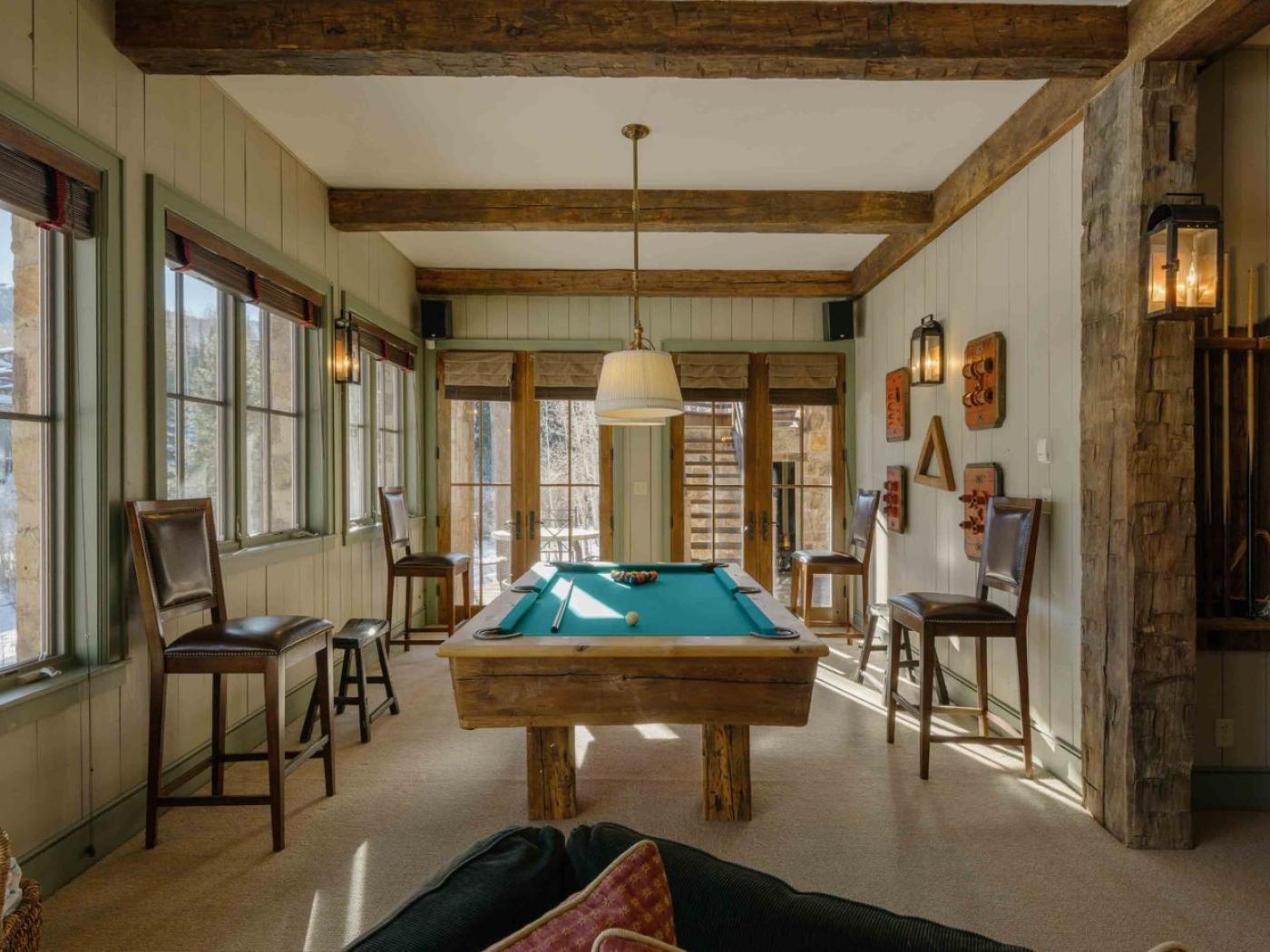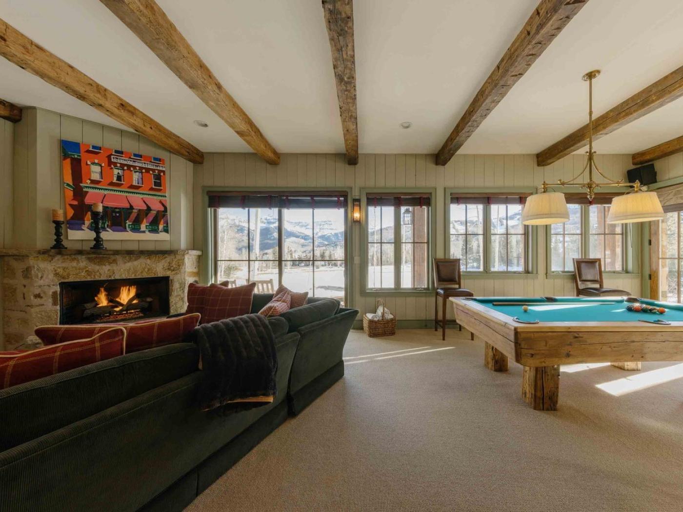 Downstairs, the lodge offers a fun-filled gathering space with a pool table, sofas, and a second fireplace. From here, you can step out to a private patio where a hot tub awaits — an ideal spot to unwind after a day on the slopes.