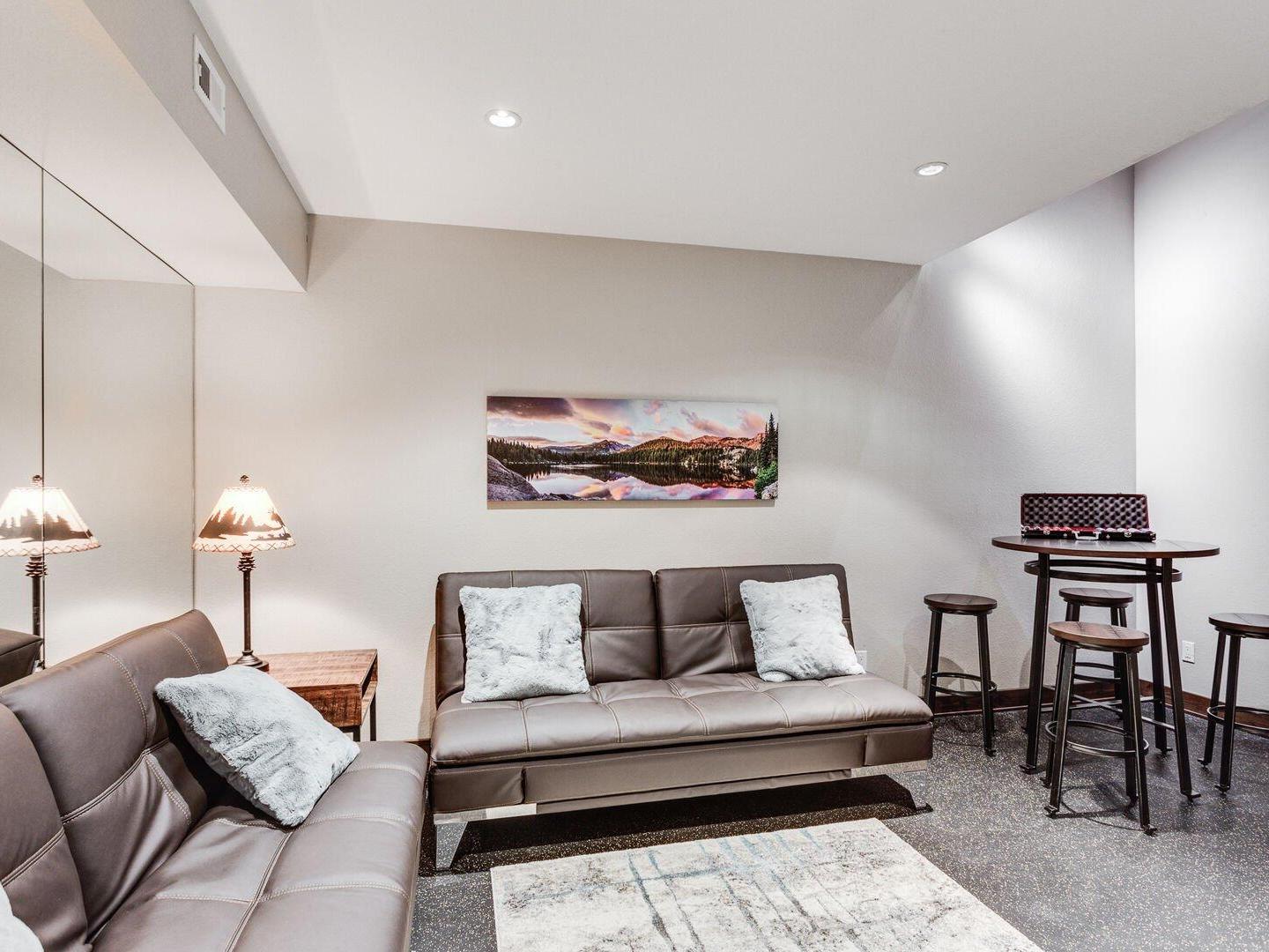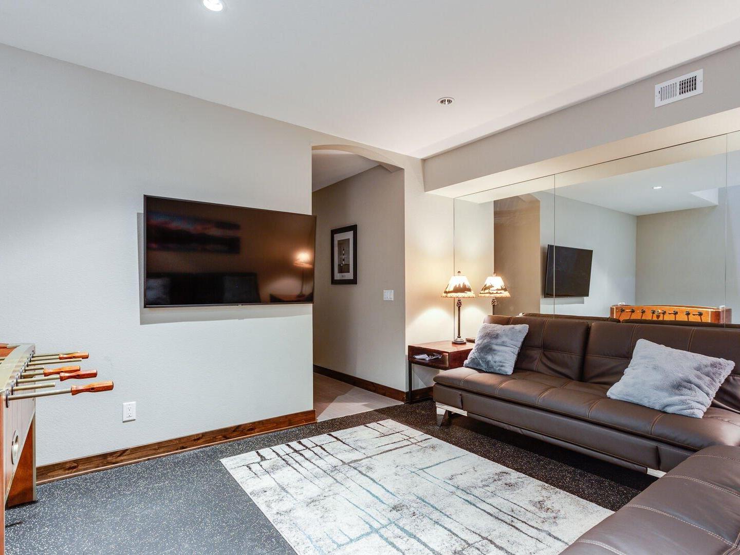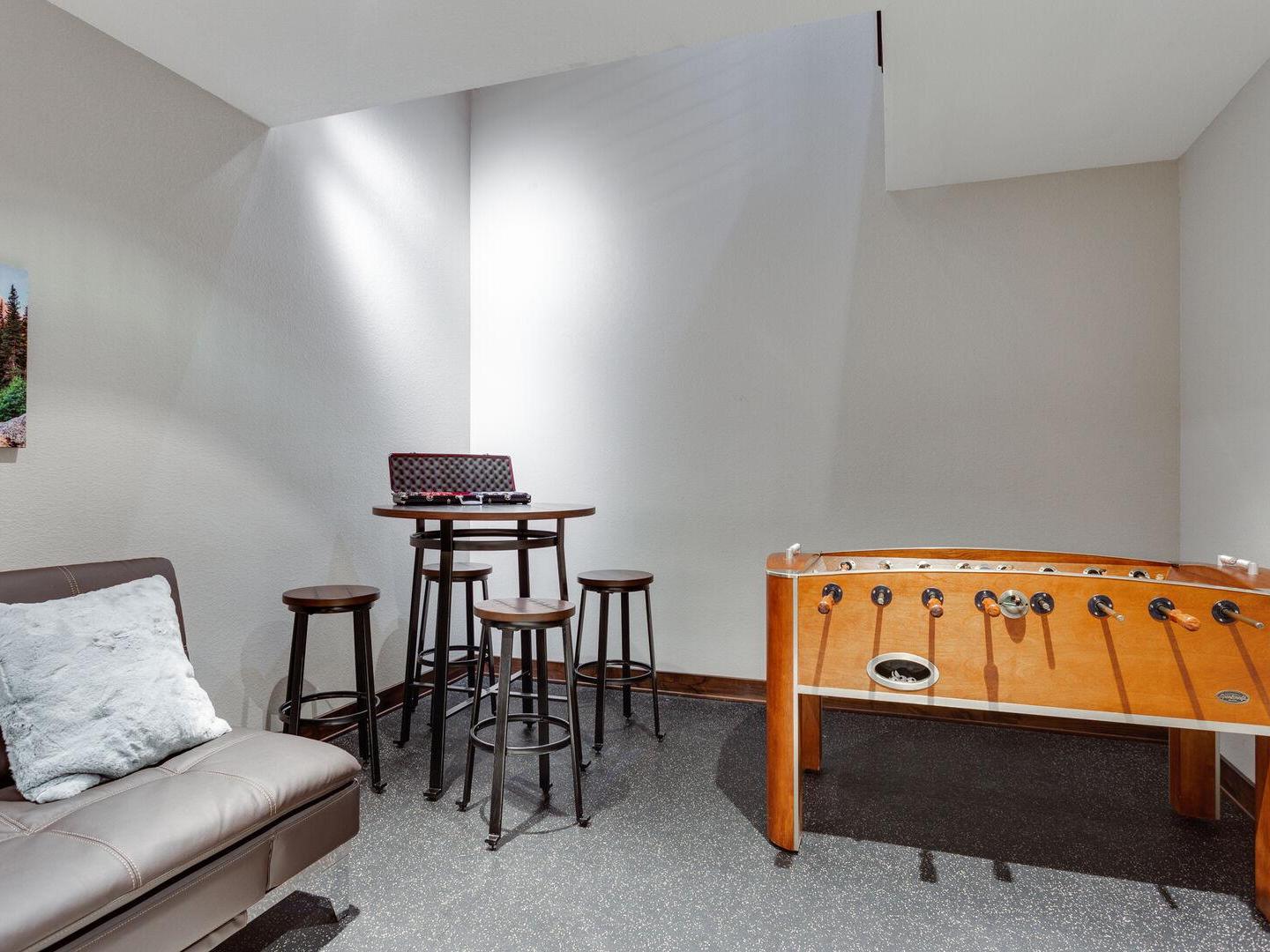 Above the living room is a loft lounge appointed with a large sofa in front of a wall-mounted television with a Nintendo Wii system. Located on the lower level, the family room includes two contemporary sofas focused on a wall-mounted television, high-top game table and Foosball table. Two Twin beds tucked into a sleeping den off of the family room provide additional sleeping accommodations.