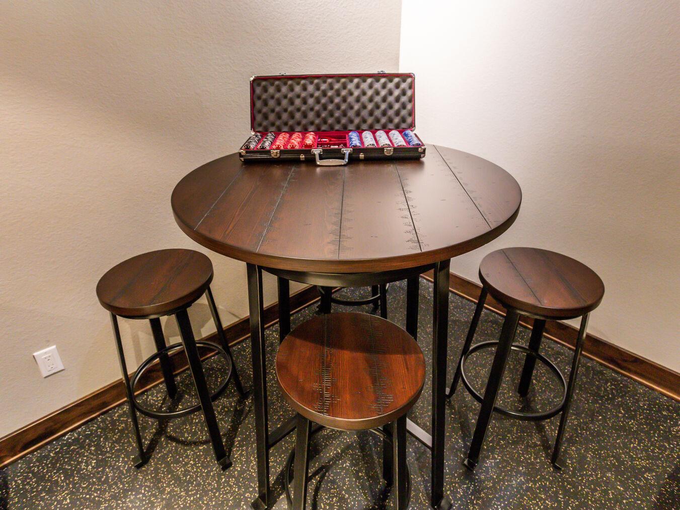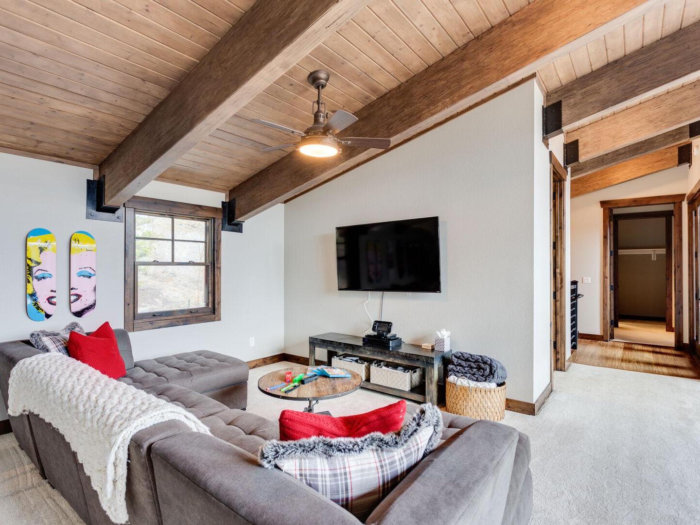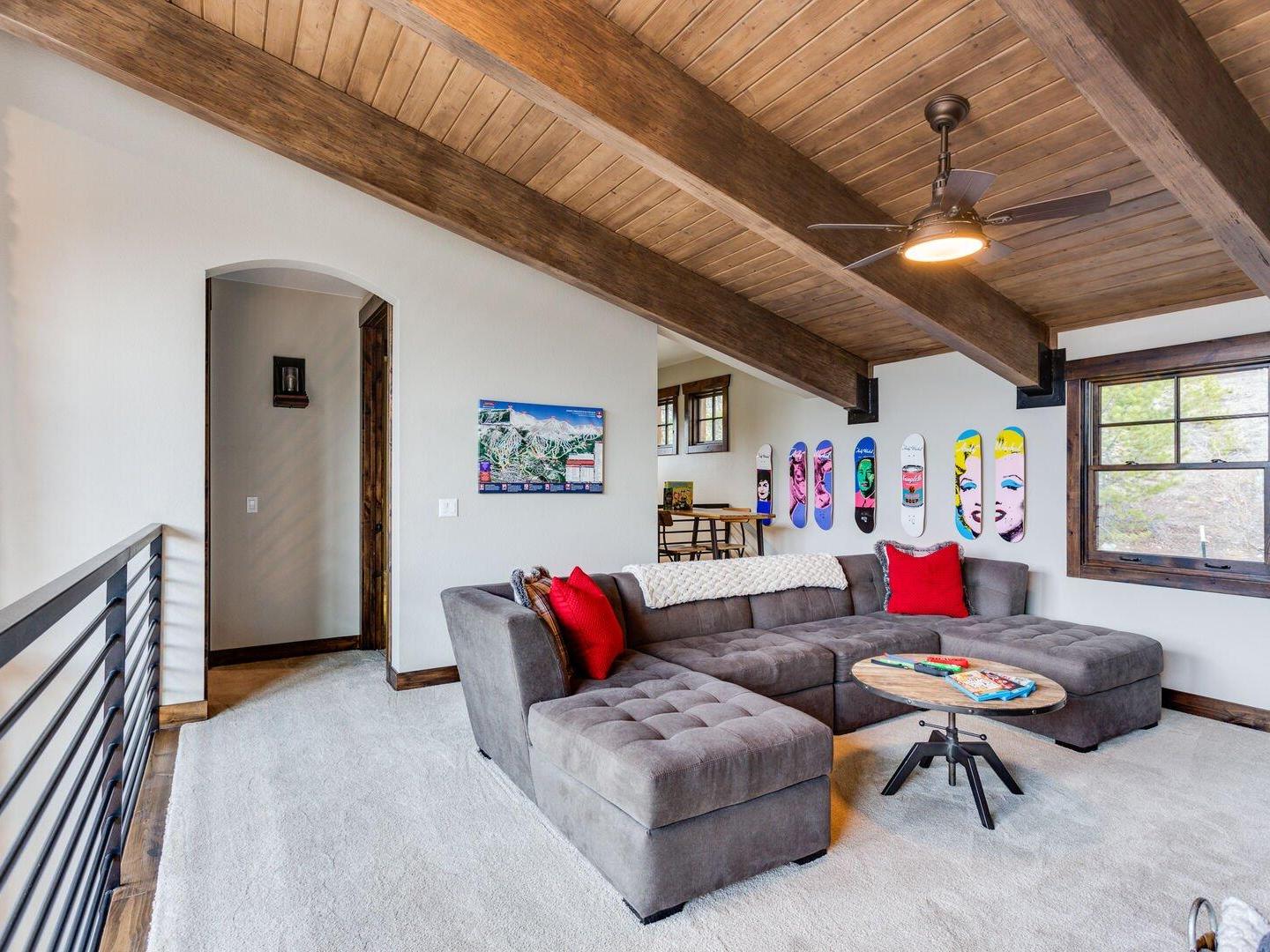 Above the living room is a loft lounge appointed with a large sofa in front of a wall-mounted television with a Nintendo Wii system. Located on the lower level, the family room includes two contemporary sofas focused on a wall-mounted television, high-top game table and Foosball table. Two Twin beds tucked into a sleeping den off of the family room provide additional sleeping accommodations.