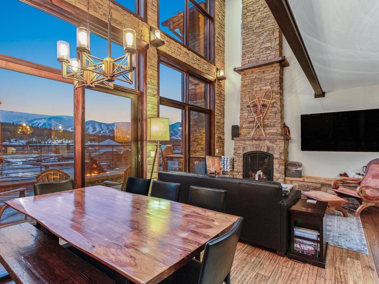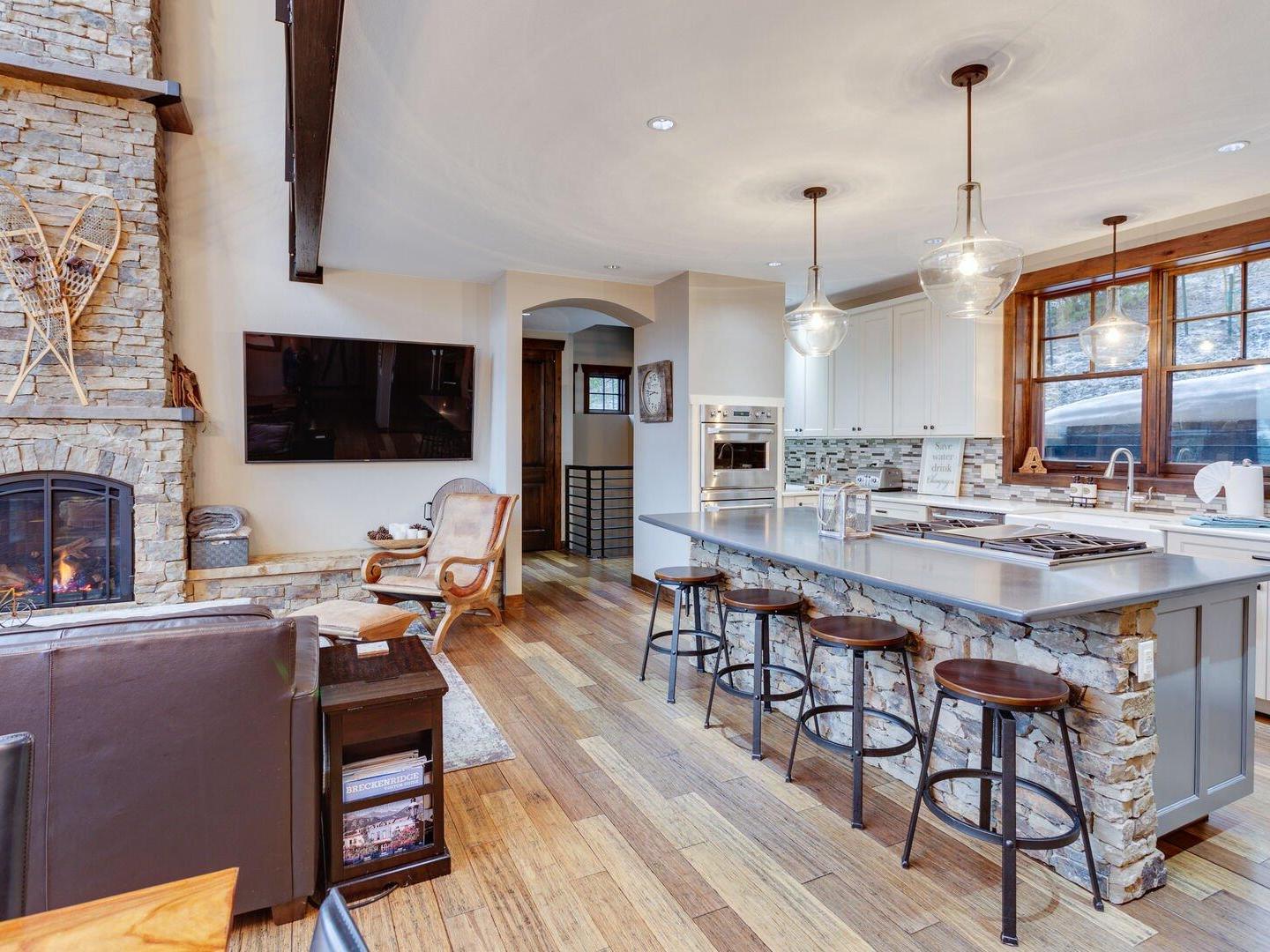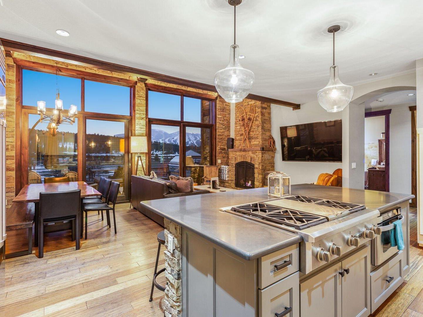 Captivating views of the ski trails pour into the living space through floor-to-ceiling windows in this 4 bedroom, 4 bathroom luxury vacation home featuring a cozy sitting area focused on a gas fireplace and wall-mounted television. Soaring two-story vaulted ceilings create a feeling of infinite space in this open entertainment area with a dining table seating 8 guests and breakfast bar accommodating 4 guests sitting off of the living room. Glass doors in the living room open to the front deck boasting outdoor furnishings around a gas fire pit, built-in barbecue area and private hot tub. Overlooking the living room and dining area, the gourmet kitchen offers a 6-burner gas range with griddle, double ovens and large island.