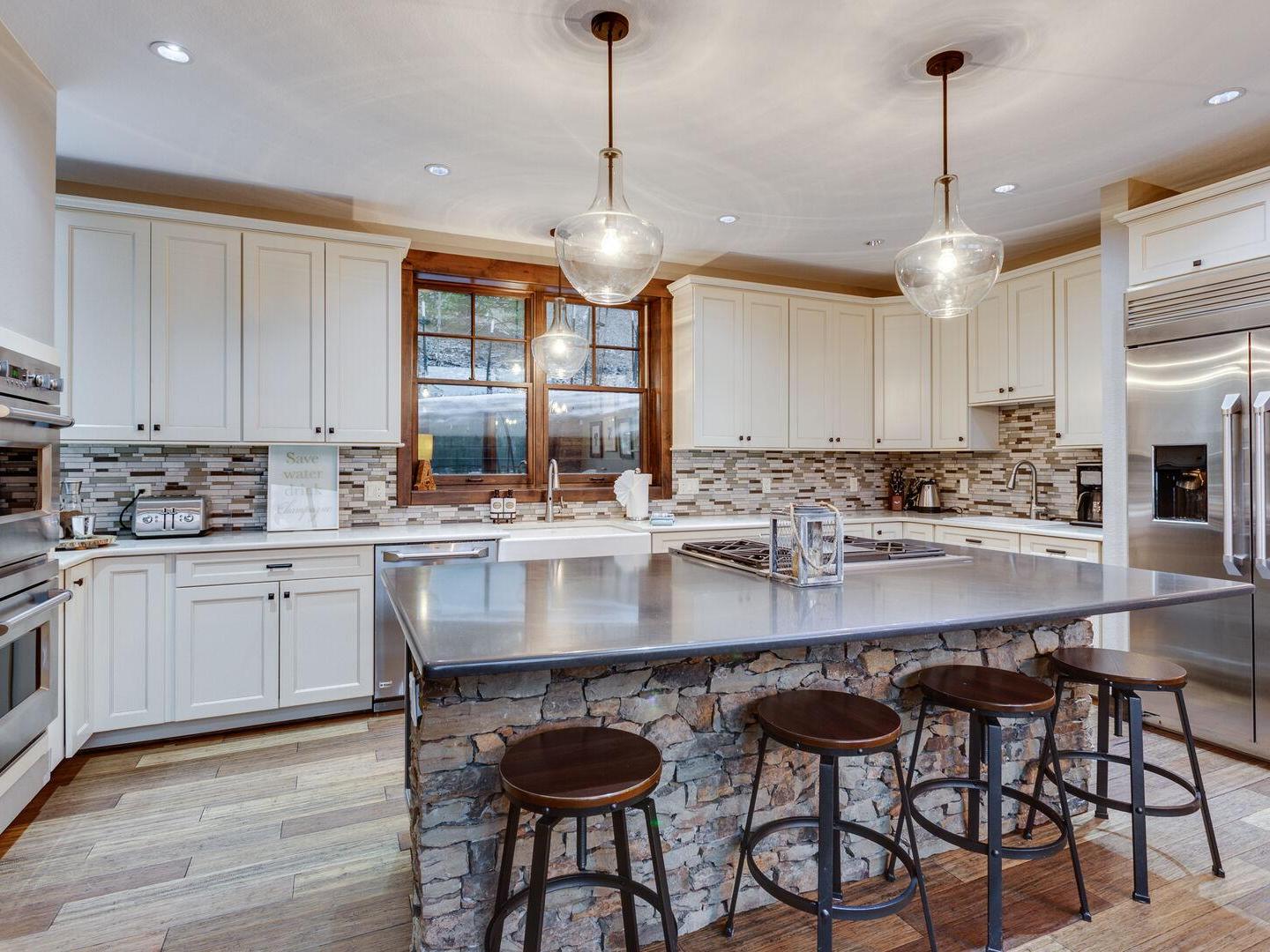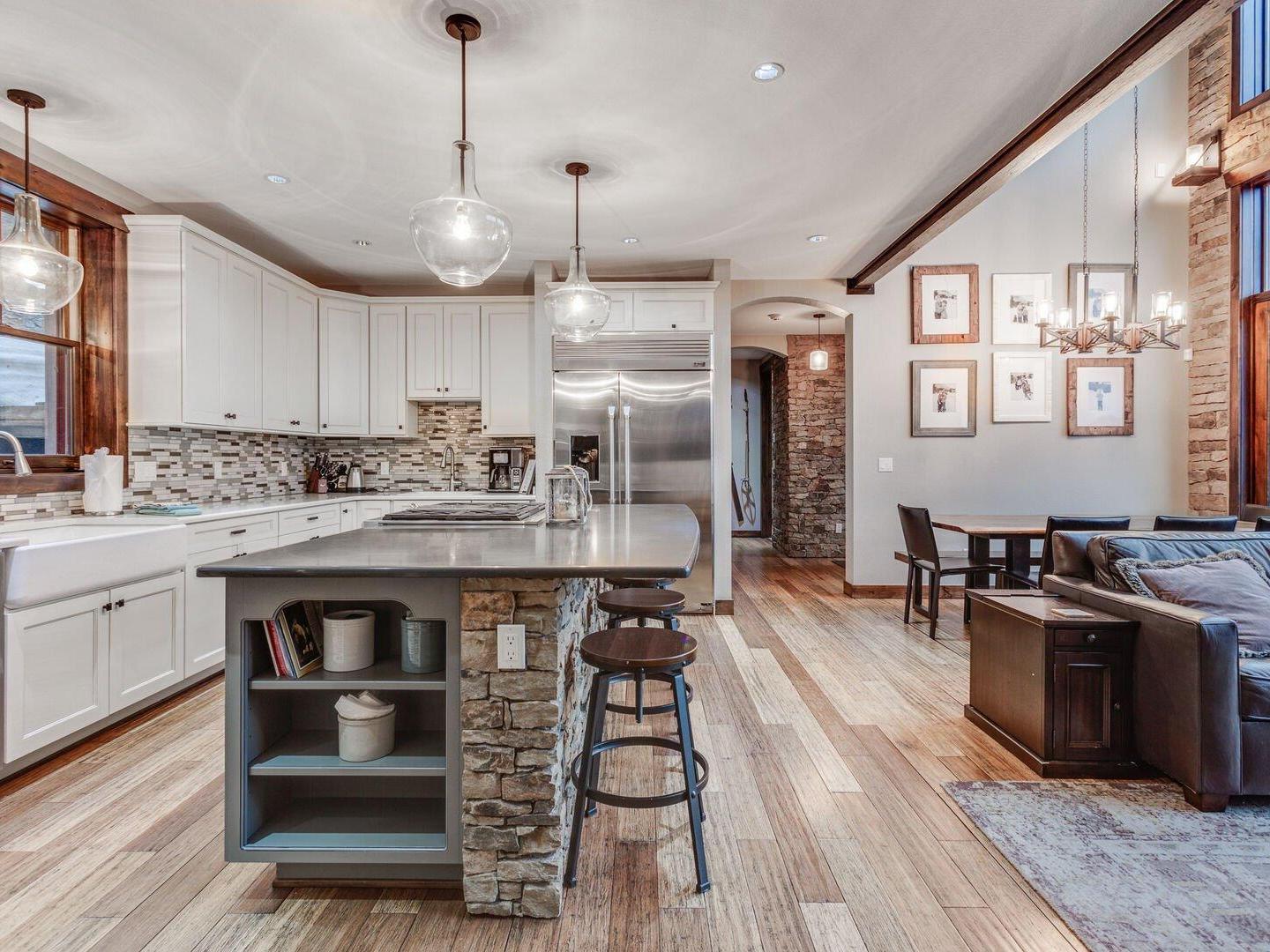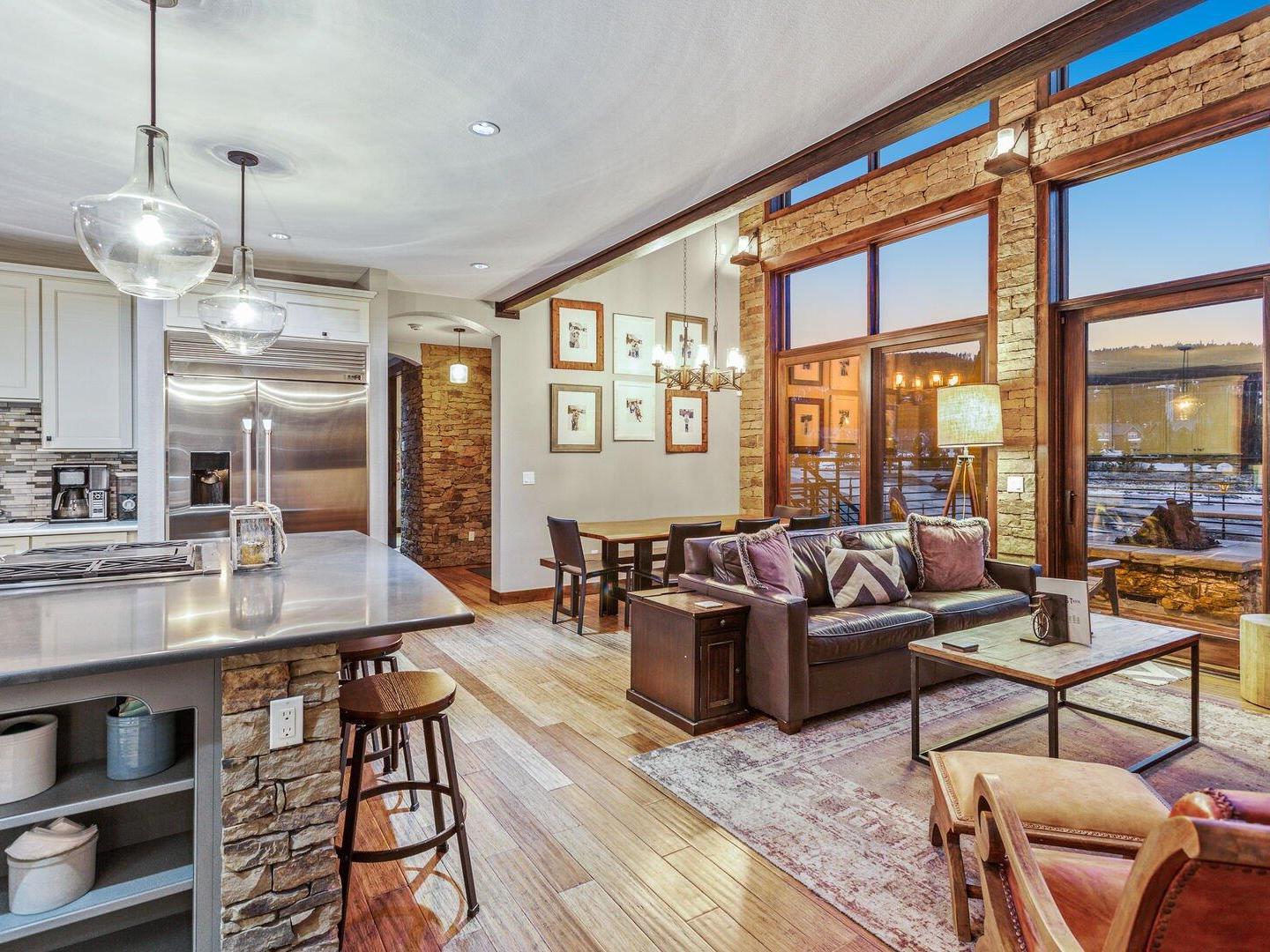 Captivating views of the ski trails pour into the living space through floor-to-ceiling windows in this 4 bedroom, 4 bathroom luxury vacation home featuring a cozy sitting area focused on a gas fireplace and wall-mounted television. Soaring two-story vaulted ceilings create a feeling of infinite space in this open entertainment area with a dining table seating 8 guests and breakfast bar accommodating 4 guests sitting off of the living room. Glass doors in the living room open to the front deck boasting outdoor furnishings around a gas fire pit, built-in barbecue area and private hot tub. Overlooking the living room and dining area, the gourmet kitchen offers a 6-burner gas range with griddle, double ovens and large island.