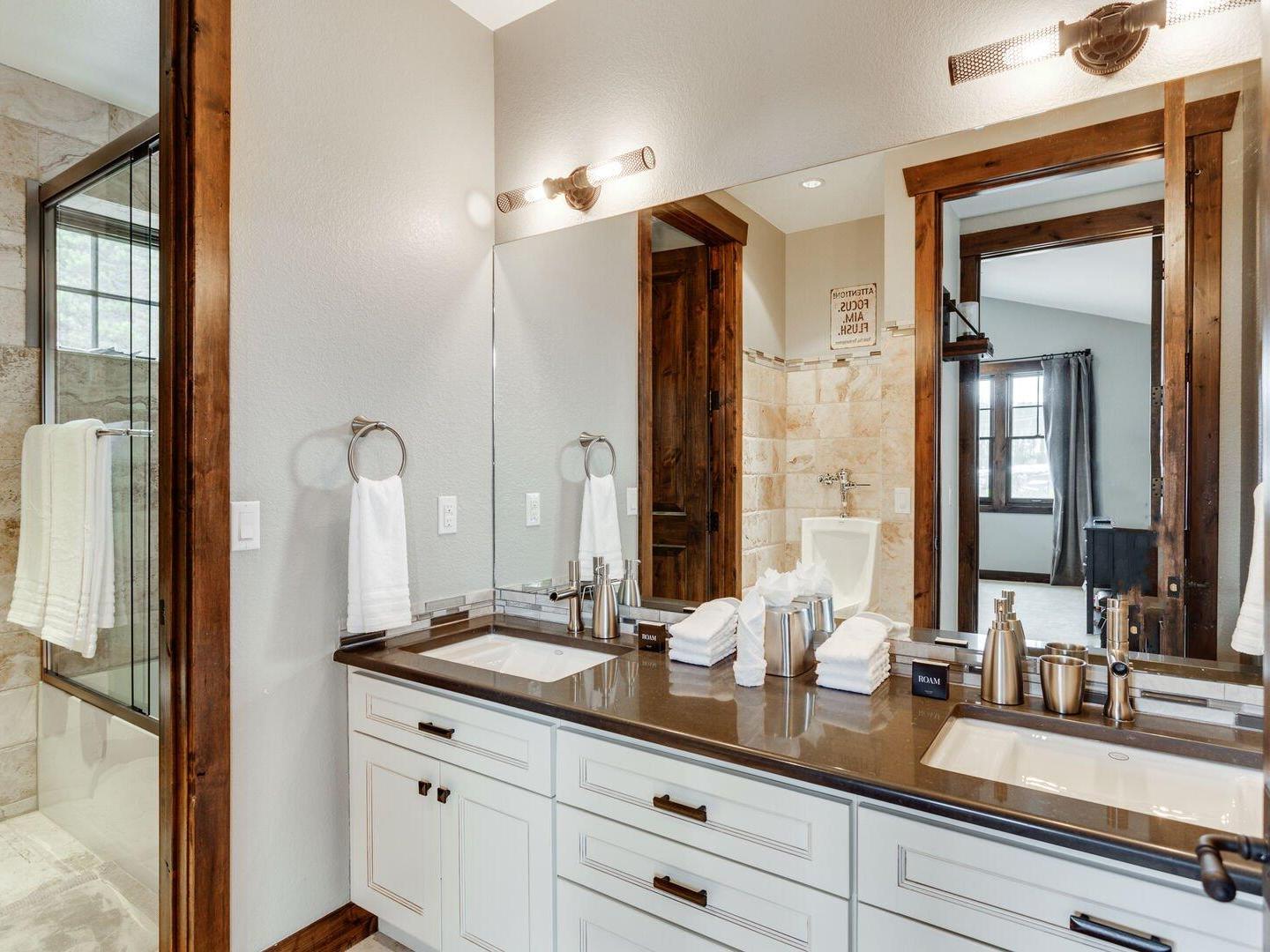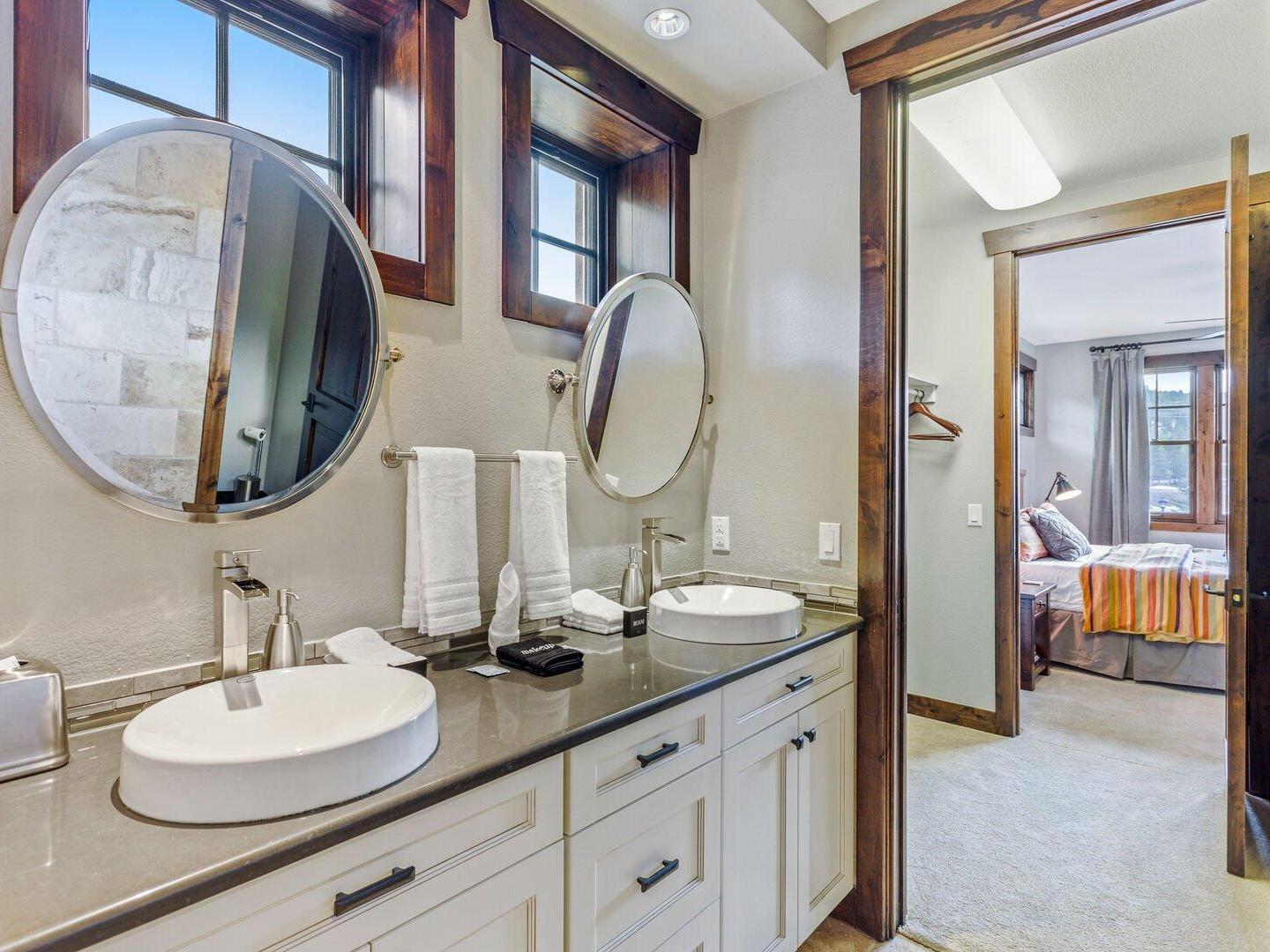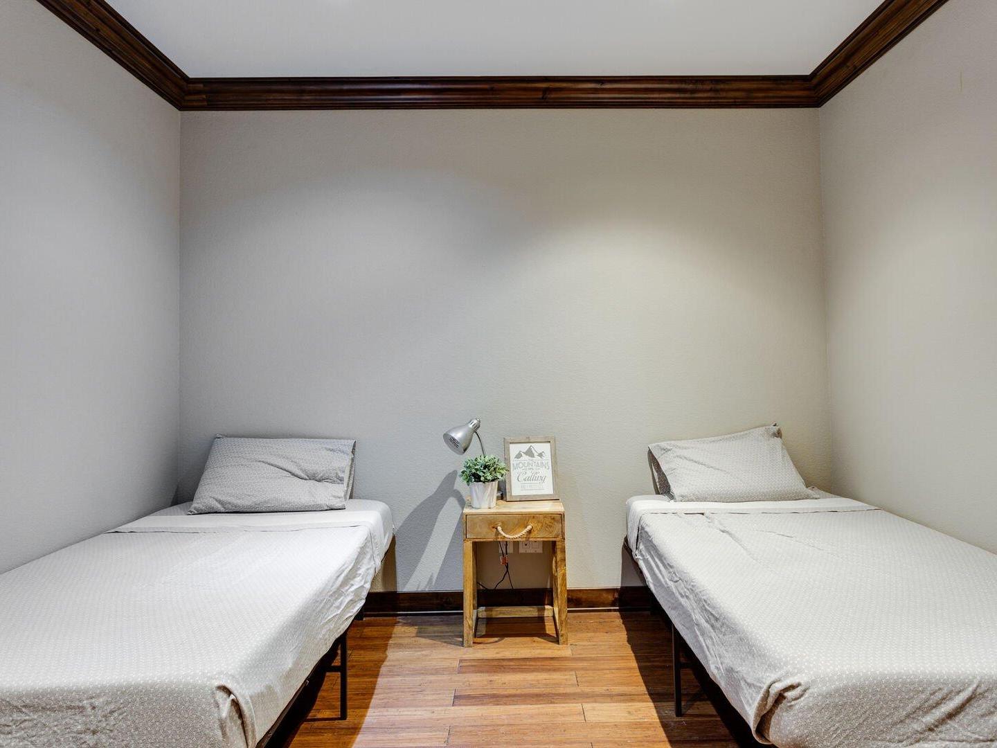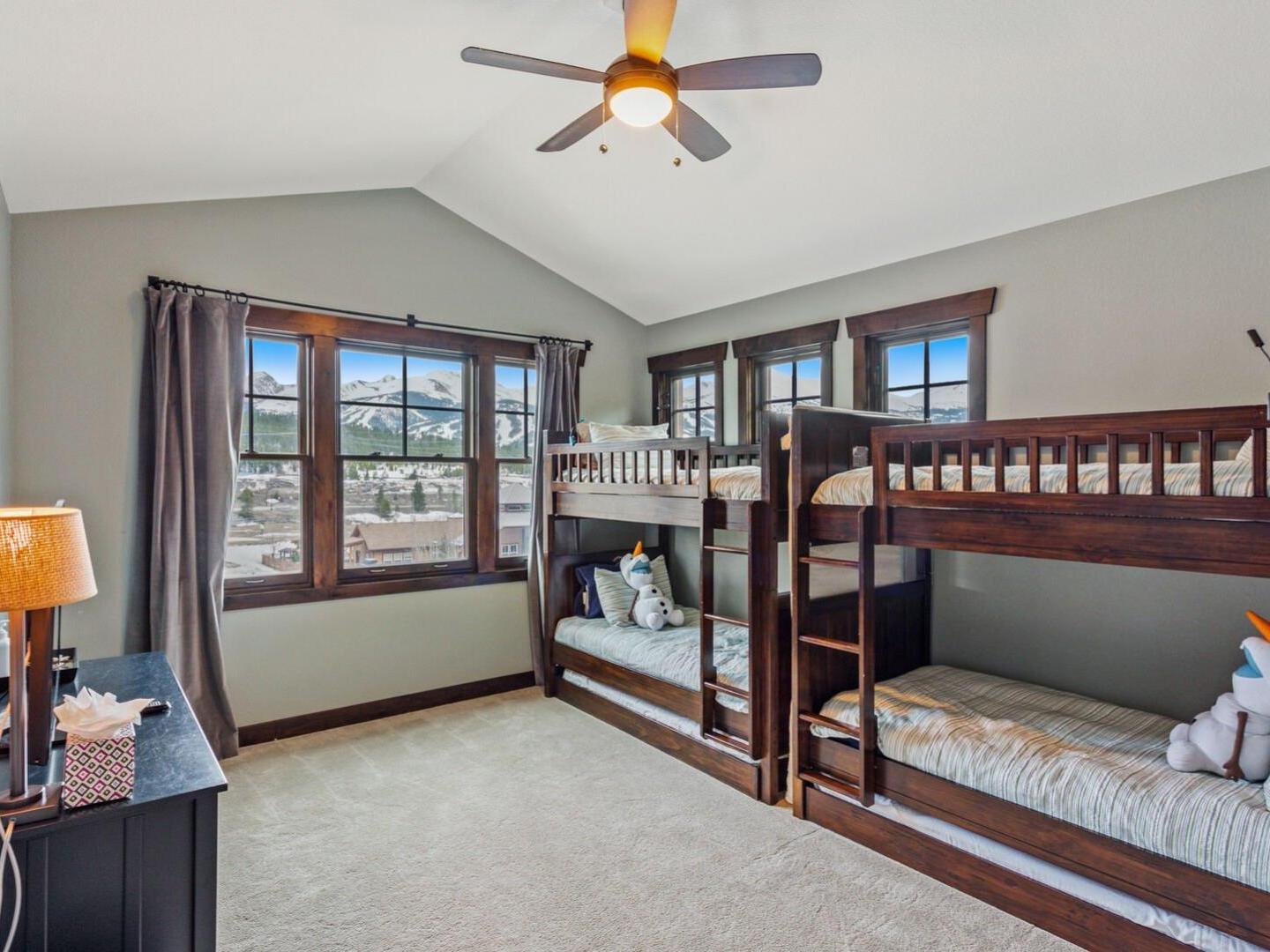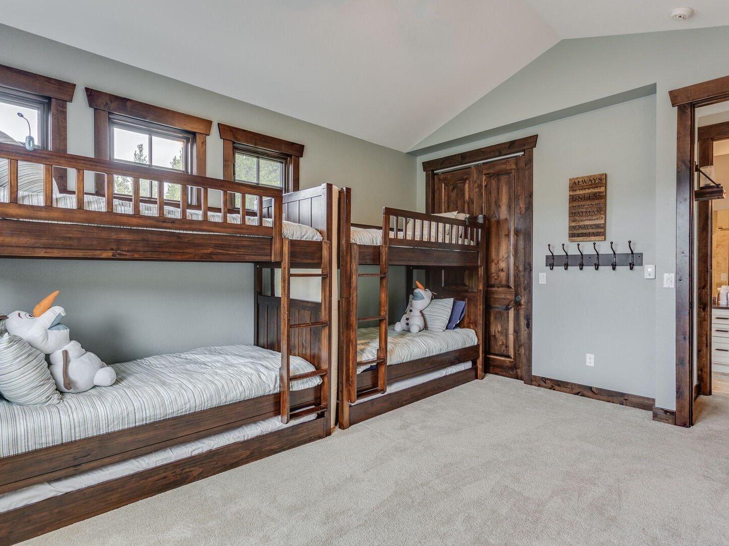 Furnished with a King bed, the upper level primary bedroom includes a private bathroom with a dual-sink vanity, soaking tub and walk-in shower. One guest bedroom is appointed with a King bed and enjoys a private bathroom with a dual-sink vanity and walk-in shower. Two guest bedrooms have attached bathrooms, one offers a Queen bed while the other is ideal for the kids with its two sets of Twin over Twin bunk beds plus two Twin Trundle beds that pull out from underneath.