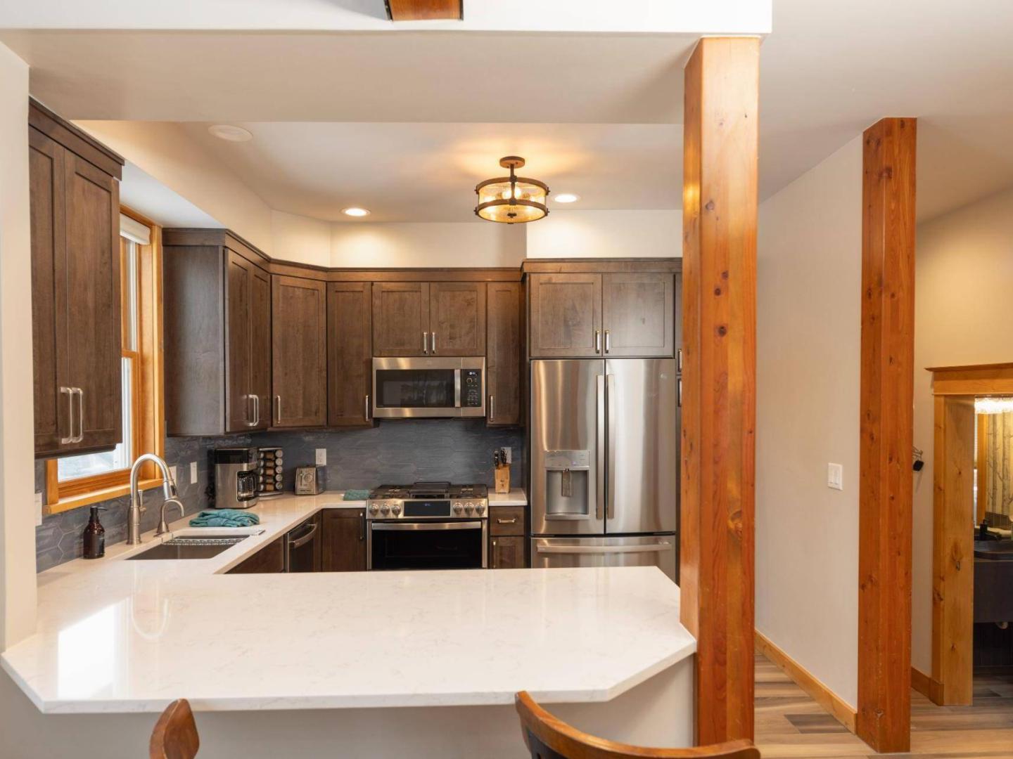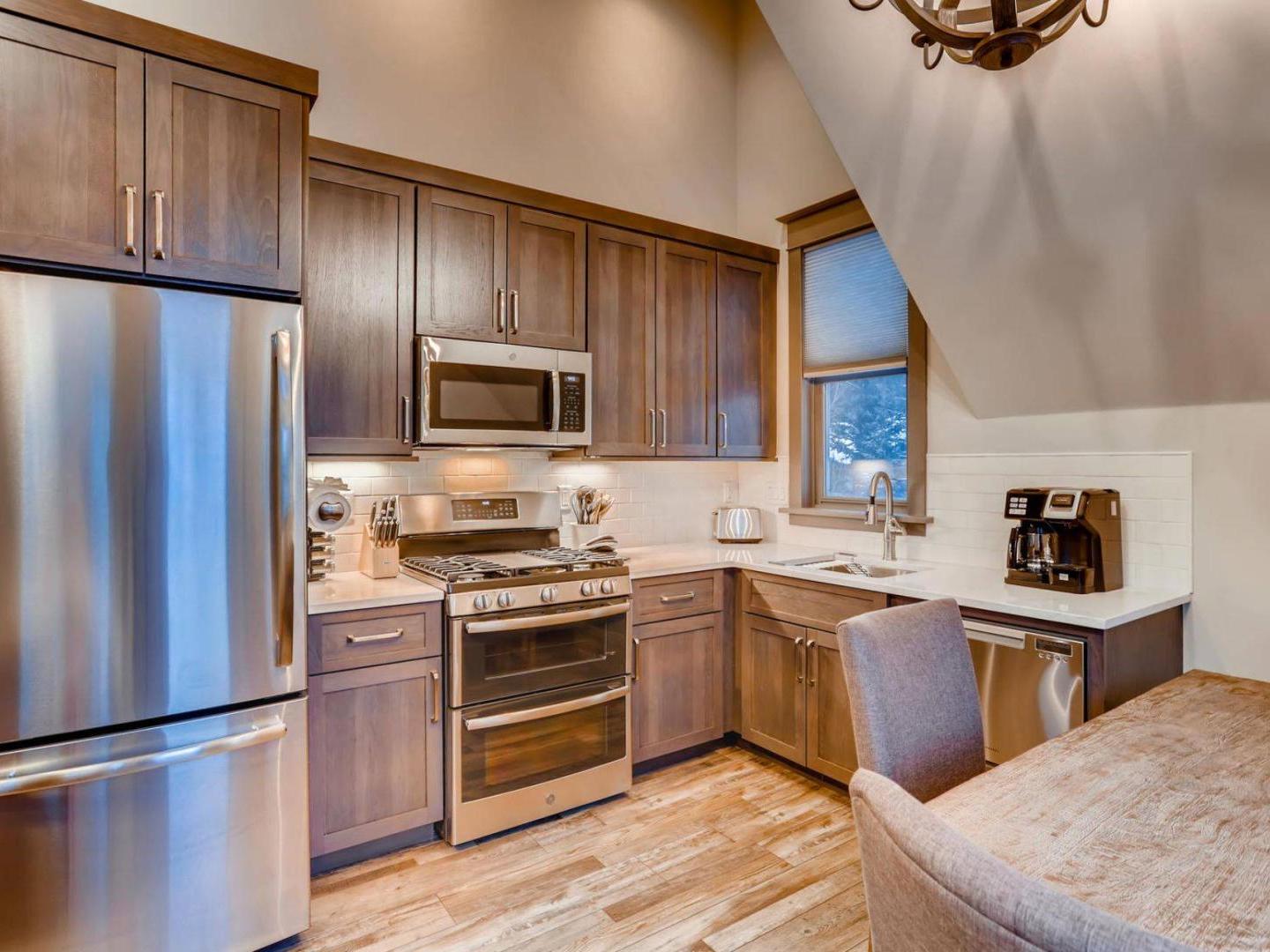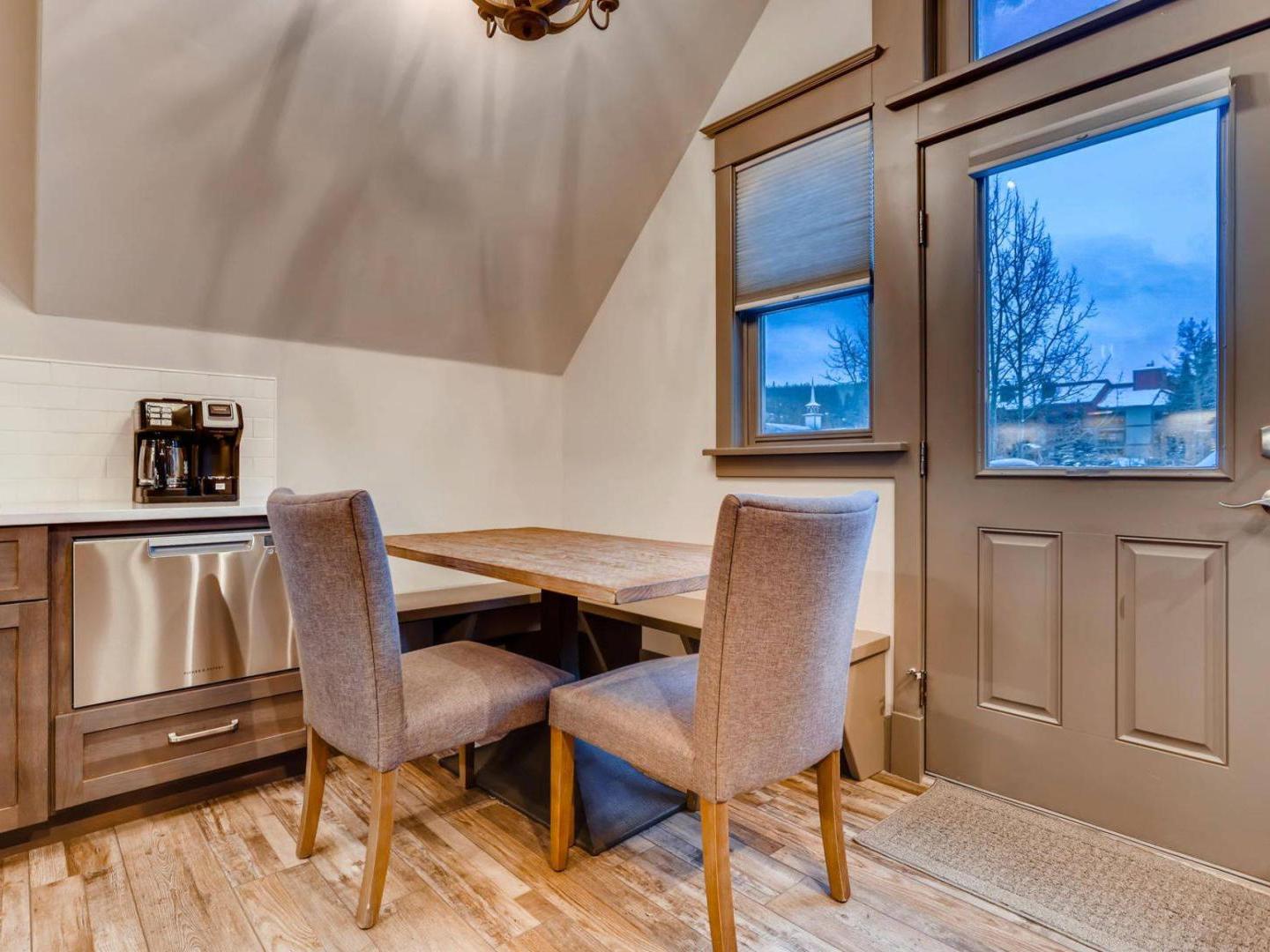 Located on the main level, the focal point of the living room is its built-in wall unit housing a gas fireplace along with a flat screen television. Down a small hallway sits the kitchen, outfitted with stainless steel appliances and a breakfast counter with seating for two guests. A dining room nook is located just off the kitchen featuring a modern wooden table which can accommodate up to eight people for a meal or to simply gather around for a rousing board game session.