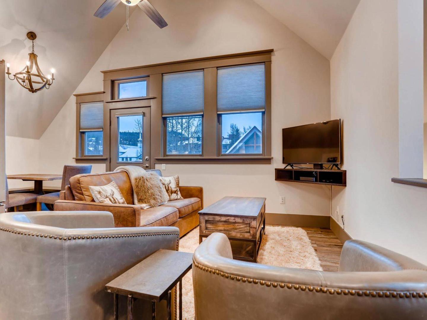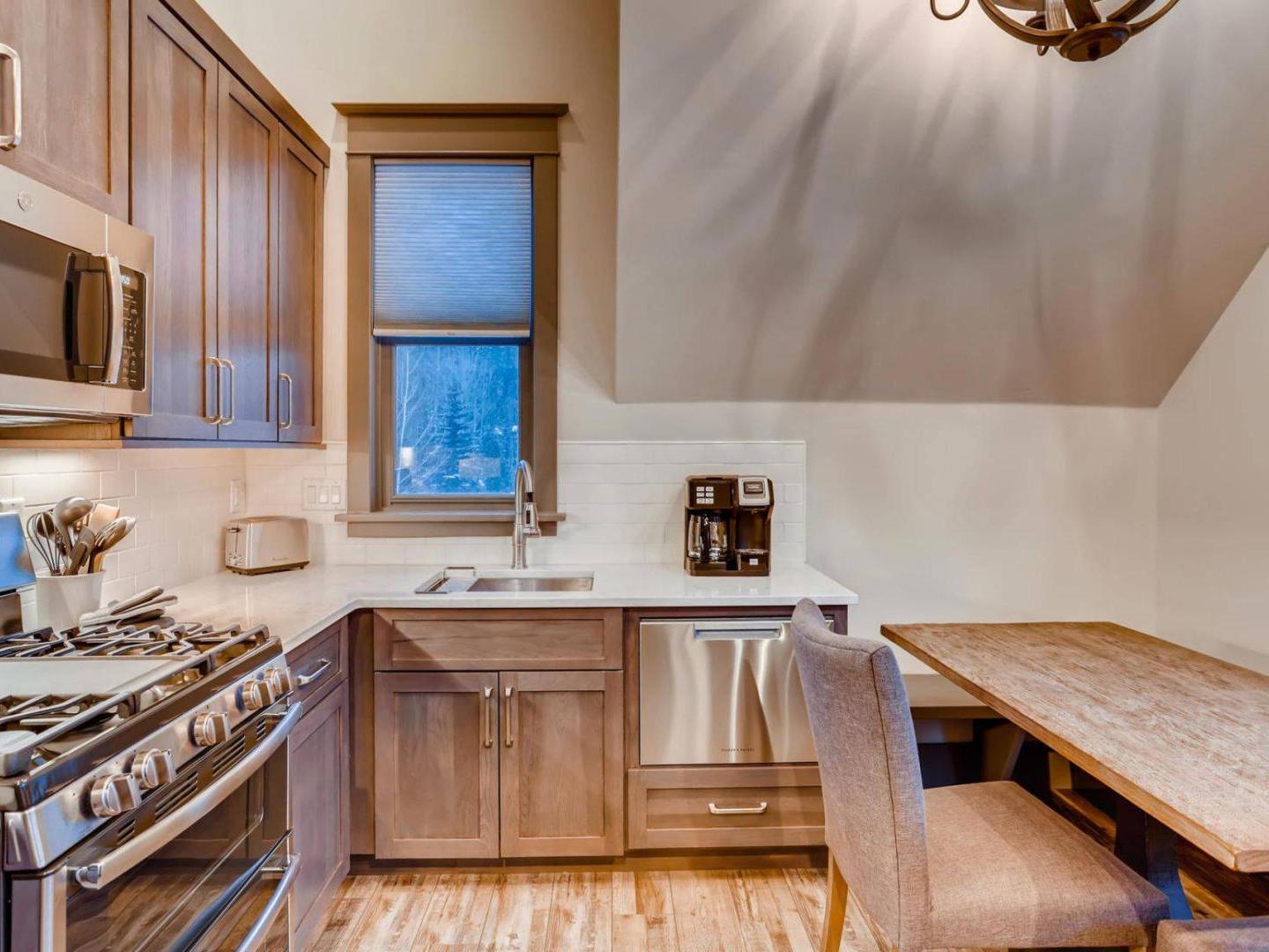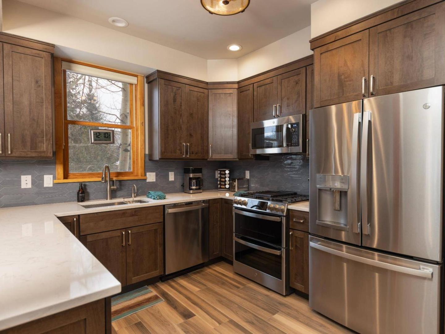 Located on the main level, the focal point of the living room is its built-in wall unit housing a gas fireplace along with a flat screen television. Down a small hallway sits the kitchen, outfitted with stainless steel appliances and a breakfast counter with seating for two guests. A dining room nook is located just off the kitchen featuring a modern wooden table which can accommodate up to eight people for a meal or to simply gather around for a rousing board game session.