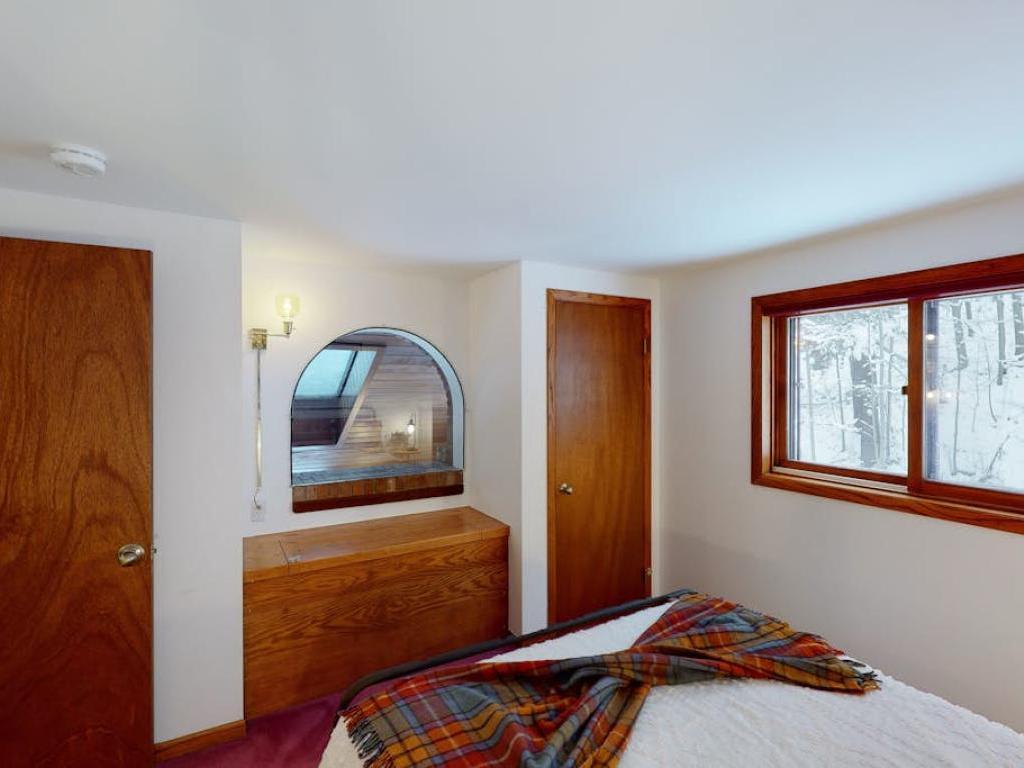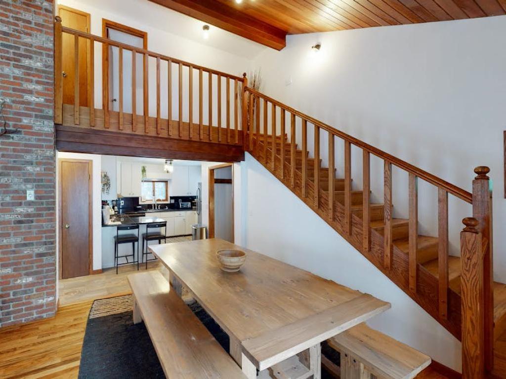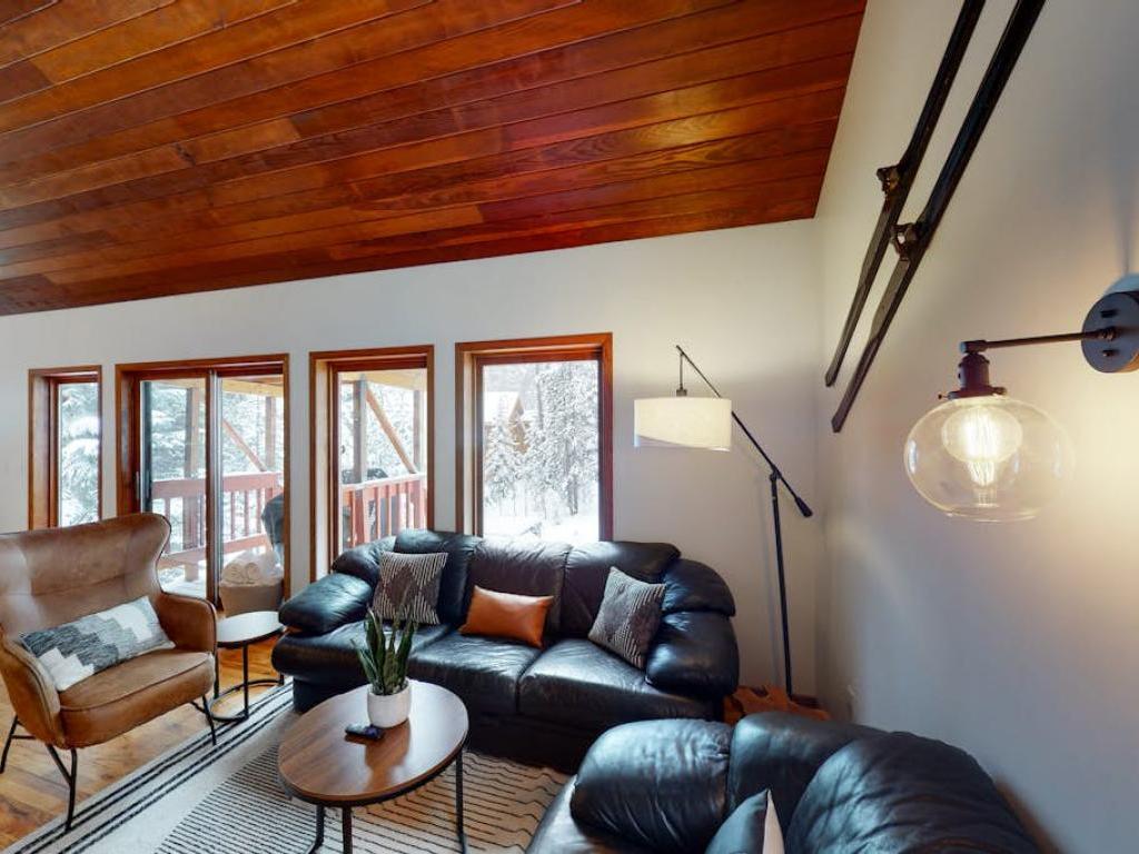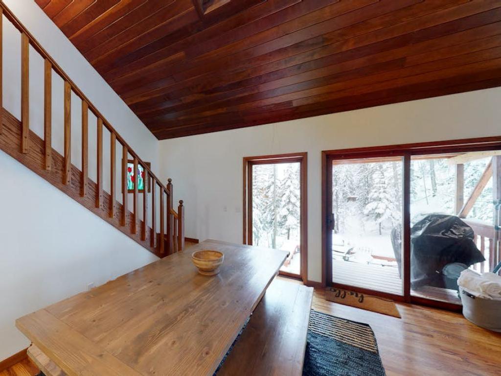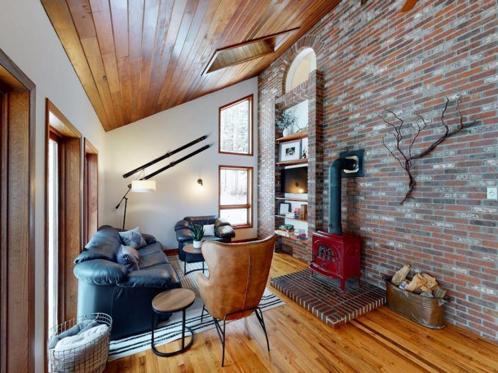 Relax in front of the wood-burning stove and wall-mounted television in the cozy living room of this 3 bedroom, 3 bathroom vacation home set under a vaulted ceiling and framed by a wall of windows. Retreat to the lower level den to play a board game, watch a movie or read a book on the comfortable chair and Queen sleeper sofa that provides additional sleeping accommodations. A full bathroom is located on the lower level.