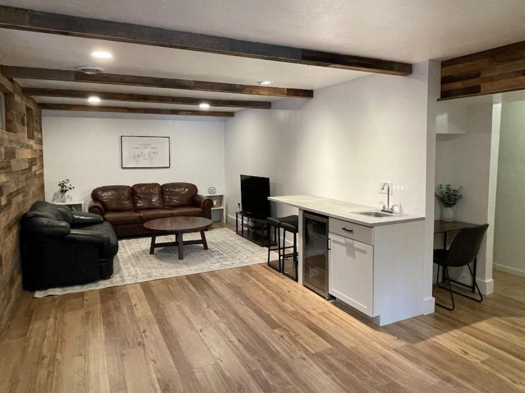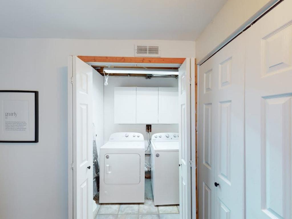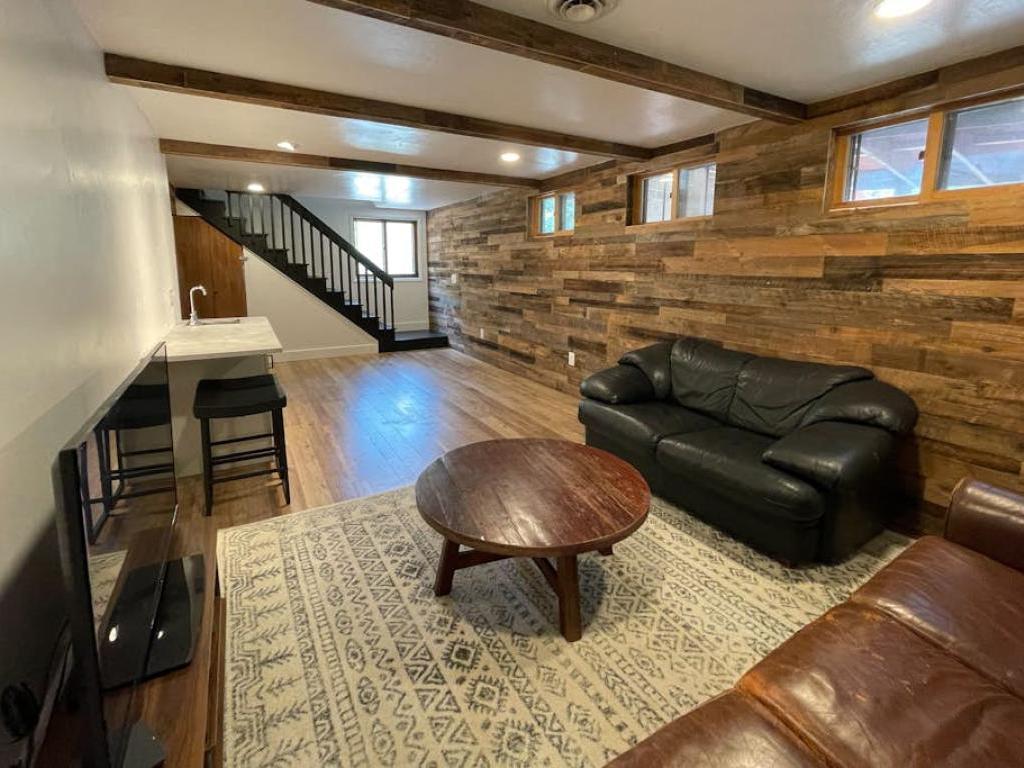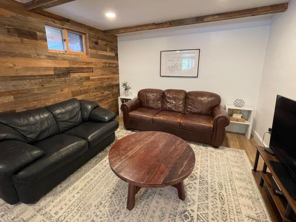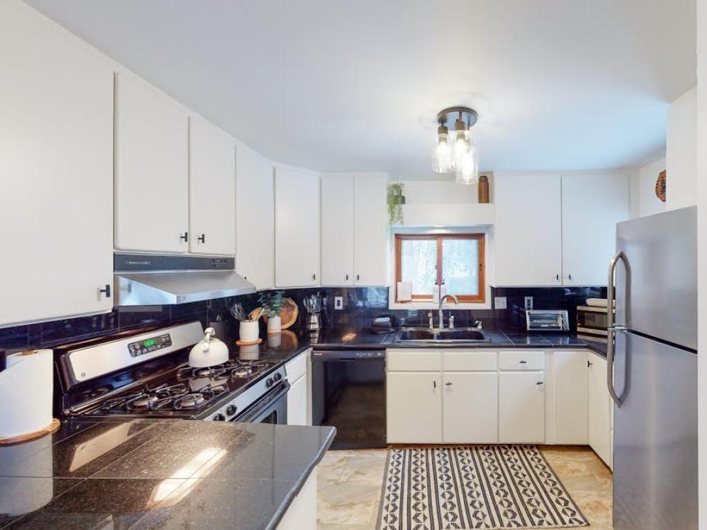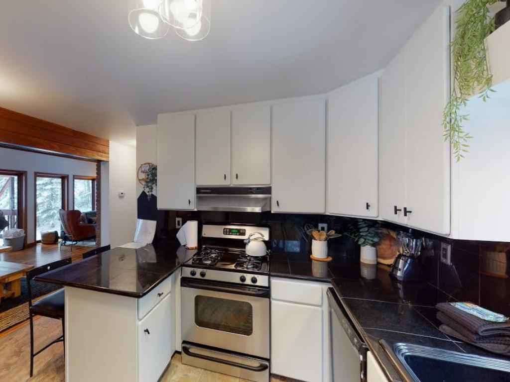 Relax in front of the wood-burning stove and wall-mounted television in the cozy living room of this 3 bedroom, 3 bathroom vacation home set under a vaulted ceiling and framed by a wall of windows. Retreat to the lower level den to play a board game, watch a movie or read a book on the comfortable chair and Queen sleeper sofa that provides additional sleeping accommodations. A full bathroom is located on the lower level.