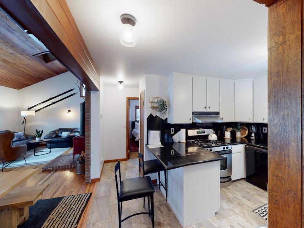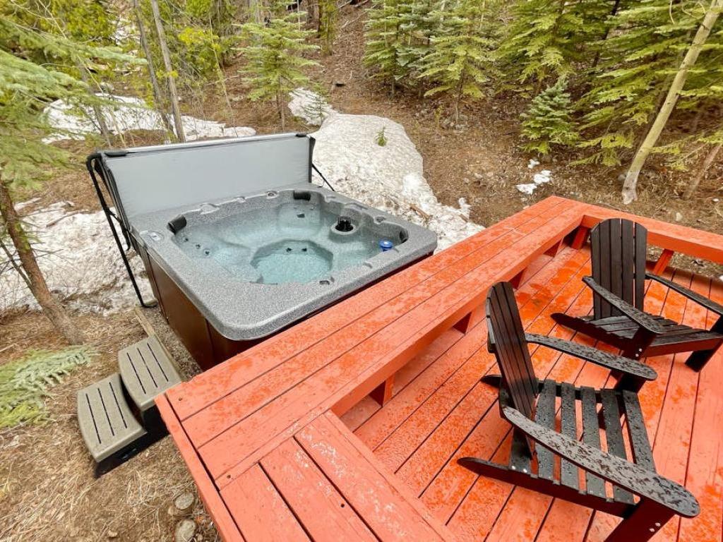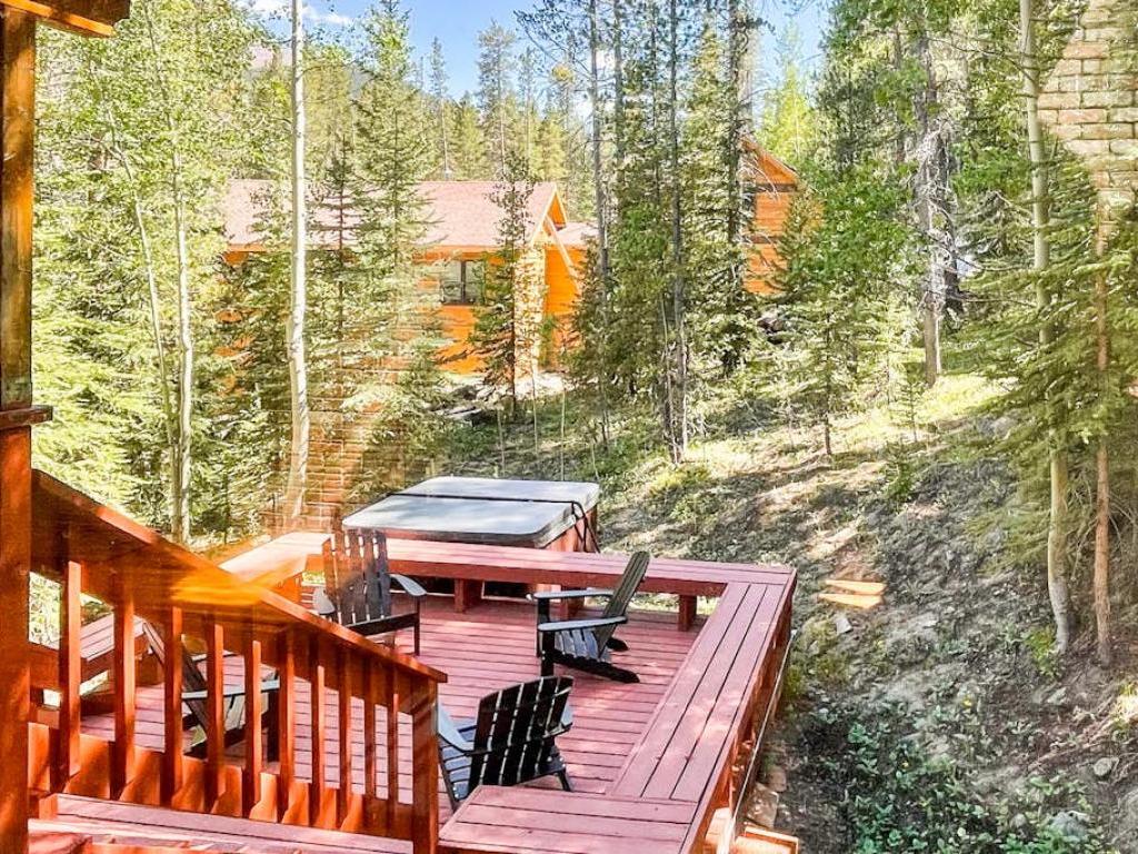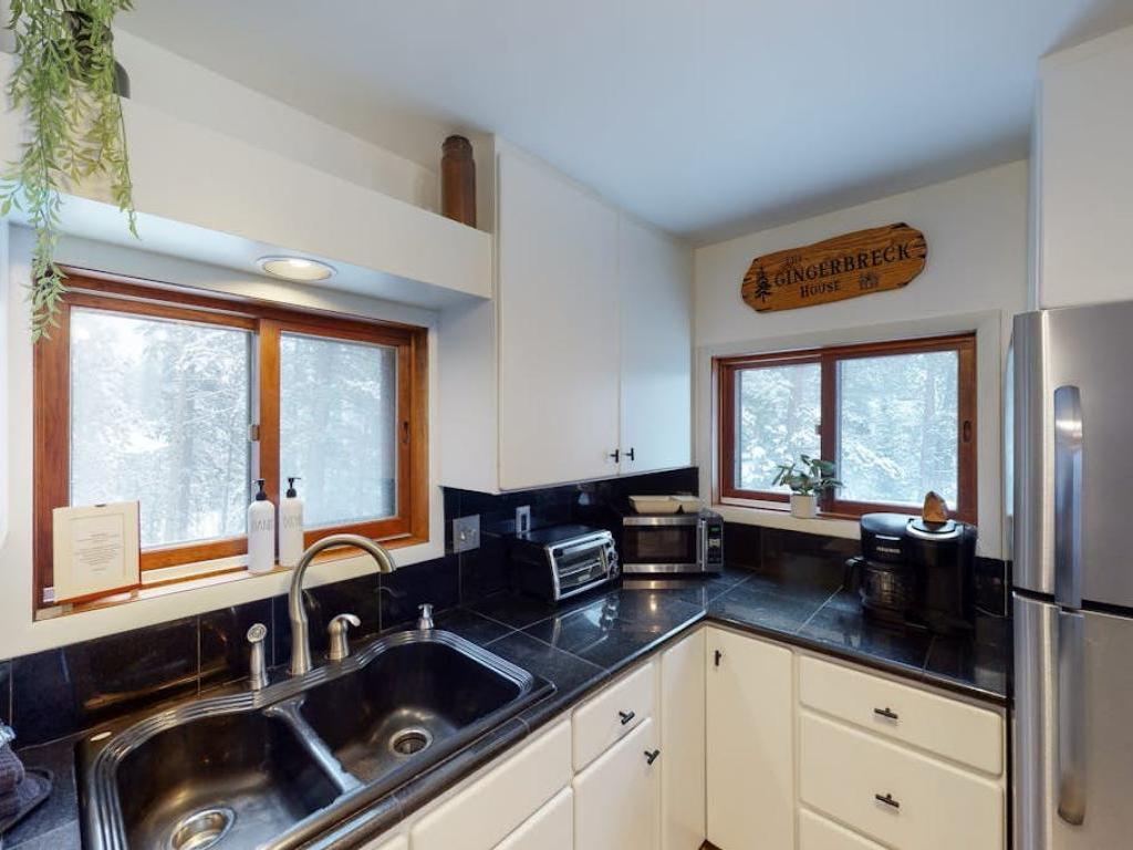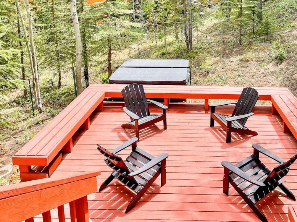 Chefs in the group will appreciate the fully equipped kitchen offering all of the essential appliances for preparing tasty meals throughout your vacation. Just off of the living room is a picnic-style table and benches that joins the living room, dining area and kitchen into an open gather space for the entire group to entertain. Step out of the glass doors in the living room to grill up a meal or soothe the muscles in the private hot tub nestled in the forest.