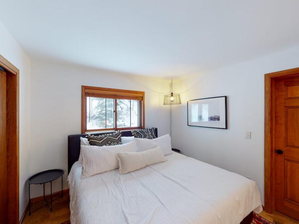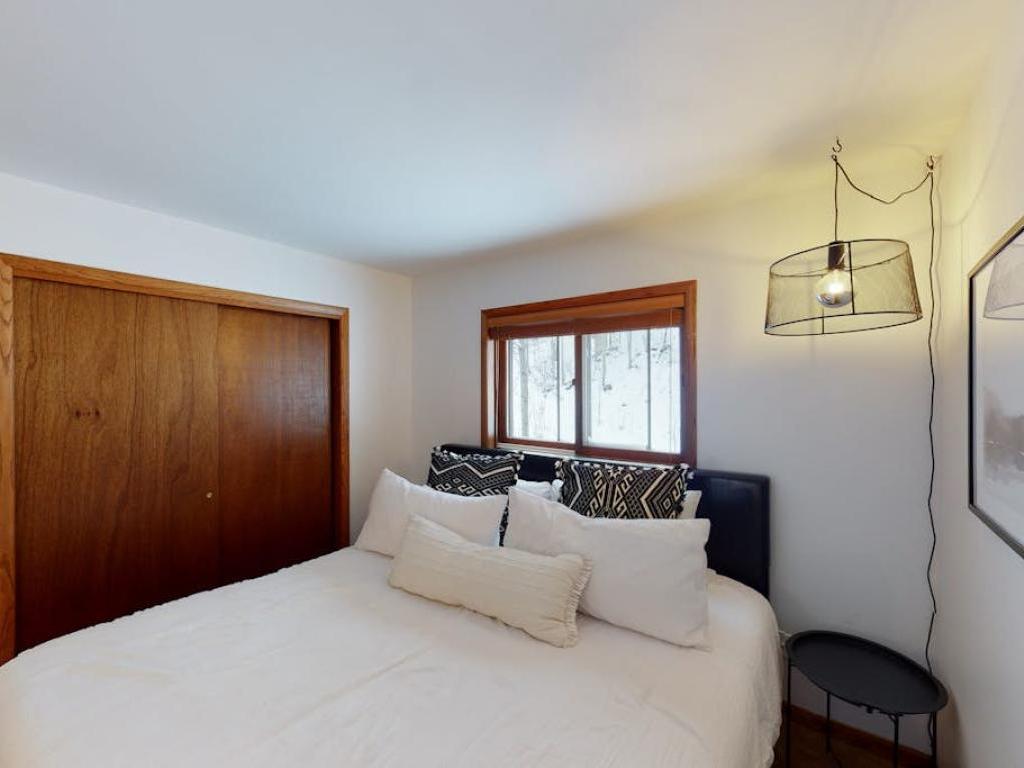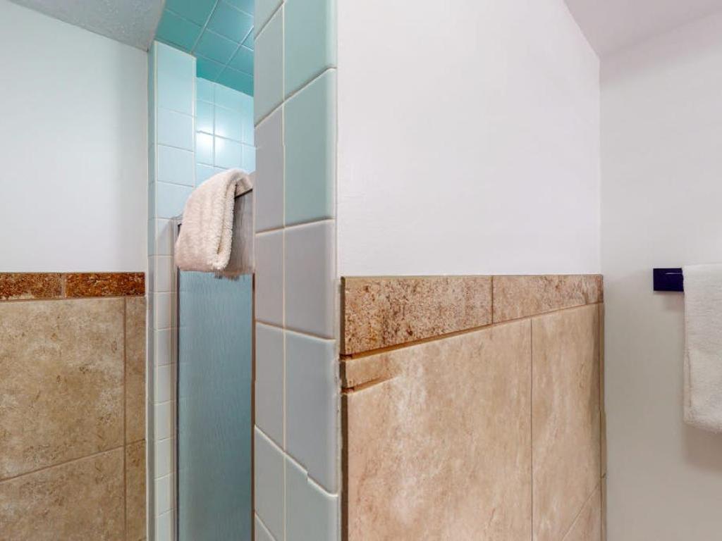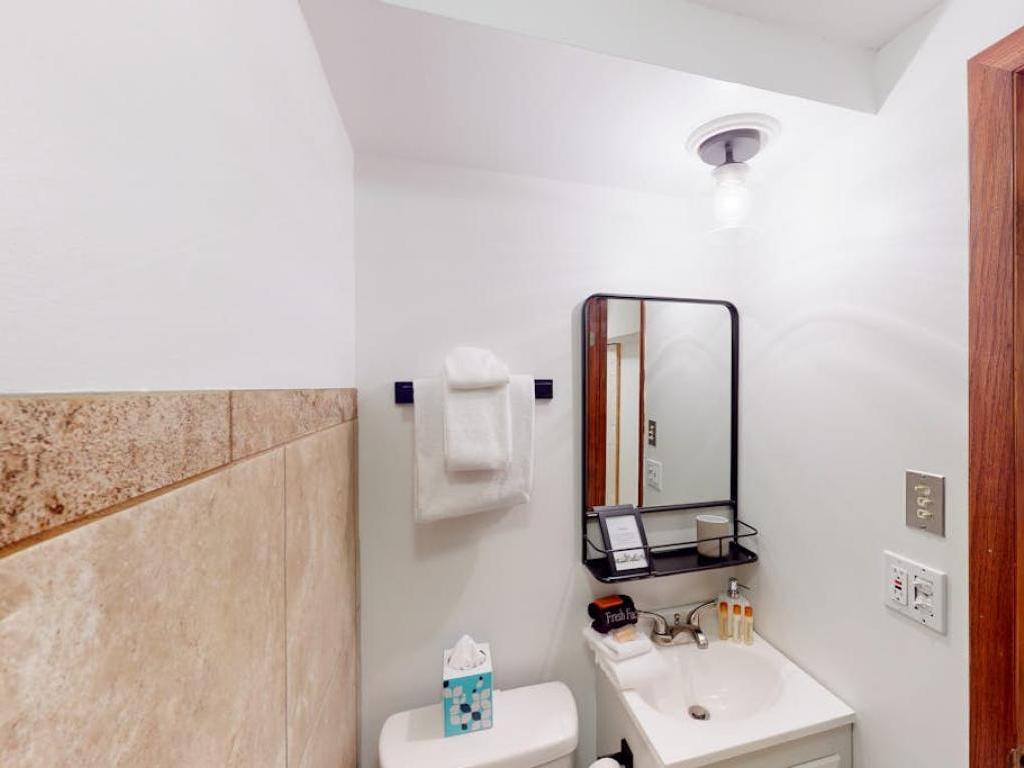 Furnished with a King bed, the primary bedroom sits off of the living area and accesses the full bathroom shared with the living room. Two upper level guest bedrooms share a full bathroom, both are appointed with Queen beds.
