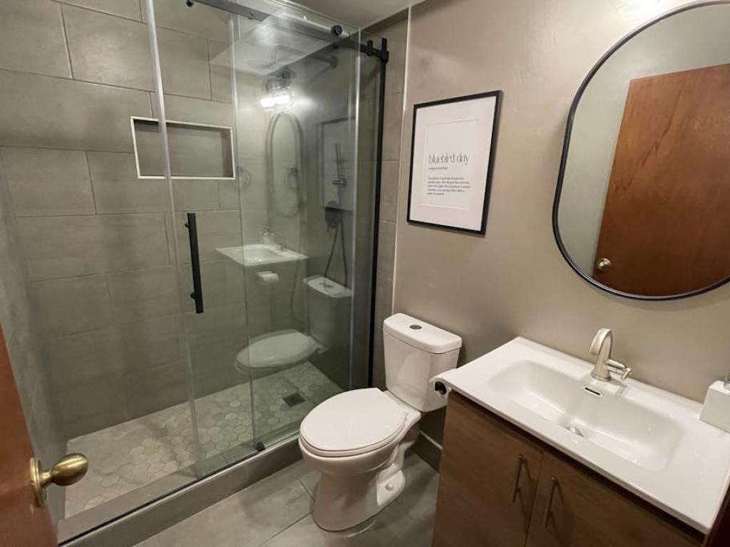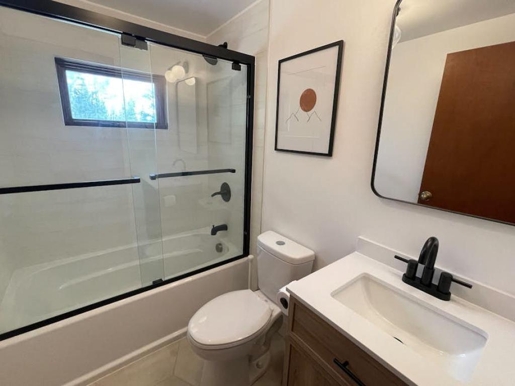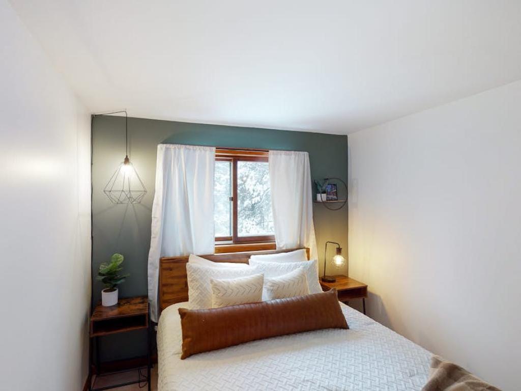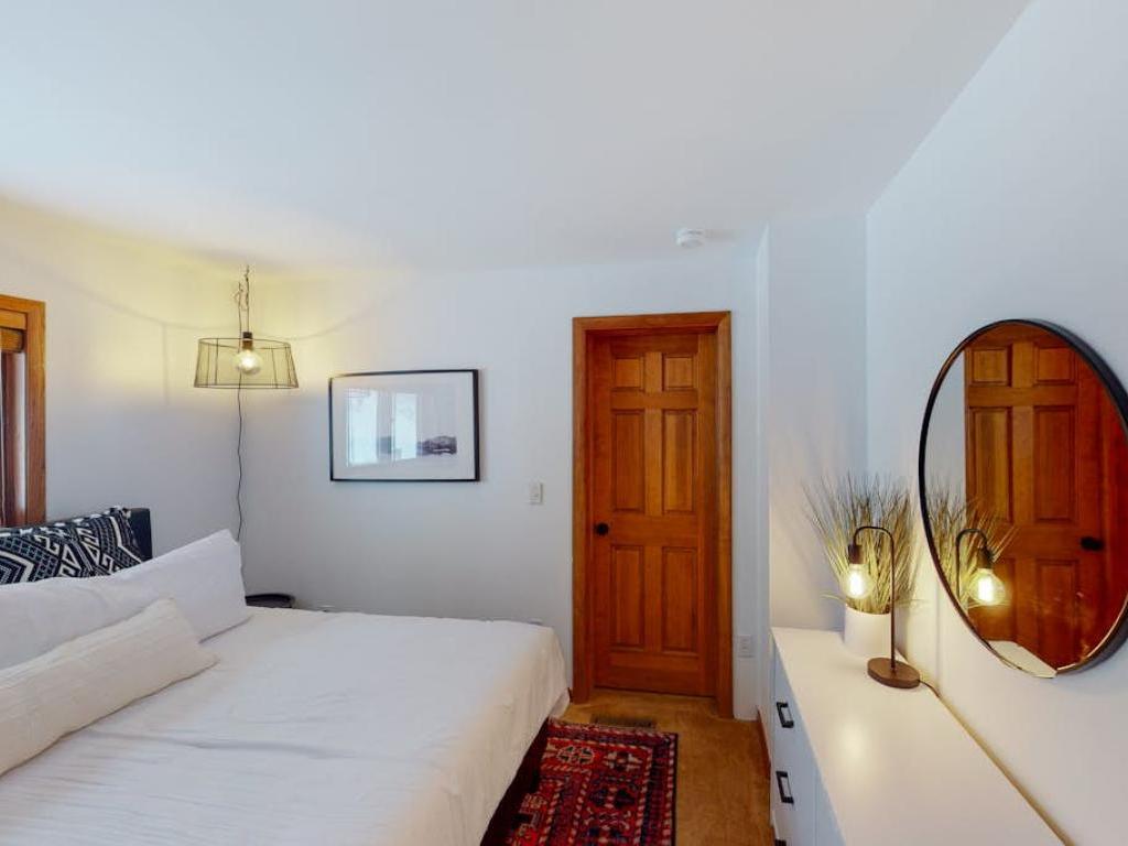 Furnished with a King bed, the primary bedroom sits off of the living area and accesses the full bathroom shared with the living room. Two upper level guest bedrooms share a full bathroom, both are appointed with Queen beds.