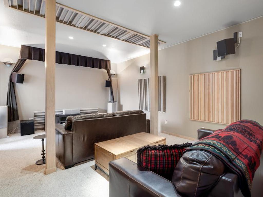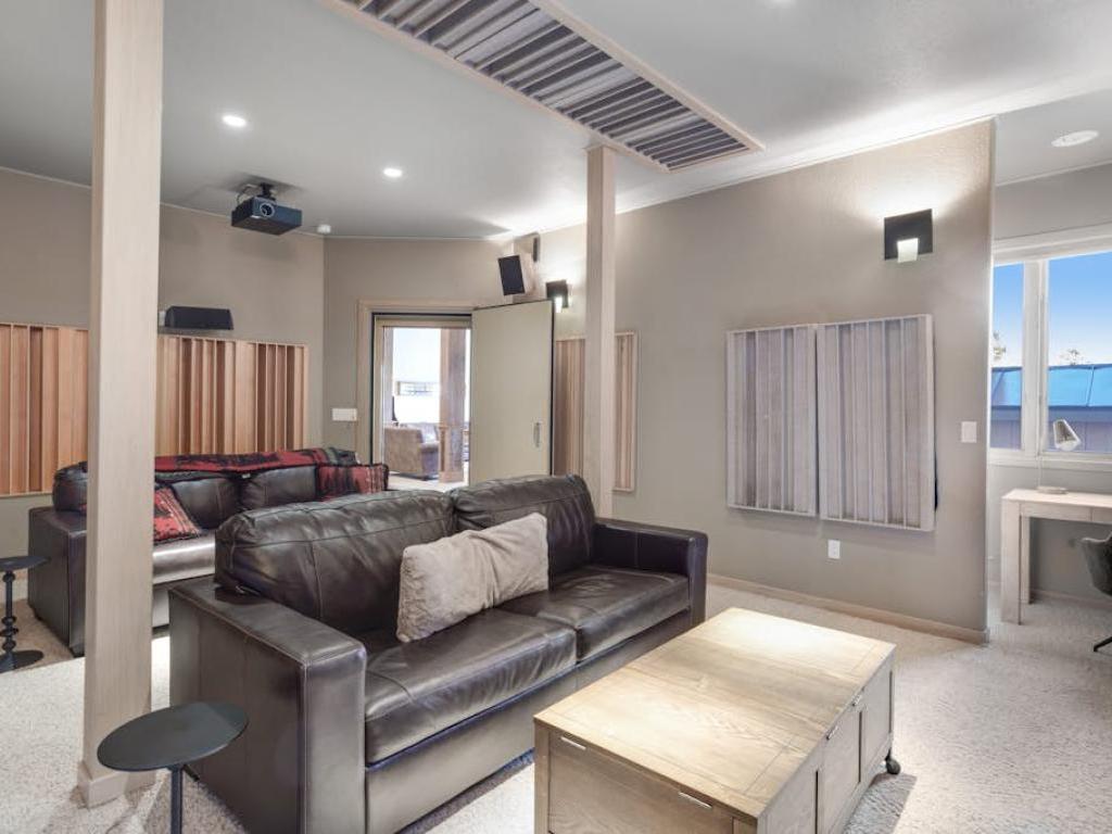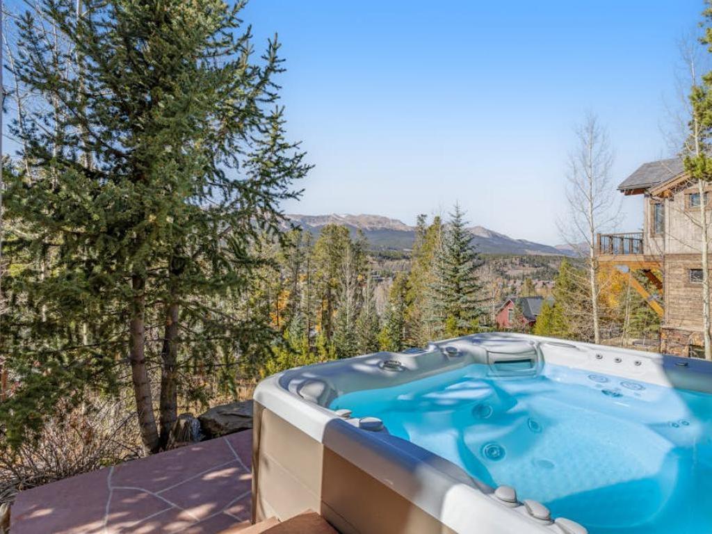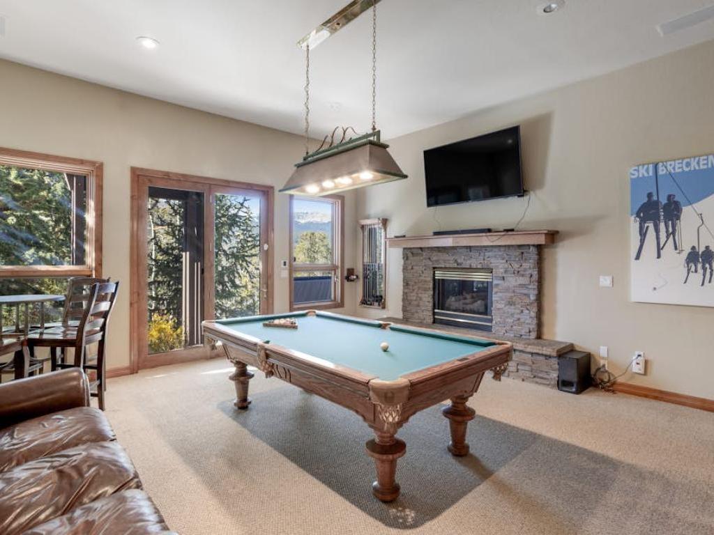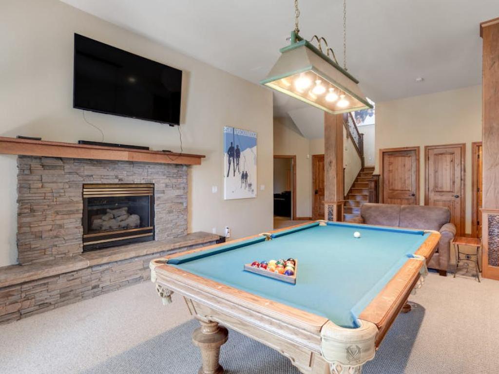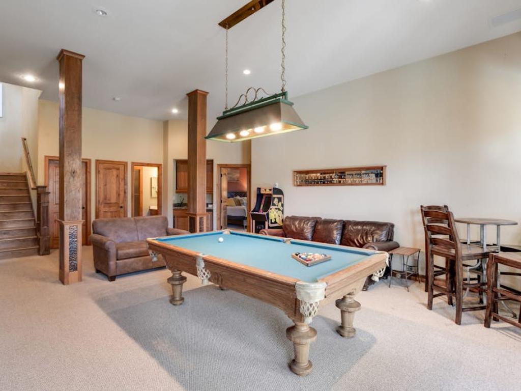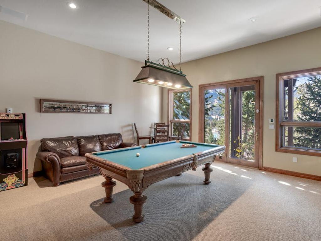 Hours of entertainment are certain to be enjoyed on the lower level of the residence. Boasting a pool table, wet bar, gas fireplace and leather furnishings, the family room is the centerpiece of the lower level. Off the family room is a theater room with a large projection screen, leather sofas in a stadium set-up, and some goodies for the kids. Step out back to find the custom hot tub set into the hillside and overlooking the mountains, the most inviting space to relax after a day of mountain adventure.