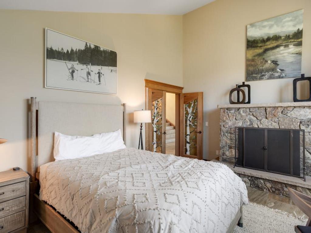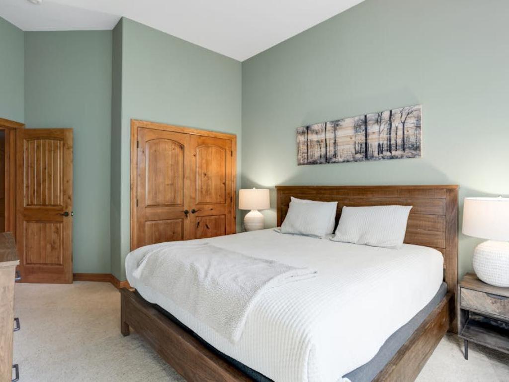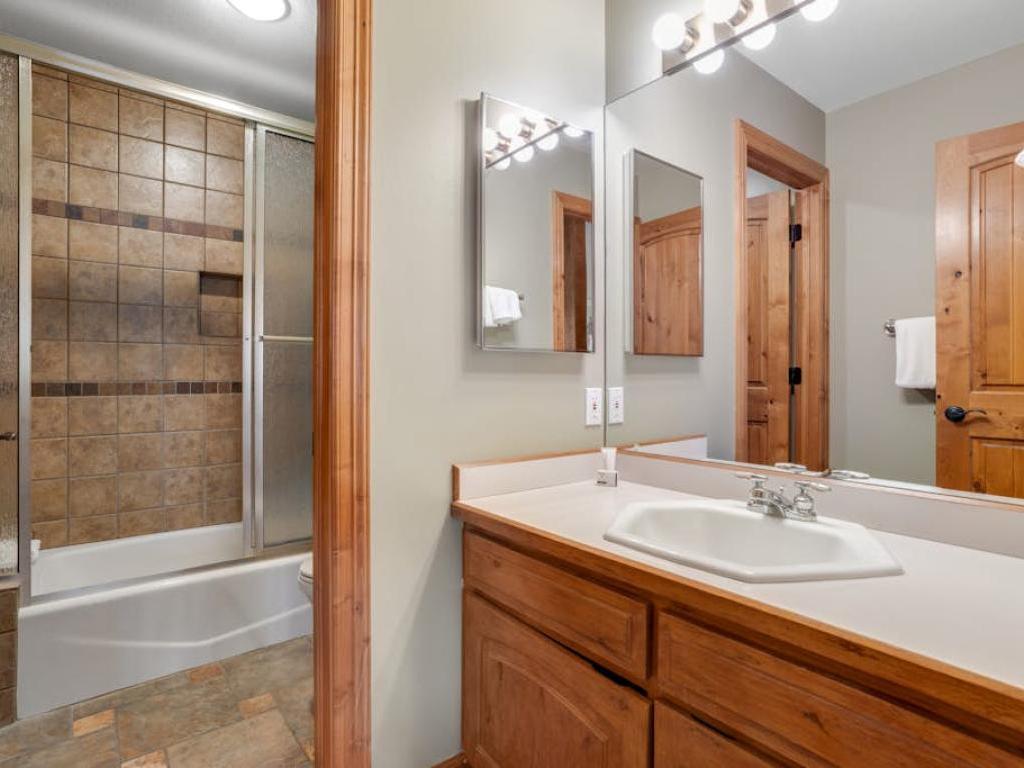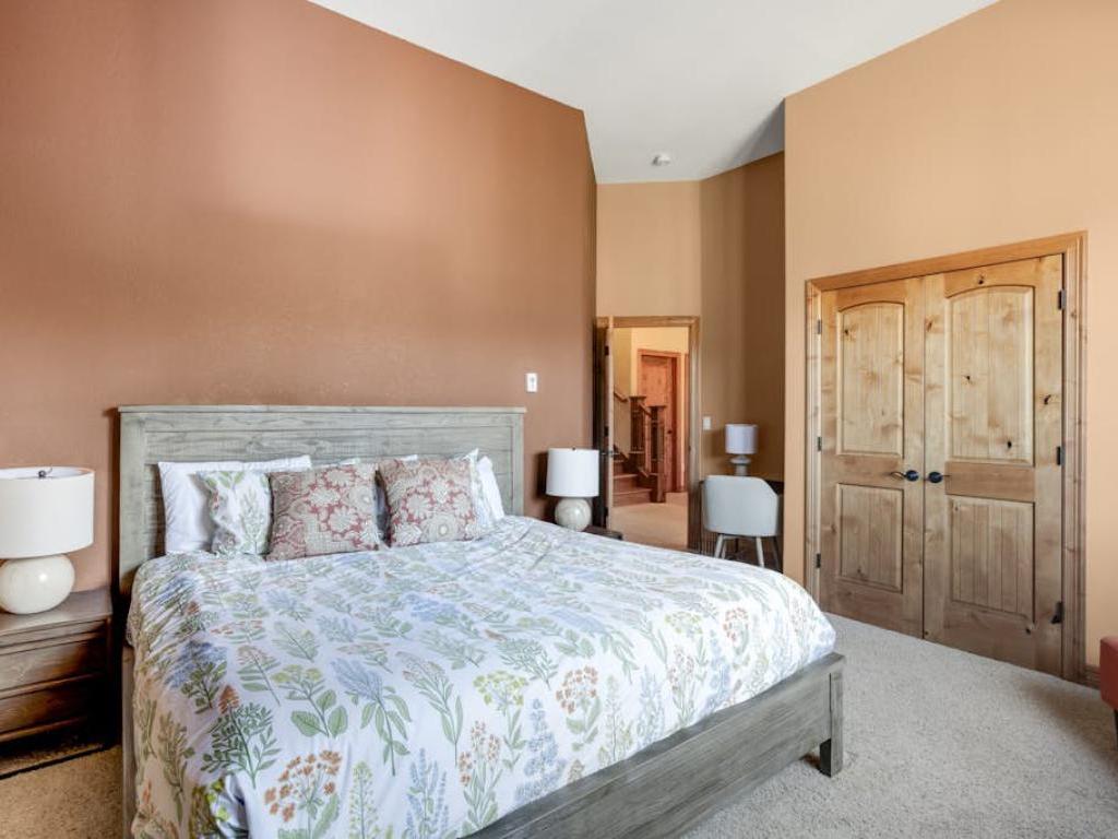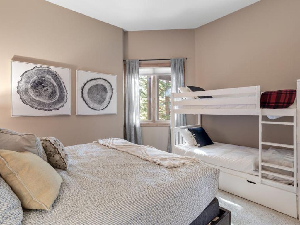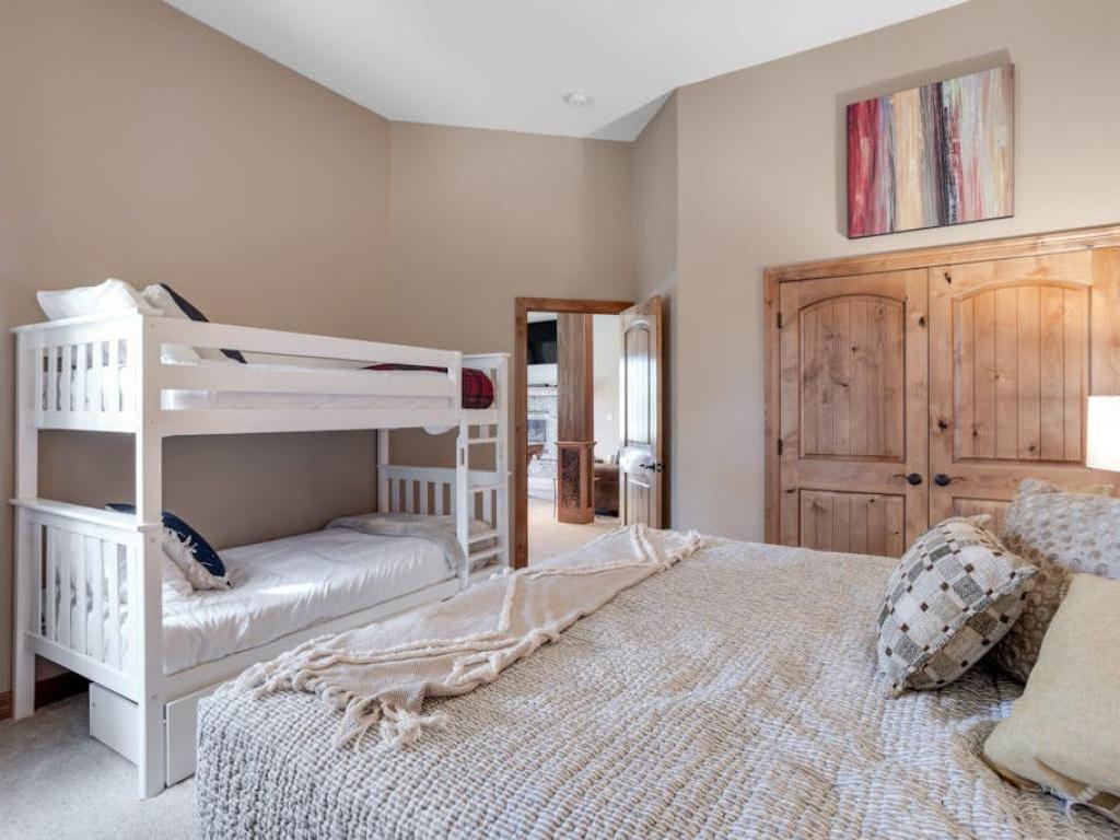 Occupying the upper level of the residence, the primary bedroom is furnished with a King bed, sitting area, and a private bathroom with a dual sink vanity, soaking tub, and walk-in shower. Off of the living room, the main level guest bedroom is outfitted with a Queen bed, gas fireplace, and accesses the half bathroom in the entryway. Three guest bedrooms on the lower level share a full bathroom with the family room. Two of the lower level bedrooms are equipped with Queen beds while the third has a Queen bed and a Twin Bunk bed.