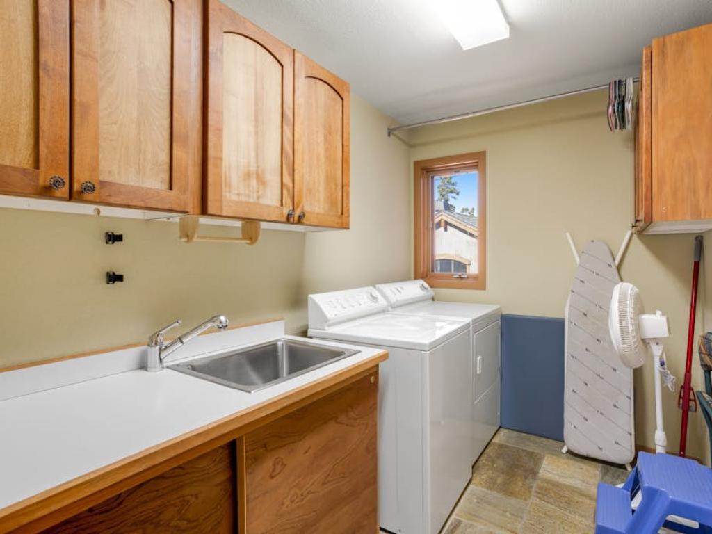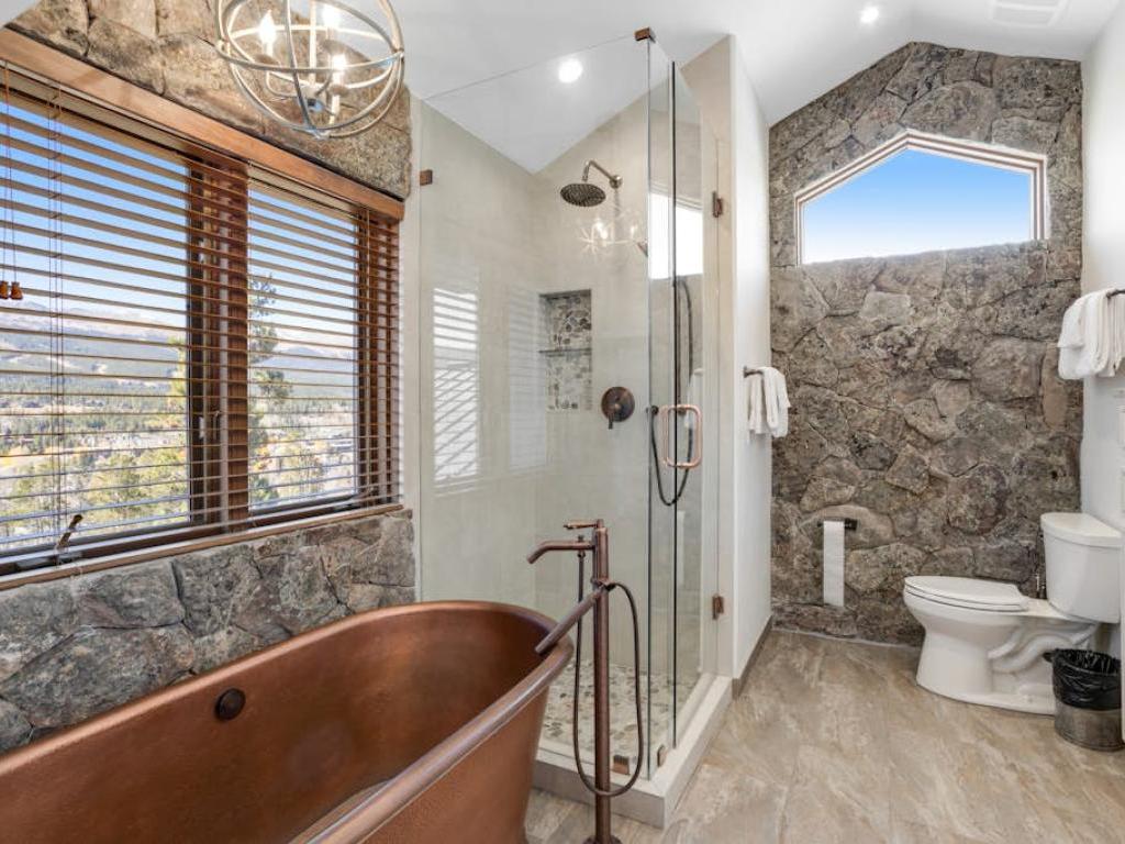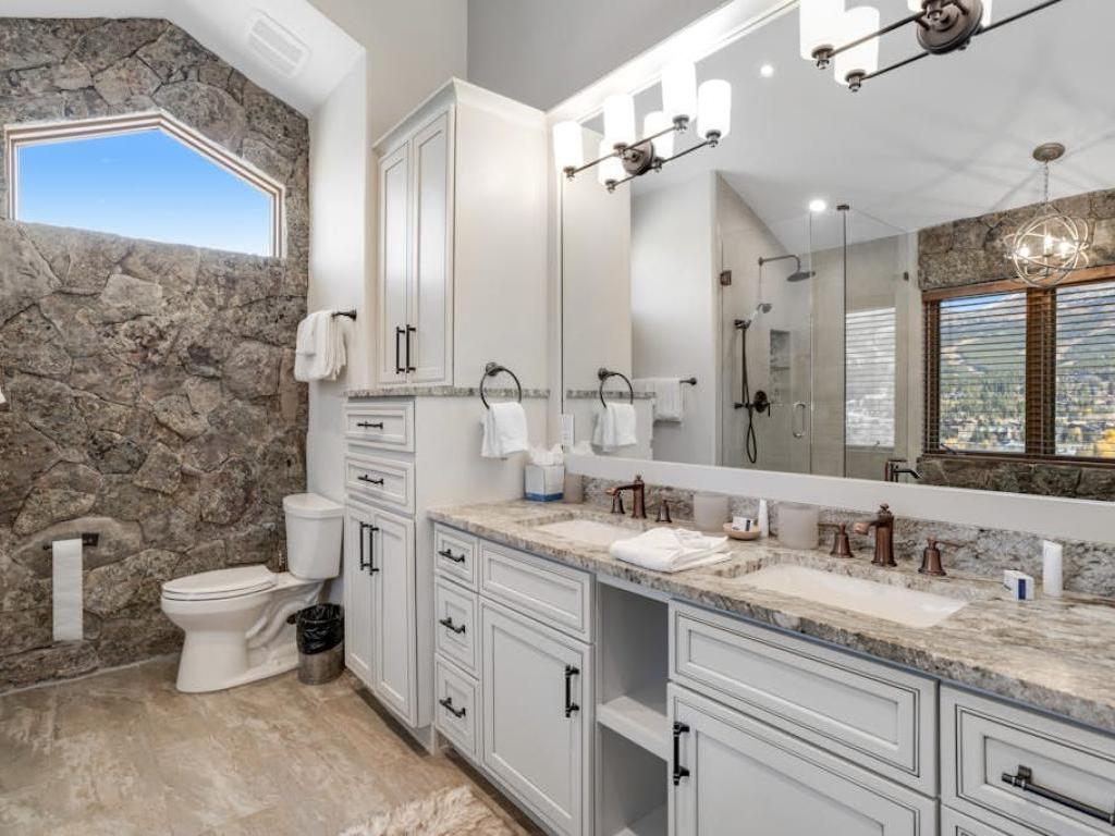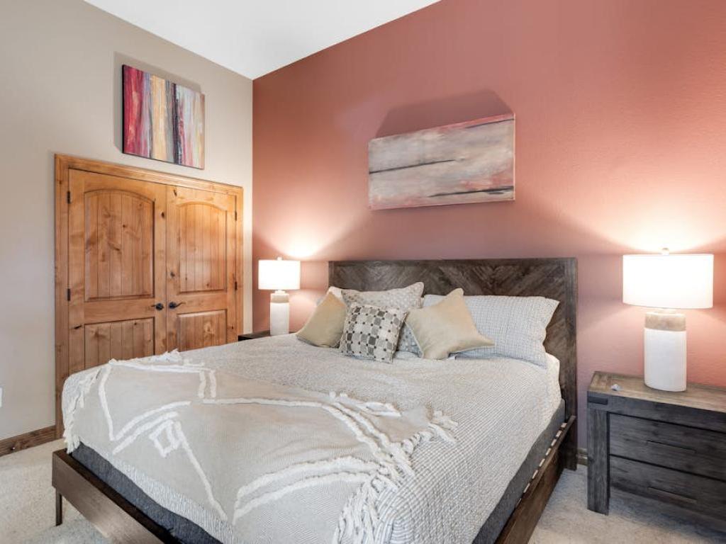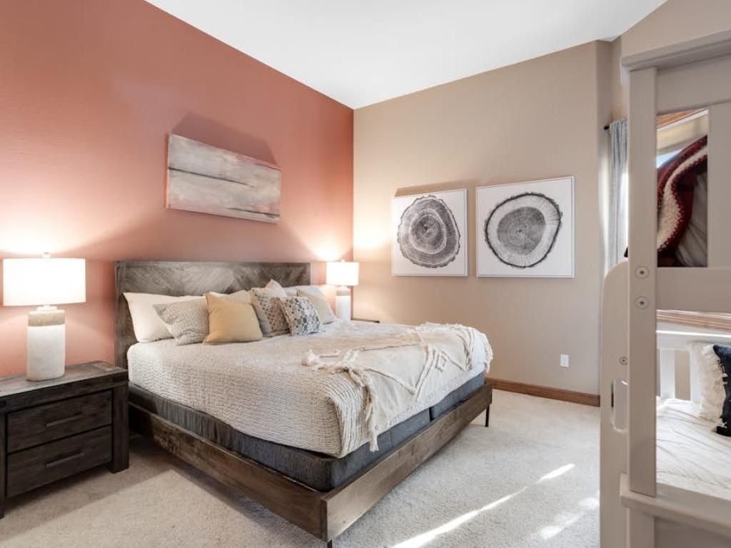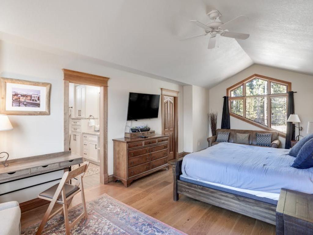 Occupying the upper level of the residence, the primary bedroom is furnished with a King bed, sitting area, and a private bathroom with a dual sink vanity, soaking tub, and walk-in shower. Off of the living room, the main level guest bedroom is outfitted with a Queen bed, gas fireplace, and accesses the half bathroom in the entryway. Three guest bedrooms on the lower level share a full bathroom with the family room. Two of the lower level bedrooms are equipped with Queen beds while the third has a Queen bed and a Twin Bunk bed.