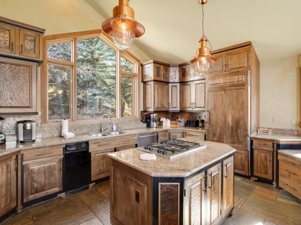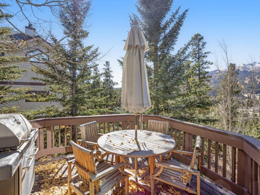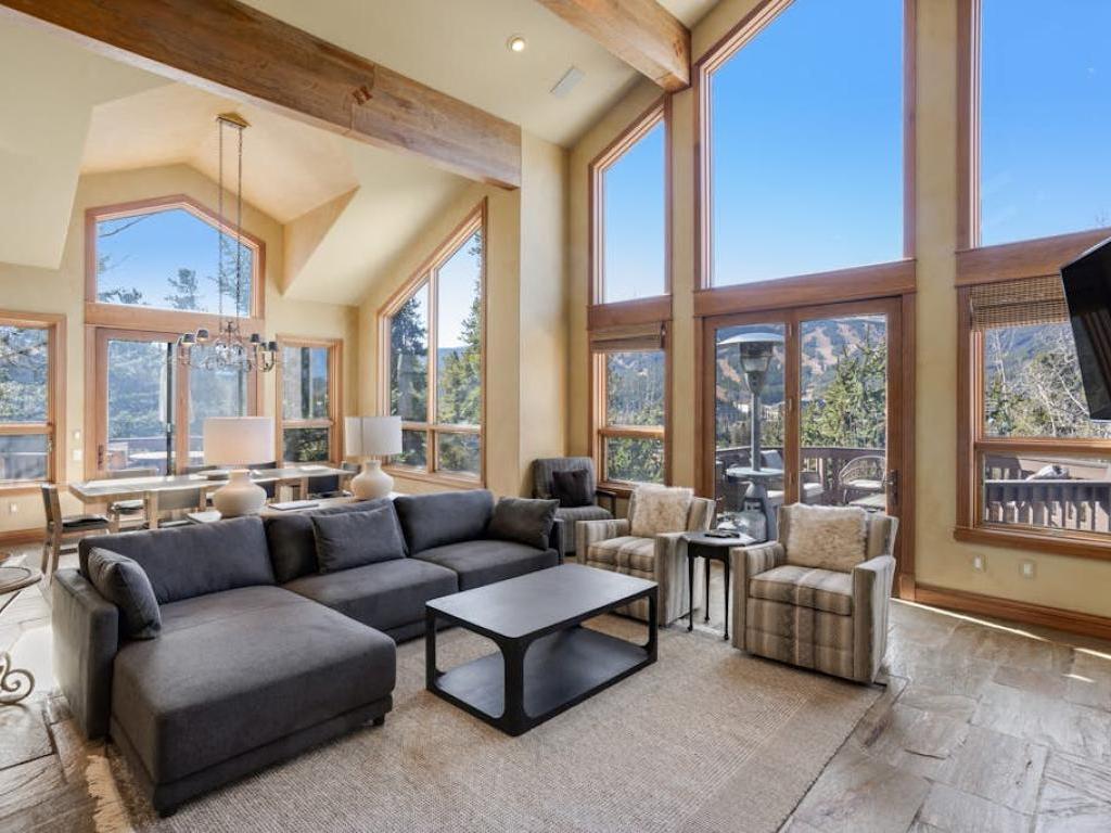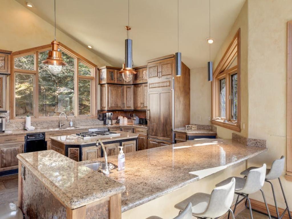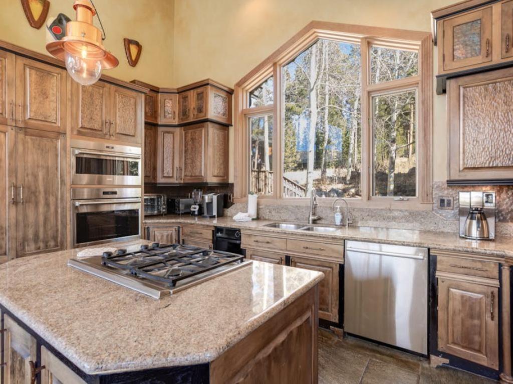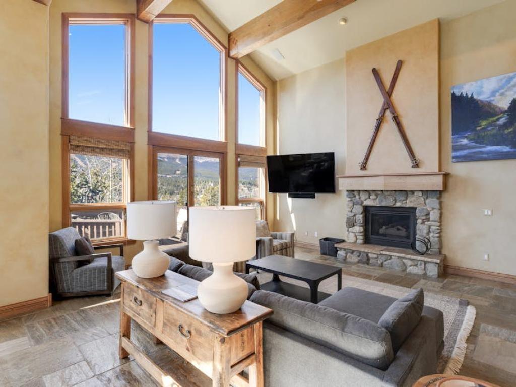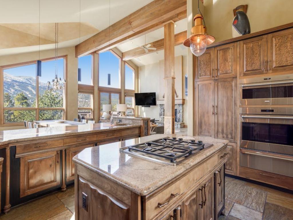 Soaring vaulted ceilings with exposed beam accents creates an open atmosphere in the great room with a massive wall of windows that allows the ski resort views to pour right into the living space. Comfortable furnishings are centered on a gas fireplace and flatscreen television in the living room which includes access to a large deck overlooking the mountains. Just off of the living room is a dining area and adjacent gourmet kitchen equipped with upscale appliances, granite countertops, and a breakfast bar, as well as access to another deck that has outdoor furnishings and a barbecue grill.
