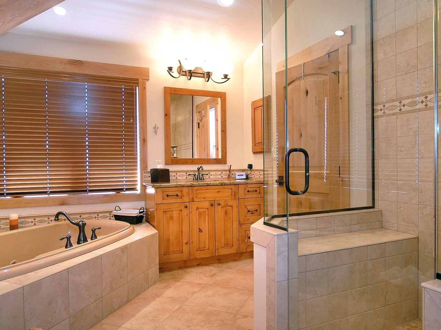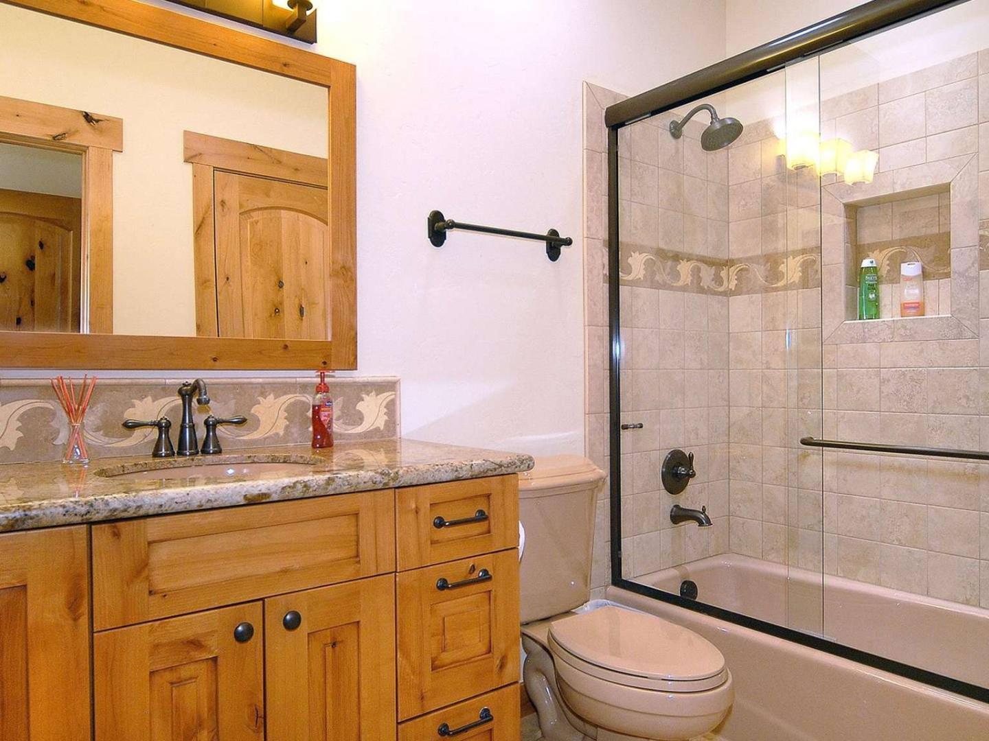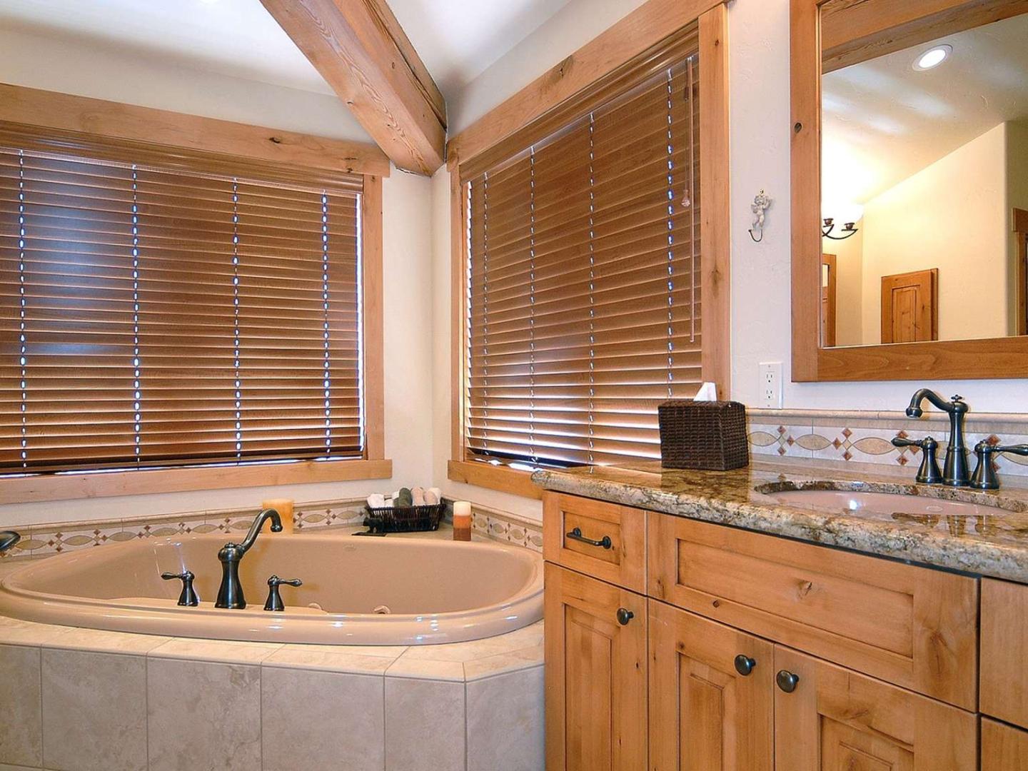 Perched on the upper level, the primary bedroom has vaulted ceilings, a King bed, private deck and private bathroom with dual vanities, a jetted tub and walk-in shower. Furnished with a King bed, the upper level guest bedroom includes a private deck and private bathroom with combination shower/tub. Two lower level guest bedrooms share a full bathroom, both are appointed with Queen beds.