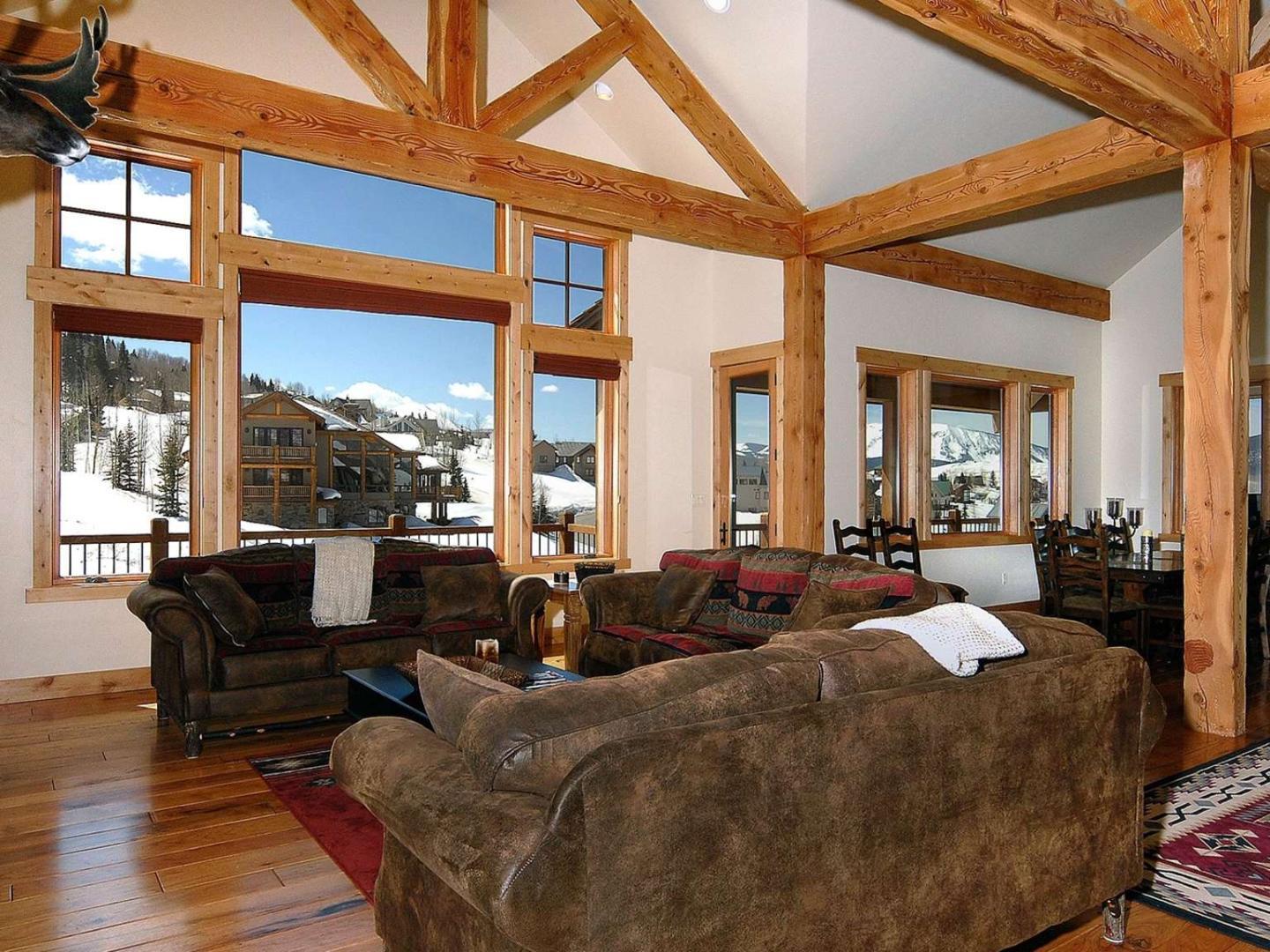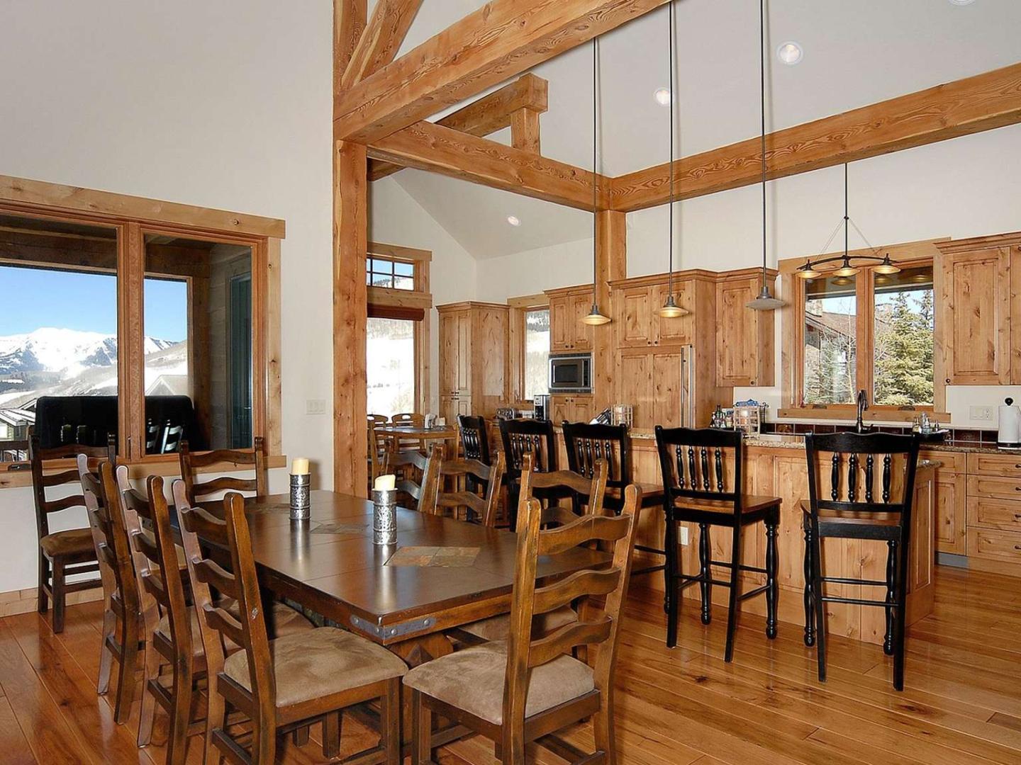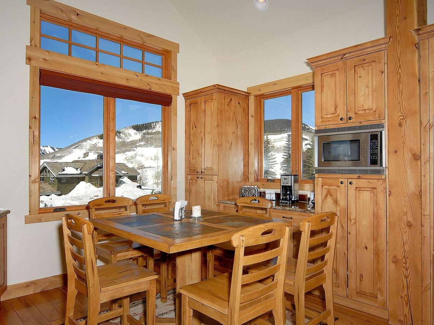 Set under vaulted ceilings with exposed trusses and framed by a window-wall showcasing inspiring mountain views, the living room of this 4 bedroom, 4.5 bathroom private residence features leather furnishings focused on a wood-burning fireplace. Seating for ten guests is provided at the adjacent dining table with five guests accommodated at the breakfast bar. High-end appliances, granite countertops and custom cabinetry appoint the gourmet kitchen which includes a breakfast nook equipped with another dining table seating 6 guests.