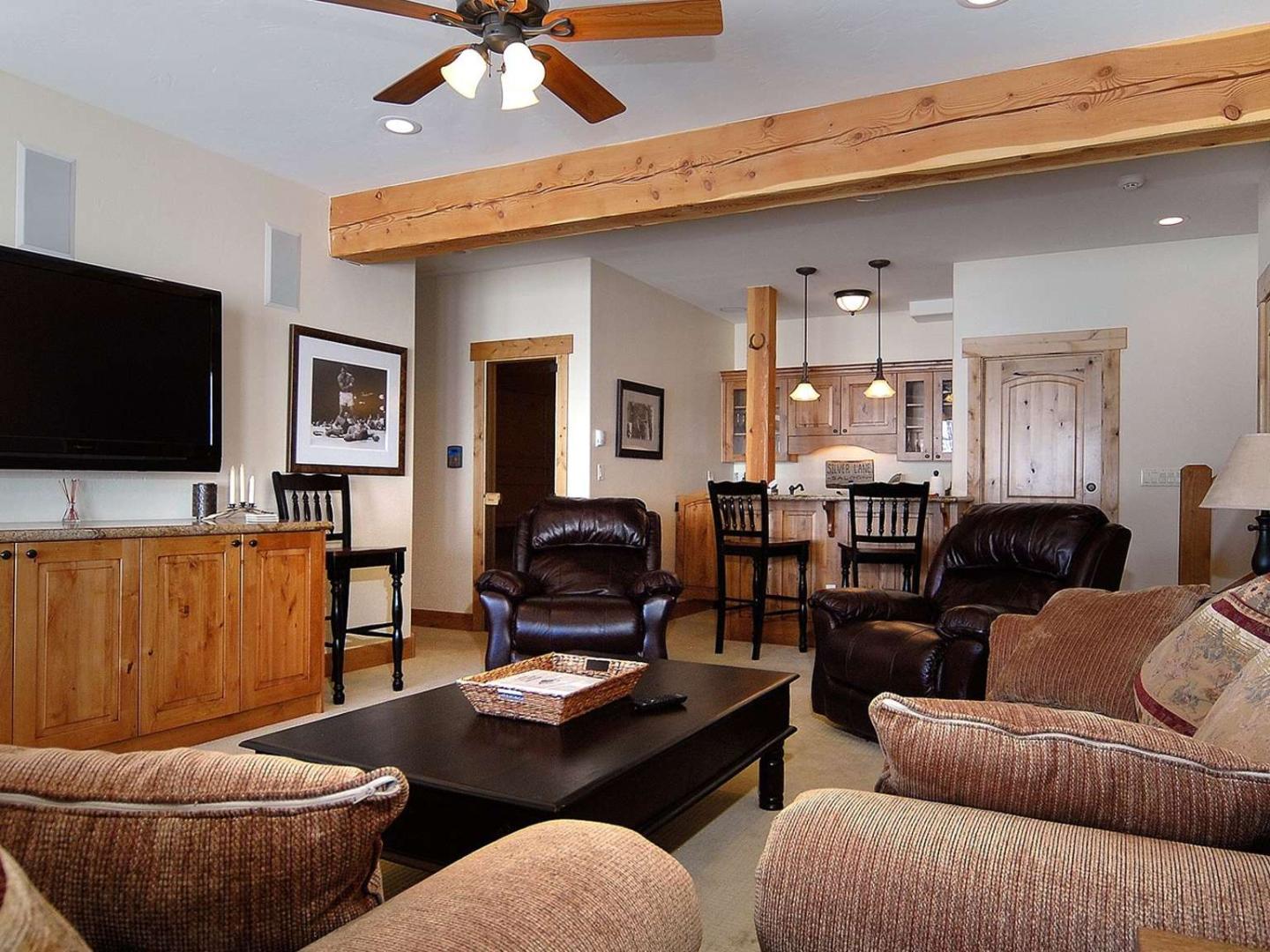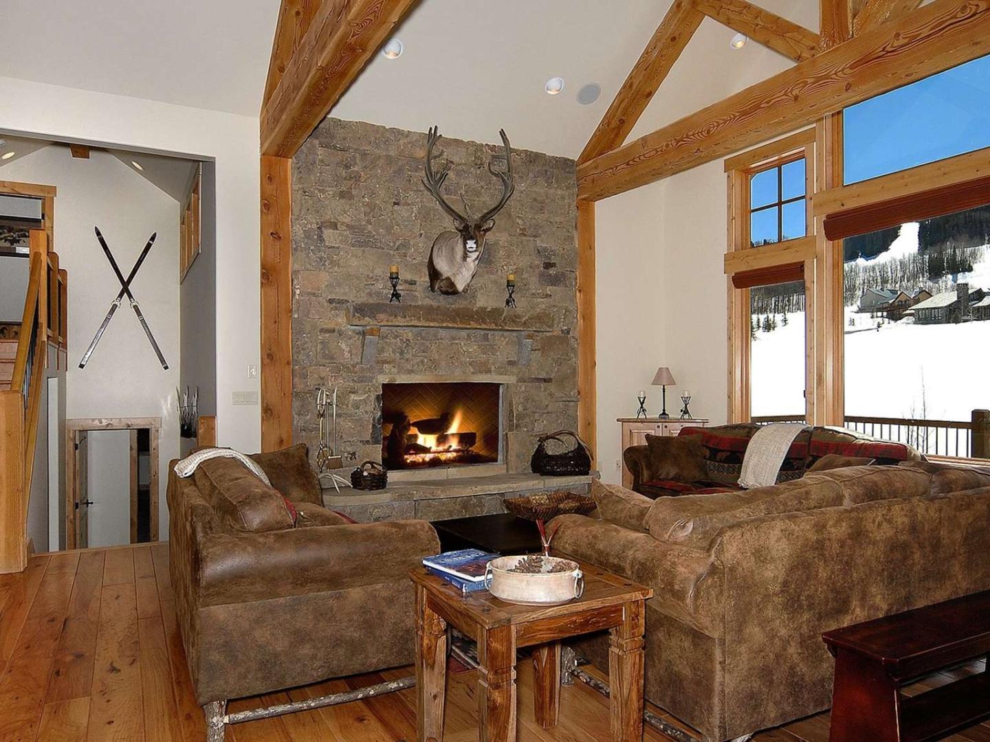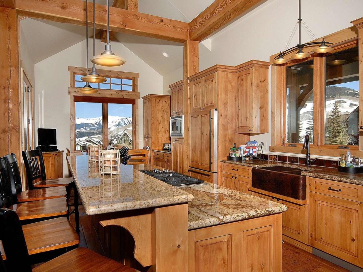 Set under vaulted ceilings with exposed trusses and framed by a window-wall showcasing inspiring mountain views, the living room of this 4 bedroom, 4.5 bathroom private residence features leather furnishings focused on a wood-burning fireplace. Seating for ten guests is provided at the adjacent dining table with five guests accommodated at the breakfast bar. High-end appliances, granite countertops and custom cabinetry appoint the gourmet kitchen which includes a breakfast nook equipped with another dining table seating 6 guests.
