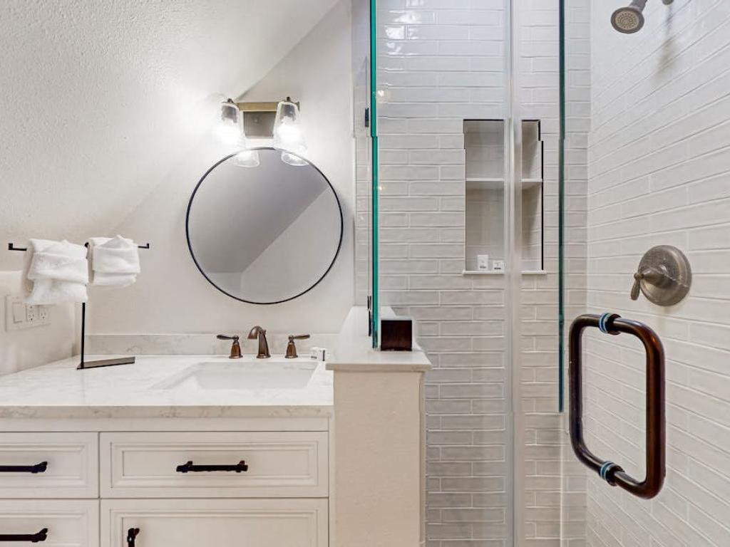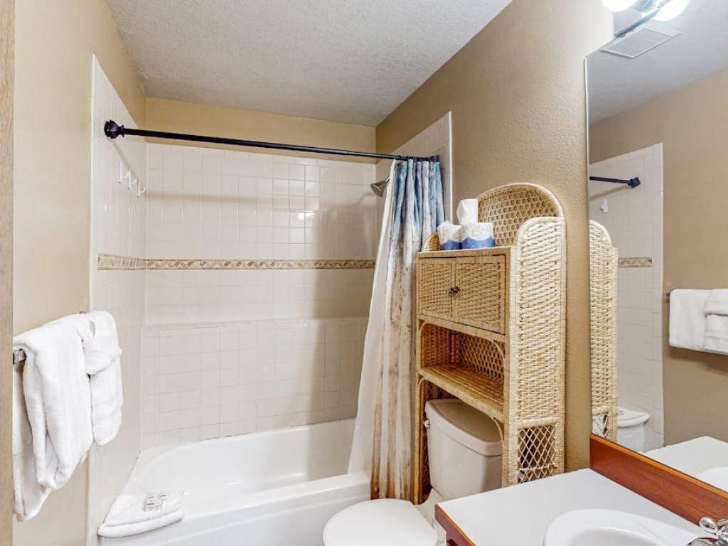 This four-story home sleeps eight guests between four bedrooms and a twin-size sleeper love seat in the living room. Sleep soundly in the primary suite, outfitted with a king bed and smart TV. The en-suite bathroom features a tub/shower combination, and a private balcony with a bistro table for two overlooks the treetops. The second suite is appointed with a queen-size bed. A sparkling walk-in shower rounds out the en-suite bathroom. Two additional guest rooms both have a queen-size bed and a smart TV. The adjacent bathroom is configured with a tub/shower combination.