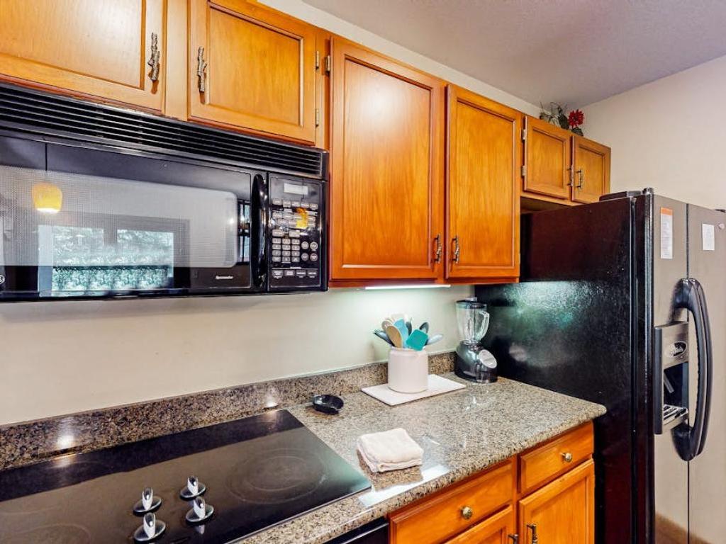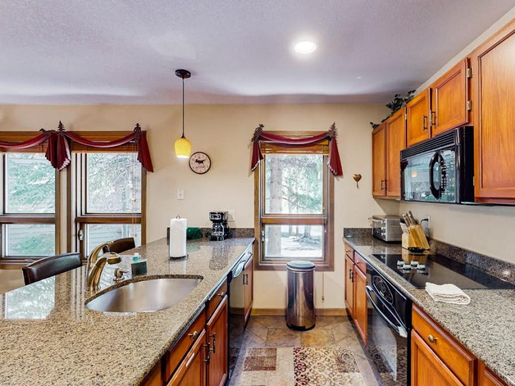 The light-filled living room is furnished with an array of plush seating, including a sleeper love seat. Kick back and enjoy a new film on the smart TV. Vaulted ceilings and a gas fireplace add to the appeal. The well-equipped kitchen features glossy granite countertops and a full suite of modern appliances – including a roomy side-by-side fridge. Three can share coffee at the kitchen bar. Serve home-cooked meals at a six-person dining table lit by an elegant chandelier.