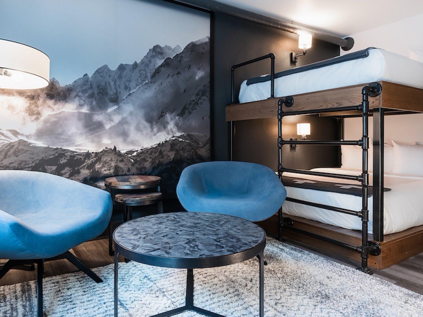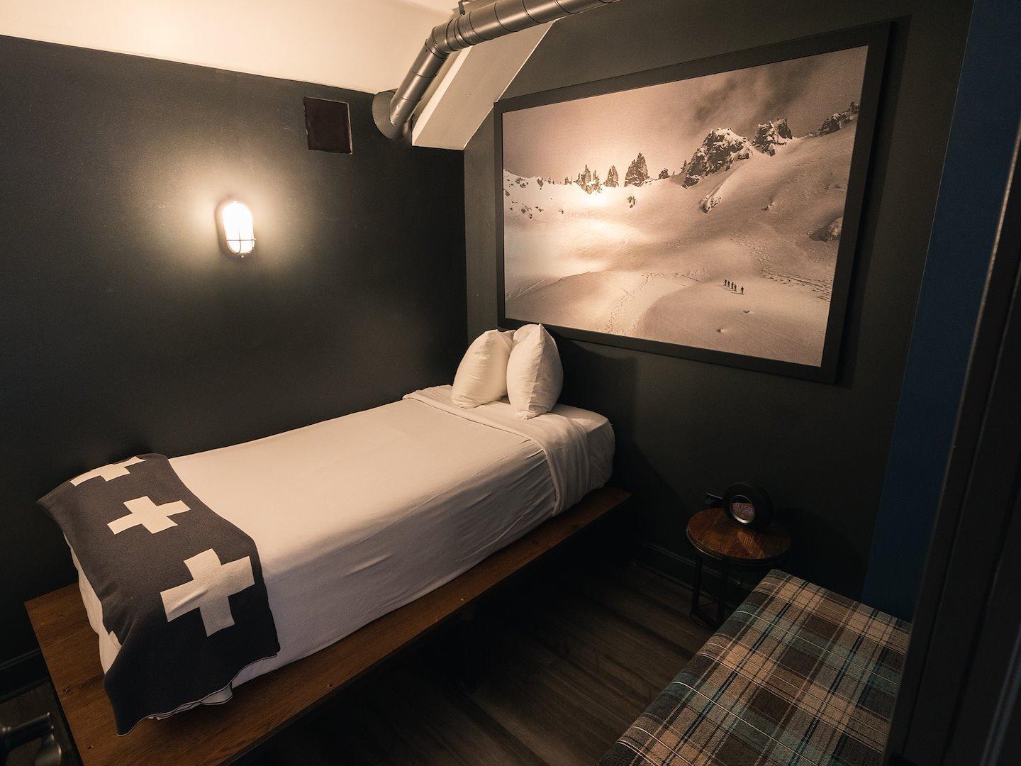 The Gnarnia | Bunk Haus: Two stalwart, queen-sized steel bunk beds compliment a cozy lounge sitting area for two. Each bunk is complete with individual charging outlets and lighting.