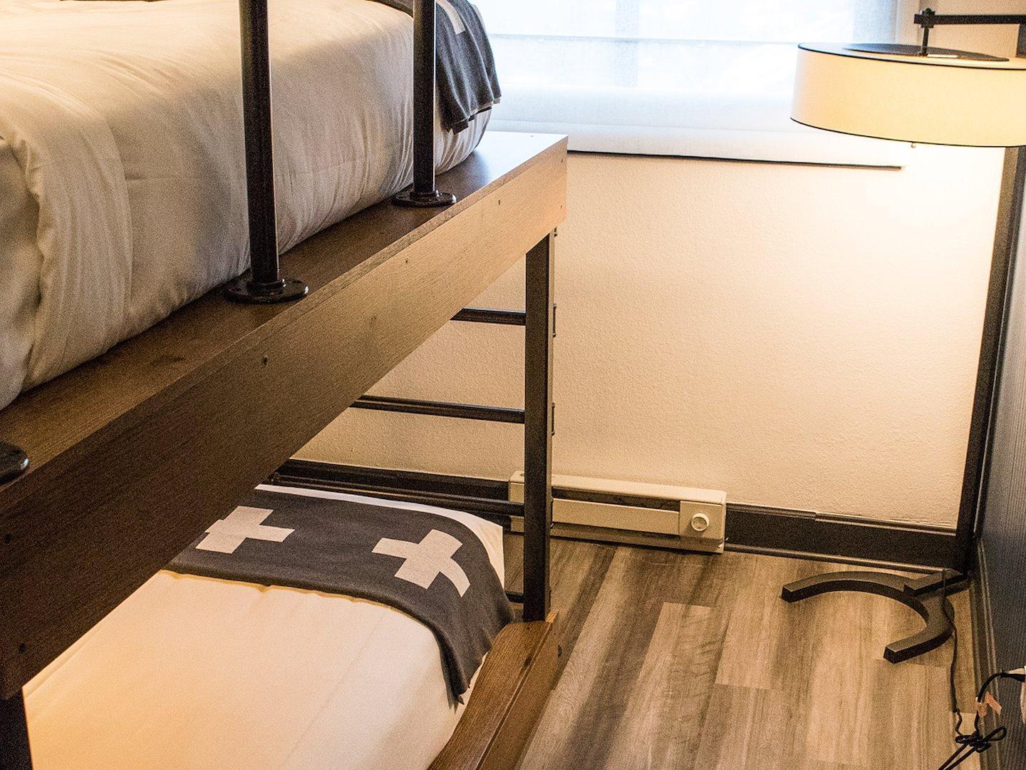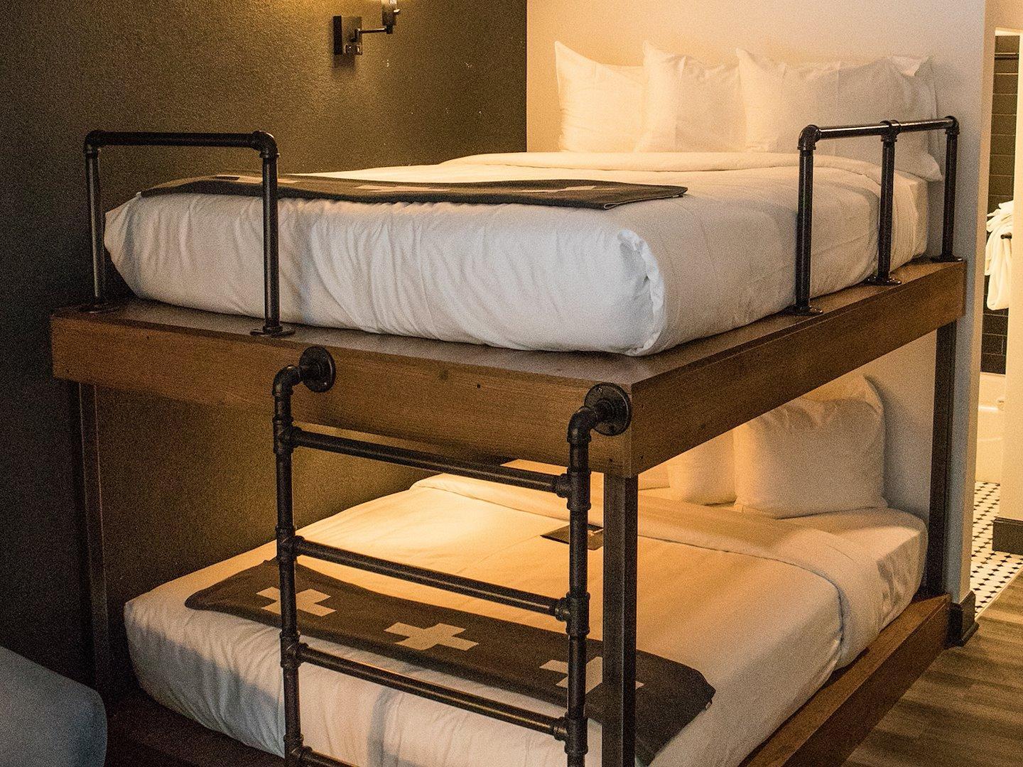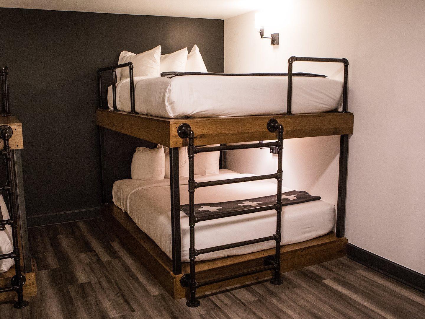 The Crashpad | Bunk Haus Suite: Two stalwart, queen-sized steel bunk beds adjacent to a separate comfy lounge with a queen sleeper sofa. Each bunk is complete with individual charging outlets and lighting.