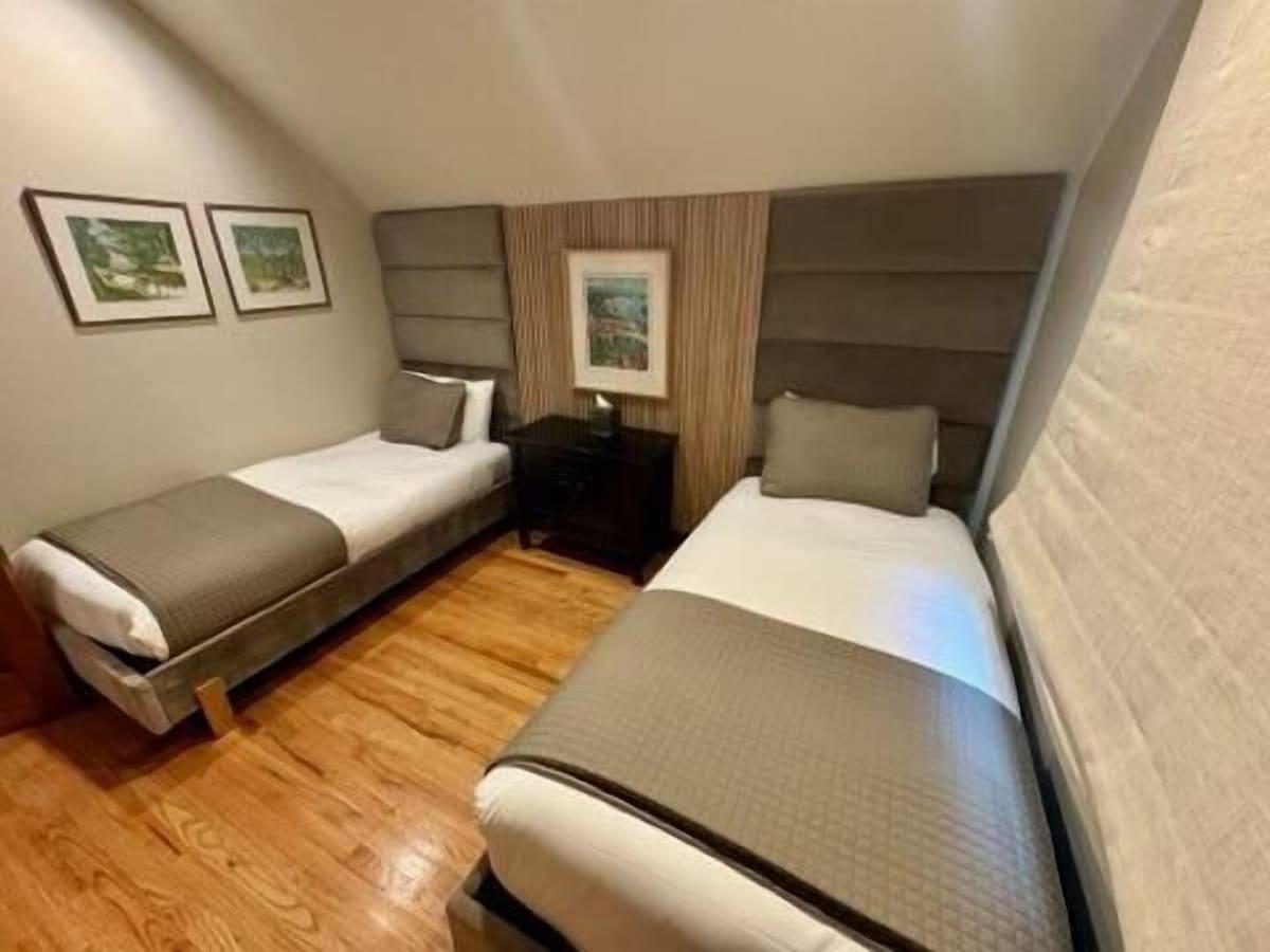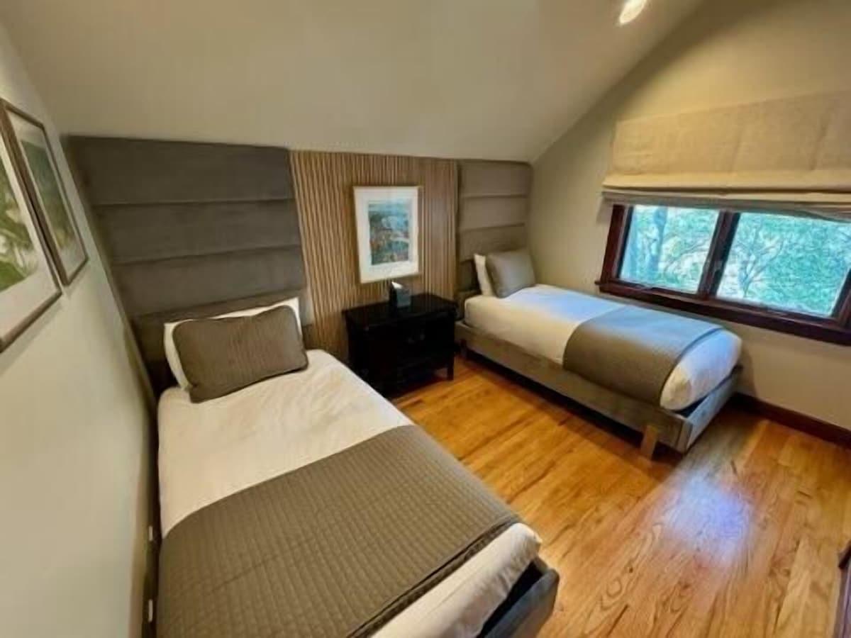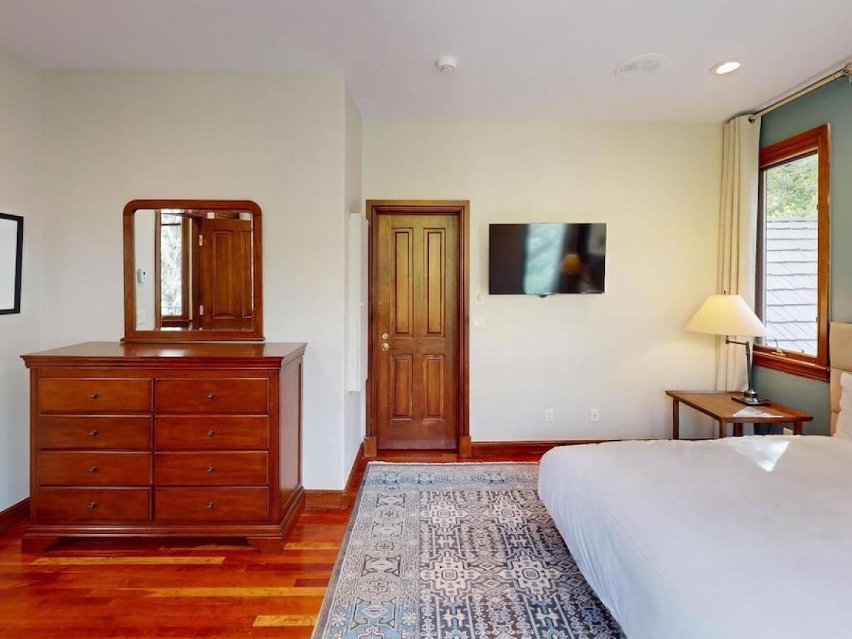 Appointed with a King bed, sofa, fireplace and private bathroom with a dual-sink vanity and combination shower/tub, the primary bedroom is located at the end of the extended hallway off of the kitchen. Located on the interior upper level of the main residence are five bedrooms, three include private bathrooms while two share a hallway bathroom. Bedding in these rooms include a King, Queen, Two Twins, and one with a Queen sharing a bathroom with a bedroom furnished with Two Twin beds.