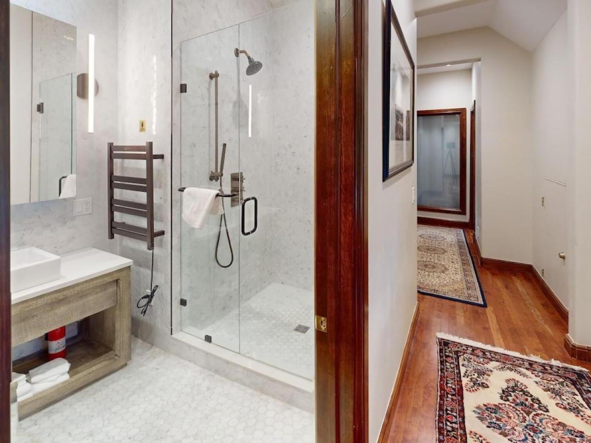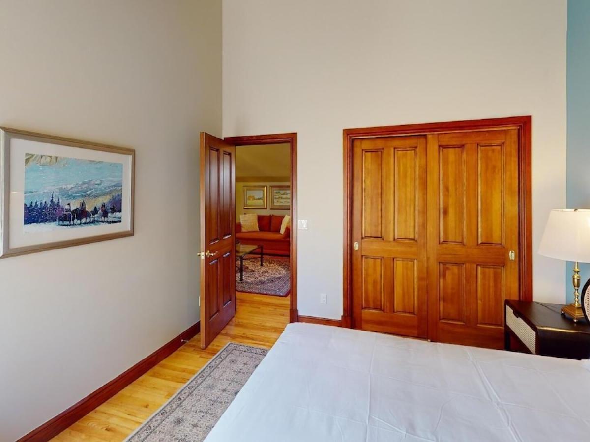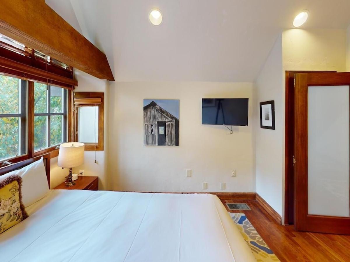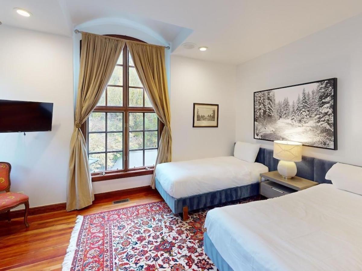 Appointed with a King bed, sofa, fireplace and private bathroom with a dual-sink vanity and combination shower/tub, the primary bedroom is located at the end of the extended hallway off of the kitchen. Located on the interior upper level of the main residence are five bedrooms, three include private bathrooms while two share a hallway bathroom. Bedding in these rooms include a King, Queen, Two Twins, and one with a Queen sharing a bathroom with a bedroom furnished with Two Twin beds.