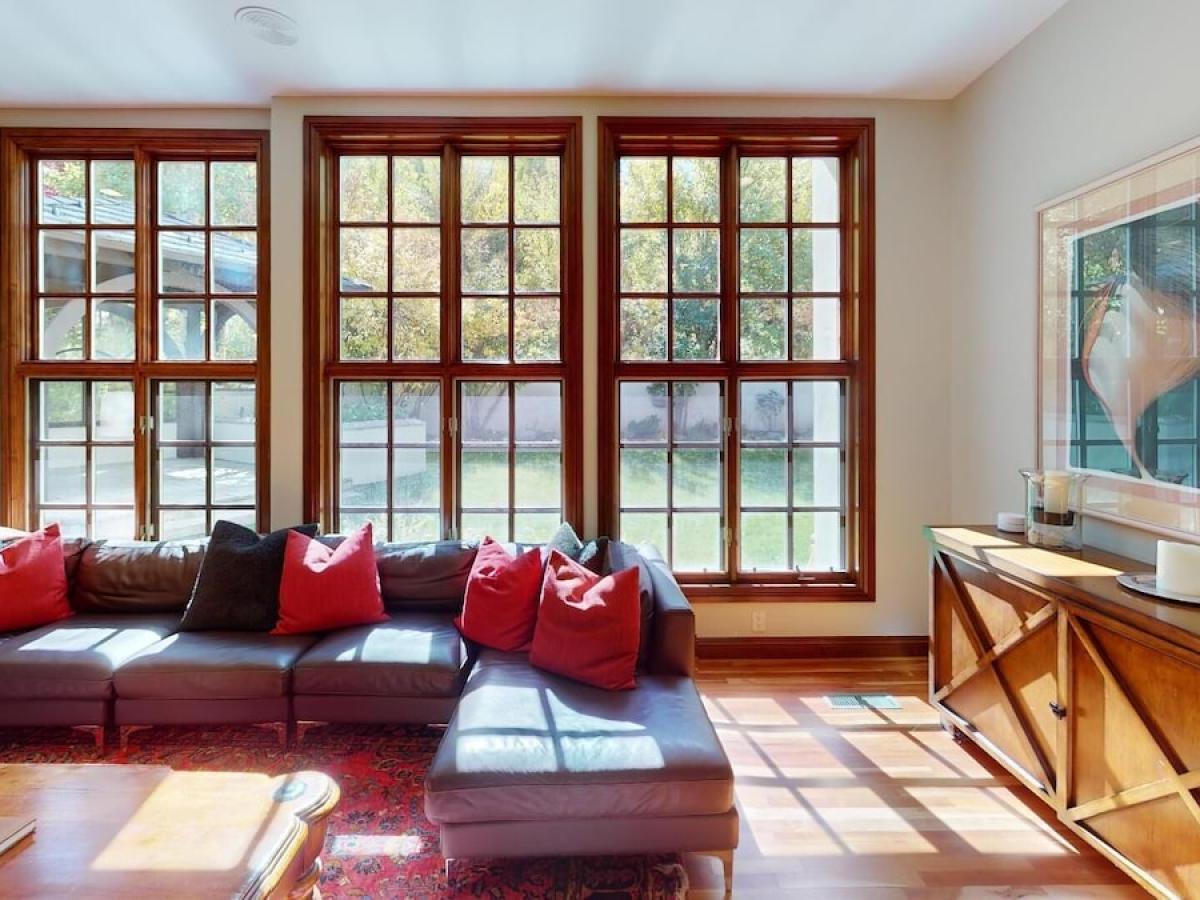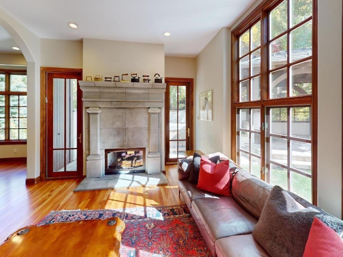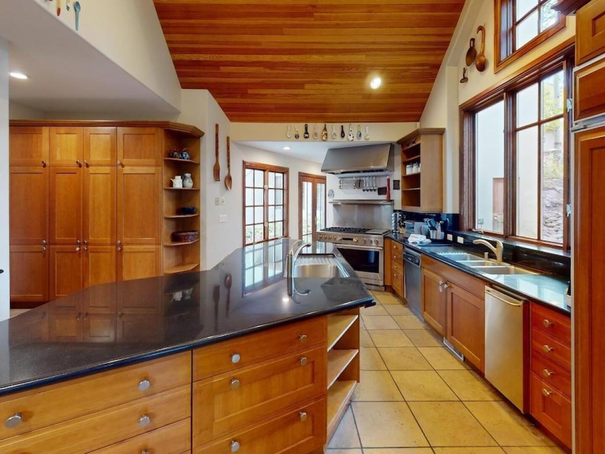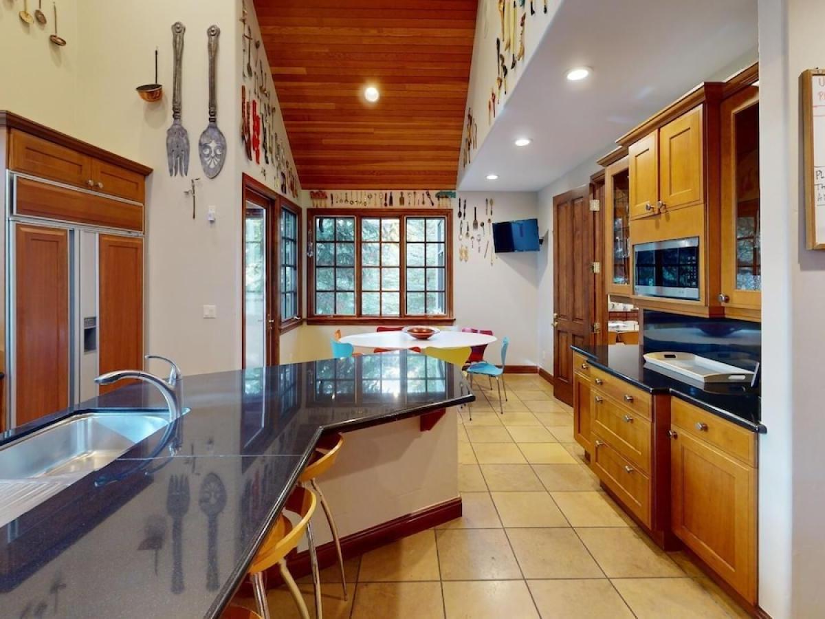 Gather in the cozy living room of this 9 bedroom, 9 and 2 half bathroom private residence offering comfortable furnishings arranged in front of a wood-burning fireplace. This space flows to the dining area accommodating up to 12 guests, adjacent sitting room and the kitchen. Fully equipped with all of the essential appliances for preparing tasty meals throughout your vacation, the kitchen includes an island with seating for 3 guests and breakfast nook seating 8 guests. Step out onto the back patio from the kitchen to grill up a meal on the barbecue.