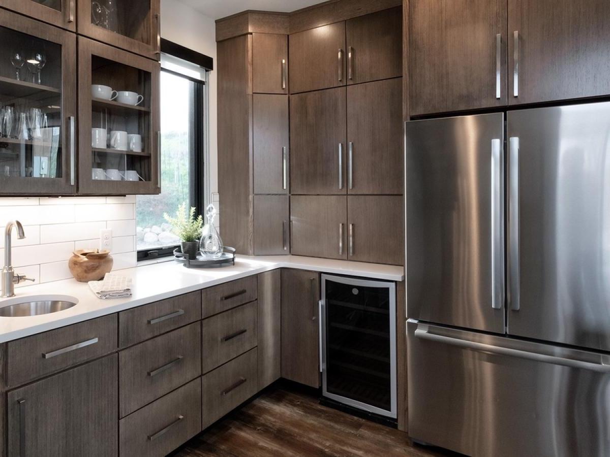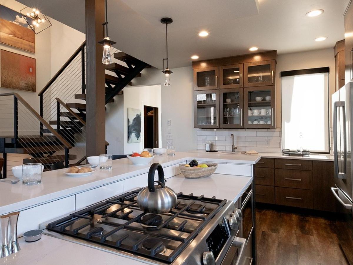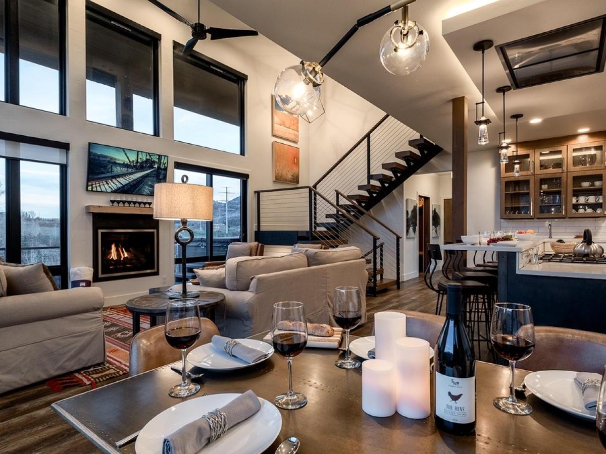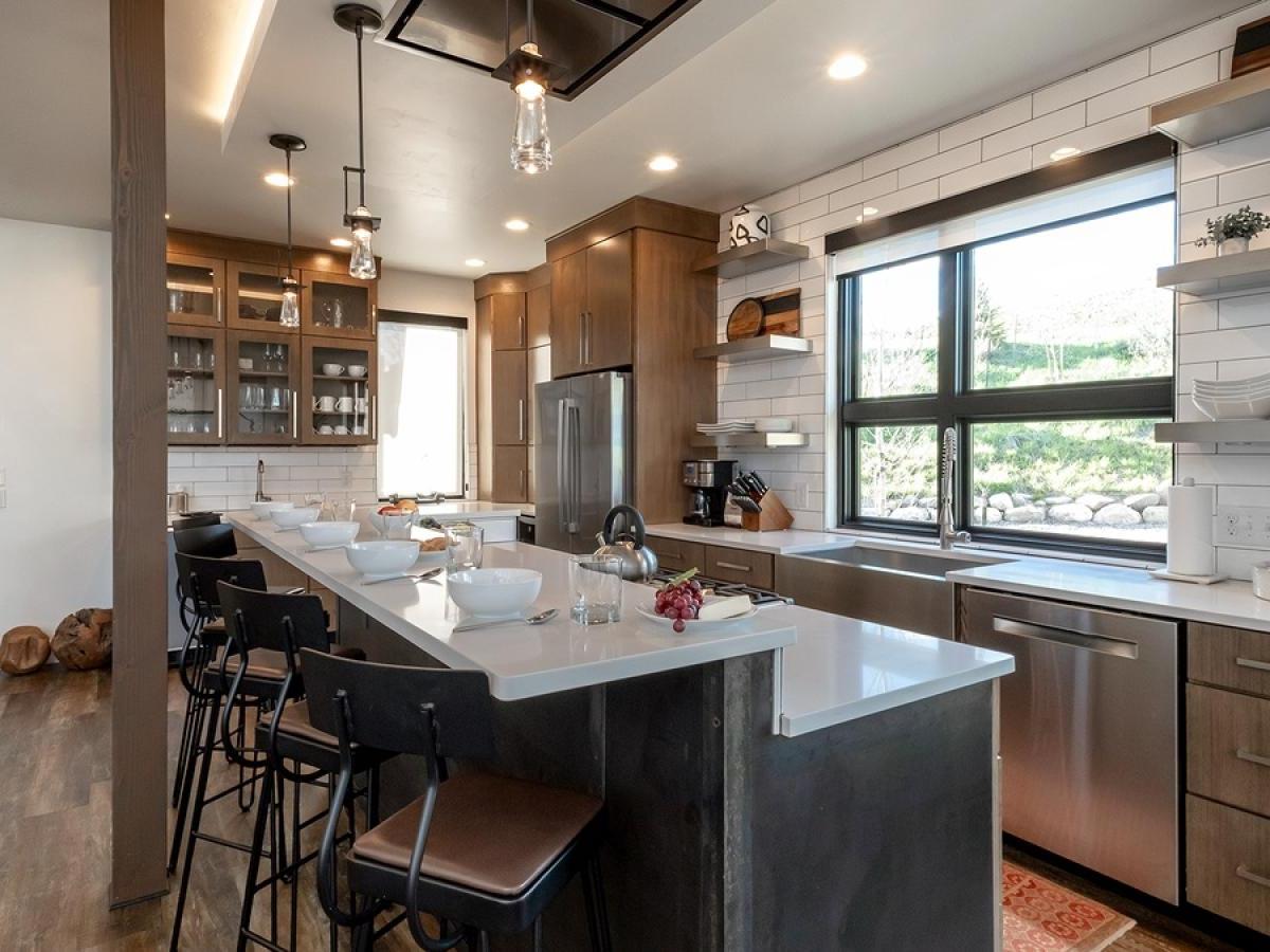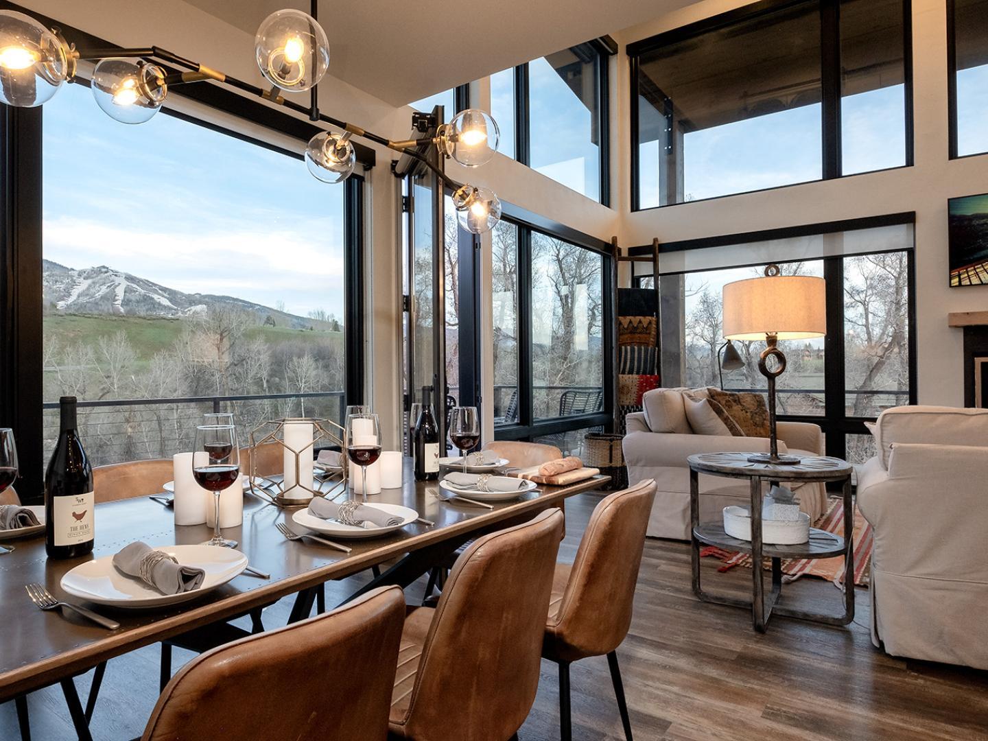 Breathtaking and inspiring views of the mountains and ski slopes form the backdrop in the expansive Great Room of this 4 bedroom, 3 bathroom mountain residence featuring cathedral ceilings above comfortable couches focused on a gas fireplace and wall-mounted television. Walls of windows open fully to the wrap-around deck offering outdoor seating with a firepit and private hot tub. High-end appliances and polished-stone countertops adorn the open kitchen with breakfast bar seating for five. Just off of the kitchen is a dining area accommodating 8 guests.