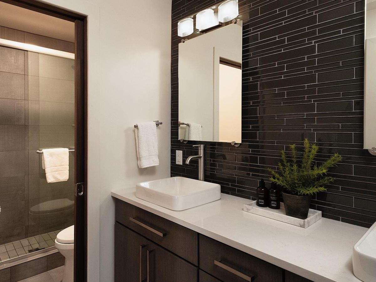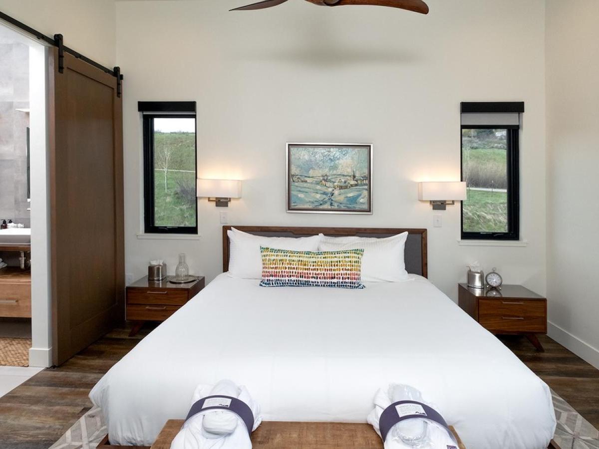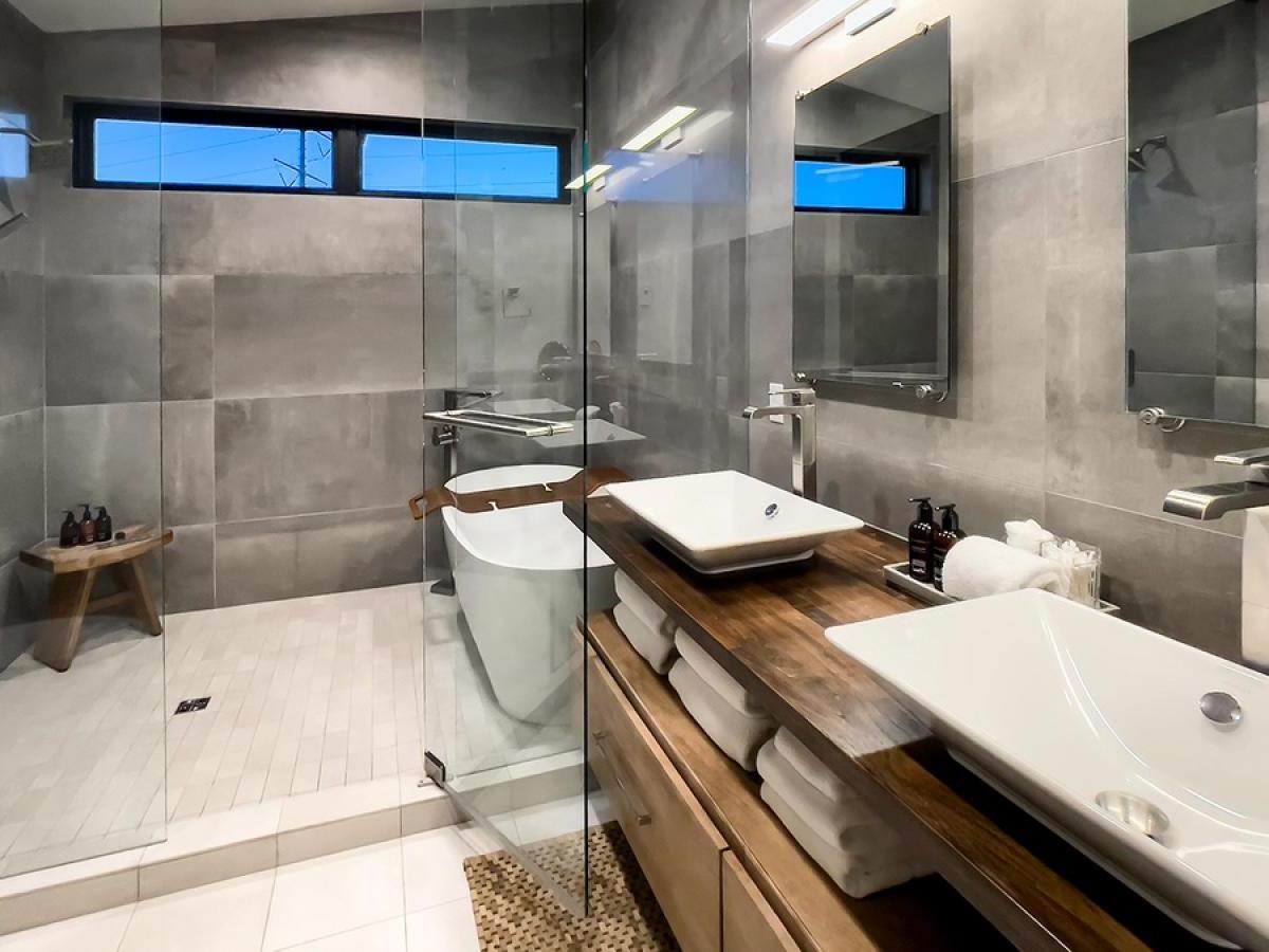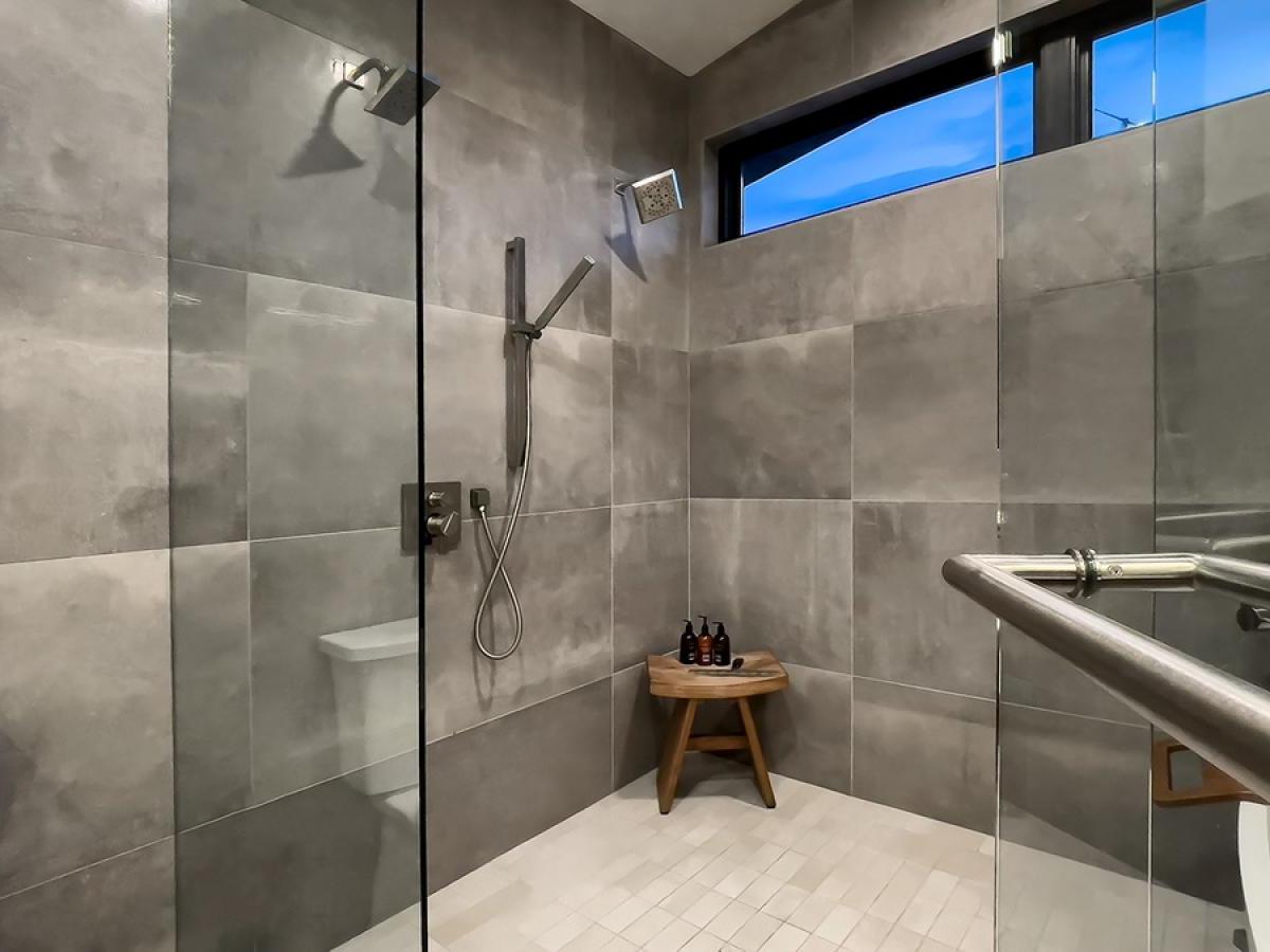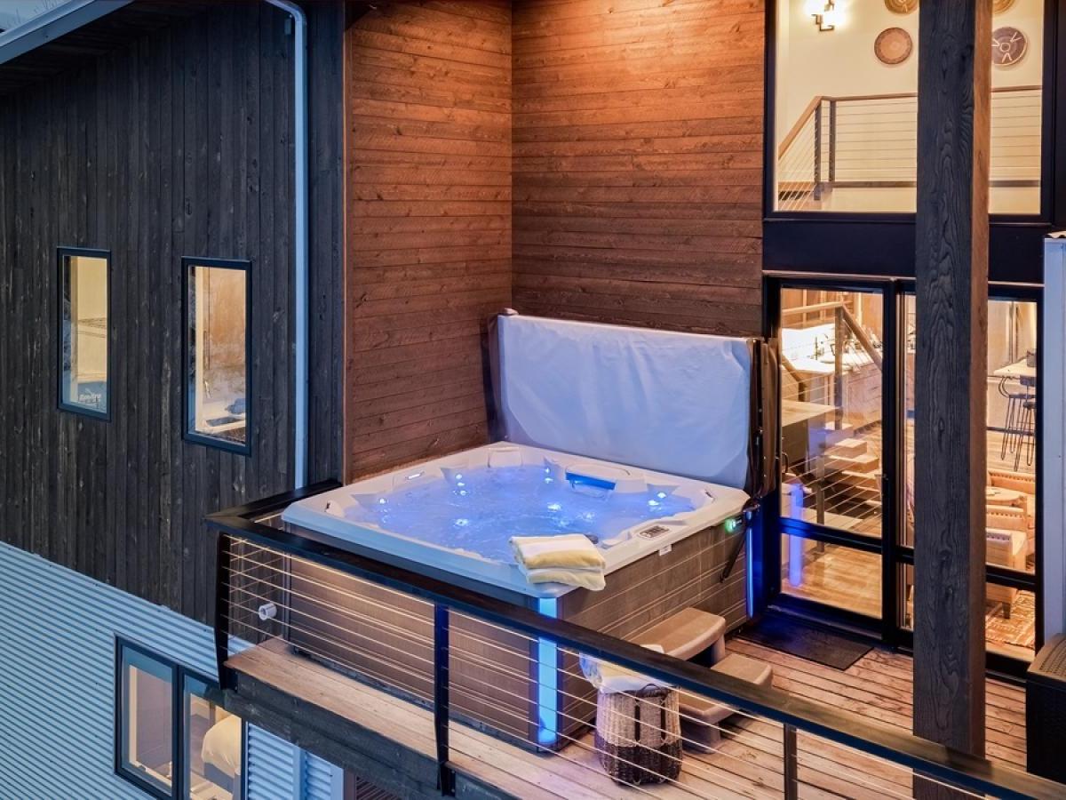 Accessed via a unique floating staircase, the upper level primary bedroom is appointed with a King bed and private bathroom with stylish dual-sink vanity and glass walk-in shower complete with a soaking tub. Furnished with a Queen bed, one of the lower level guest bedrooms share a a full bathroom with the family room. Two additional guest bedrooms on the lower level share a Jack and Jill bathroom, one offers a Double bed plus a Twin bed while the other is equipped with a Twin-over-Queen bunk bed..