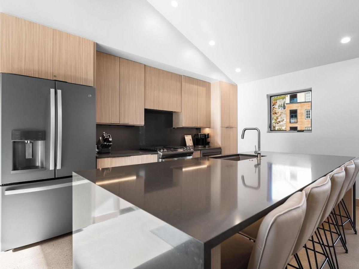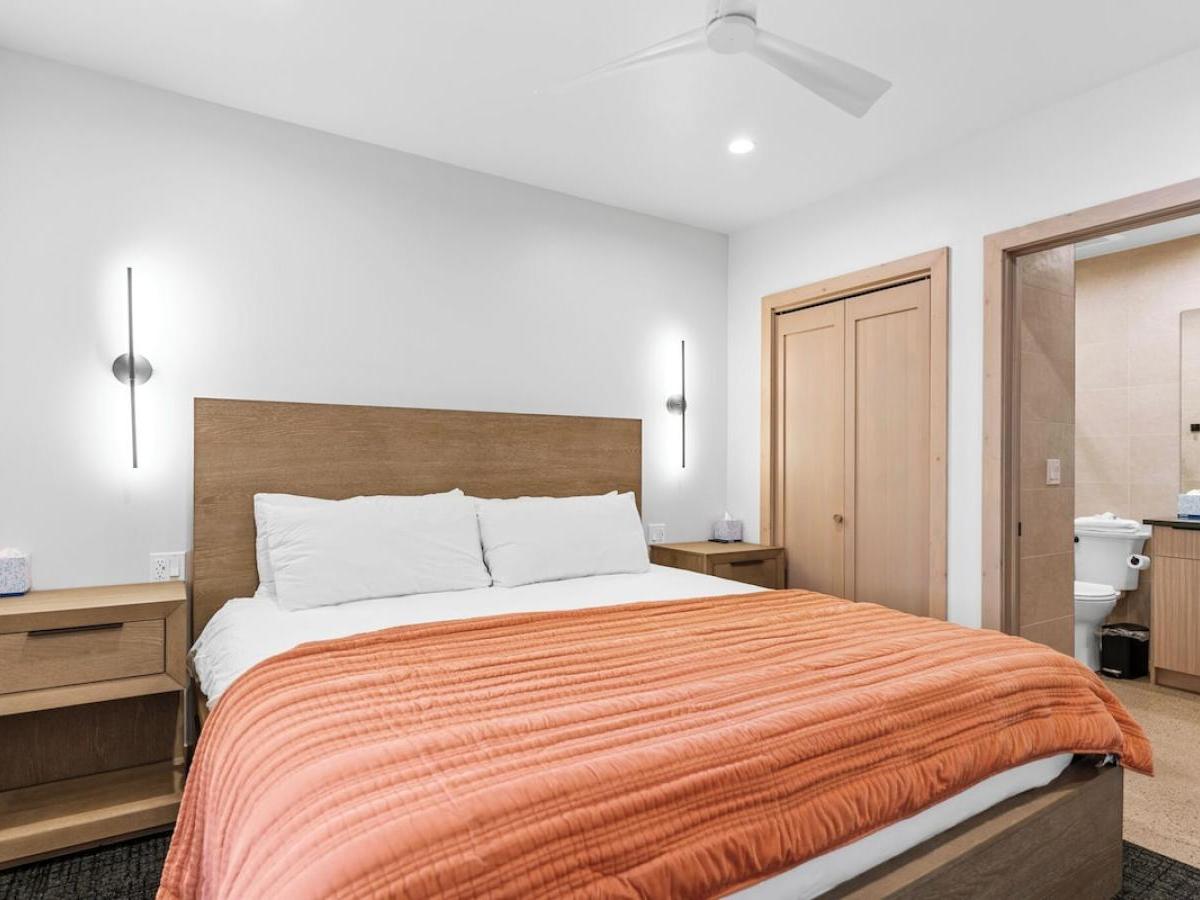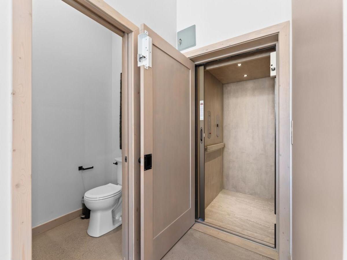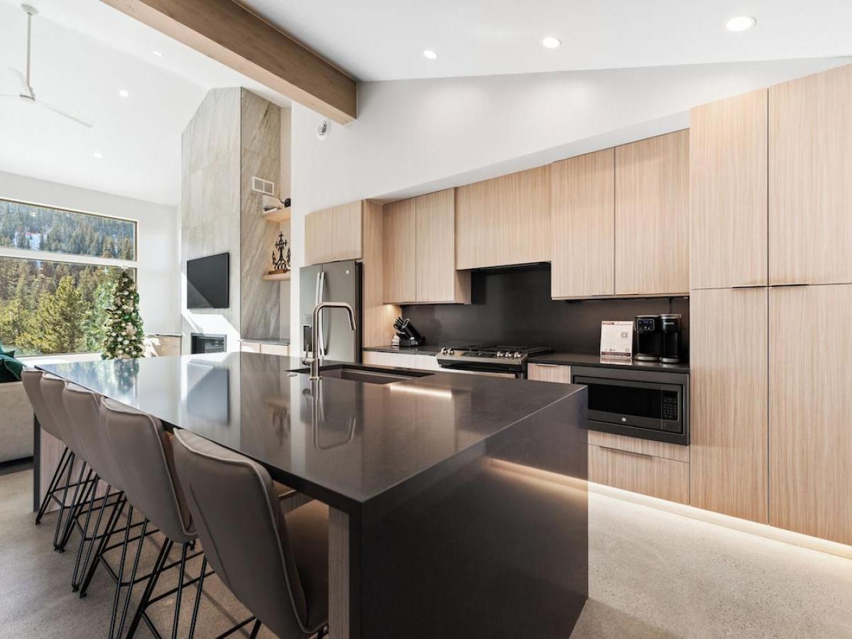 Spread over three levels, with a private elevator offering easy access, this 4-bedroom, 4.5-bathroom residence features an open-concept living area on the top floor, appointed with a wall-mounted television above a gas fireplace, with a queen-size sleeper sofa in front and a minibar with wine fridge to the side. Access to the upper-level balcony, outfitted with outdoor furnishings and a fire pit, is available through the living area. The adjacent full kitchen boasts stainless steel appliances and a breakfast bar with seating for five, along with a dining area seating ten.