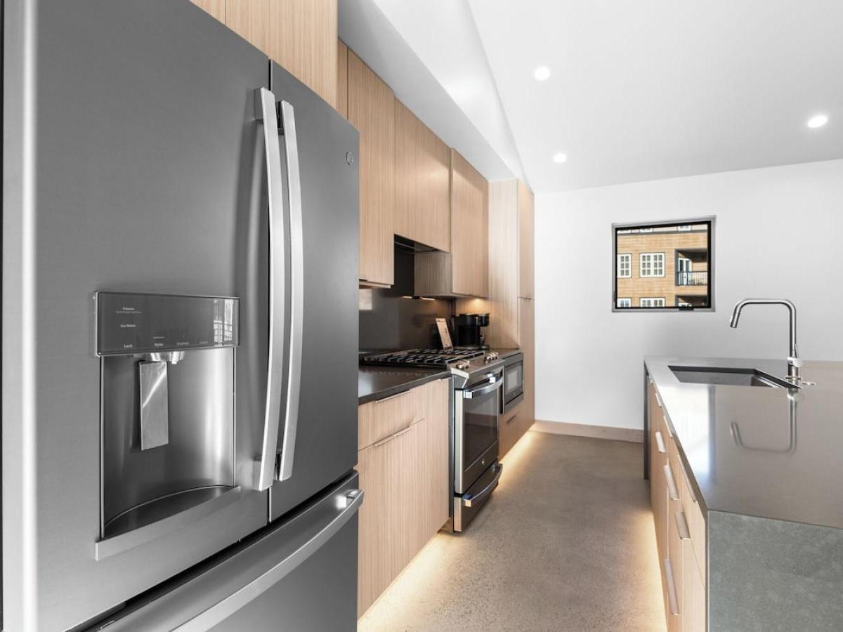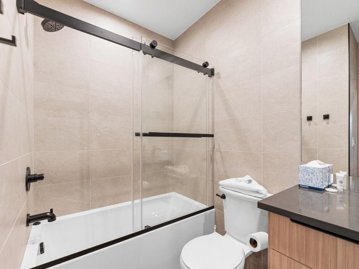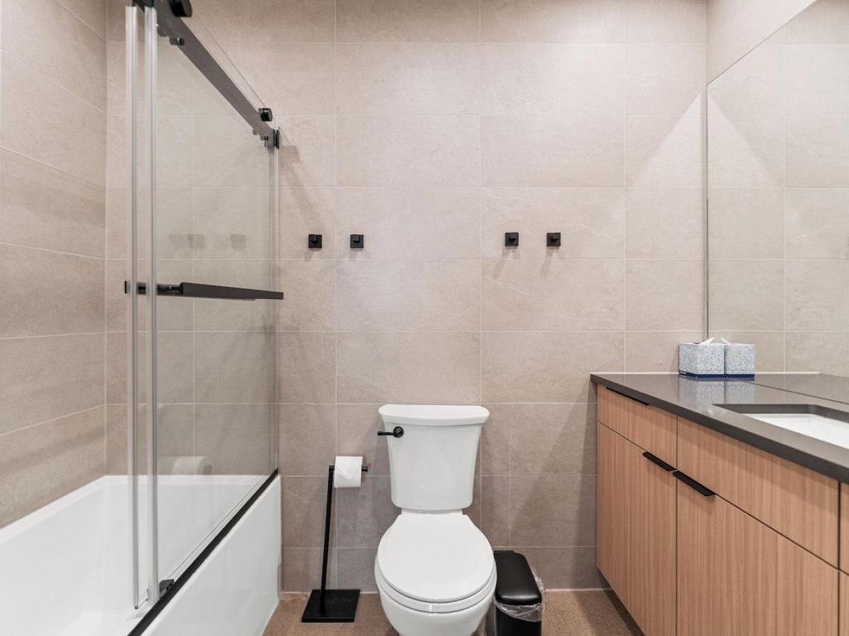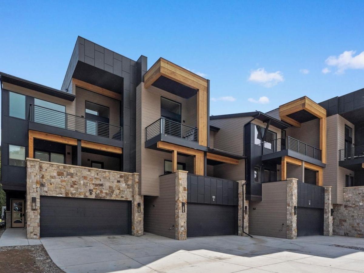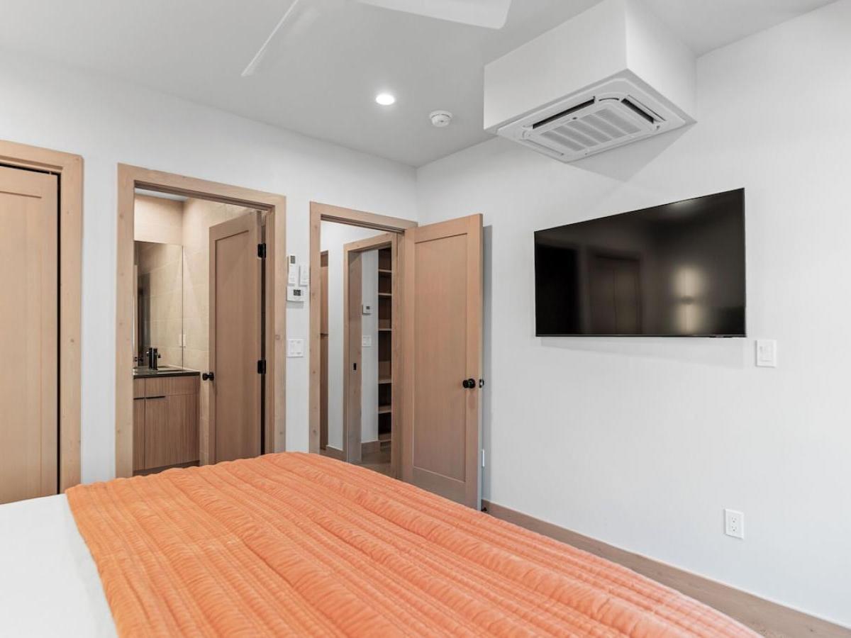 Spread over three levels, with a private elevator offering easy access, this 4-bedroom, 4.5-bathroom residence features an open-concept living area on the top floor, appointed with a wall-mounted television above a gas fireplace, with a queen-size sleeper sofa in front and a minibar with wine fridge to the side. Access to the upper-level balcony, outfitted with outdoor furnishings and a fire pit, is available through the living area. The adjacent full kitchen boasts stainless steel appliances and a breakfast bar with seating for five, along with a dining area seating ten.